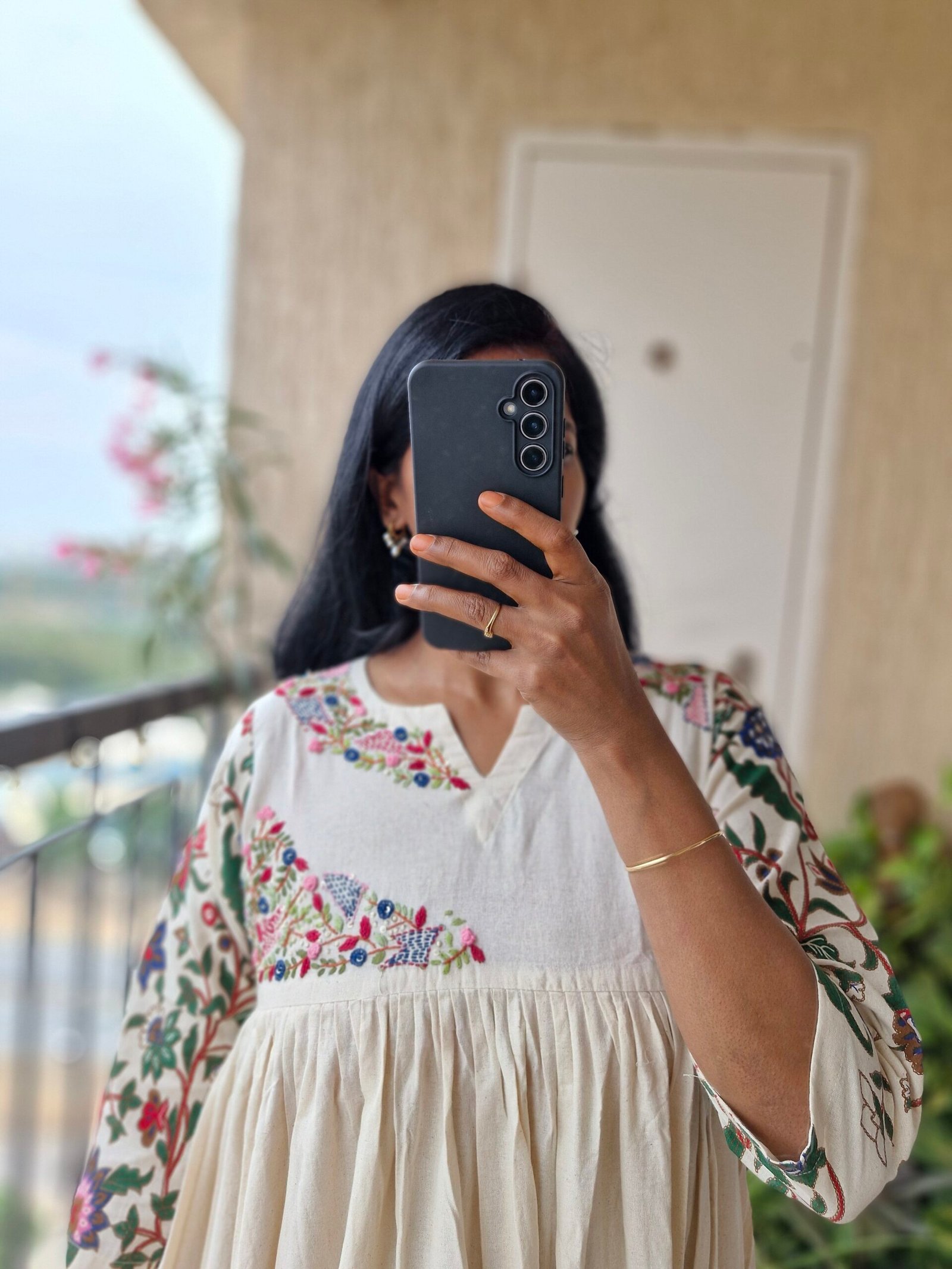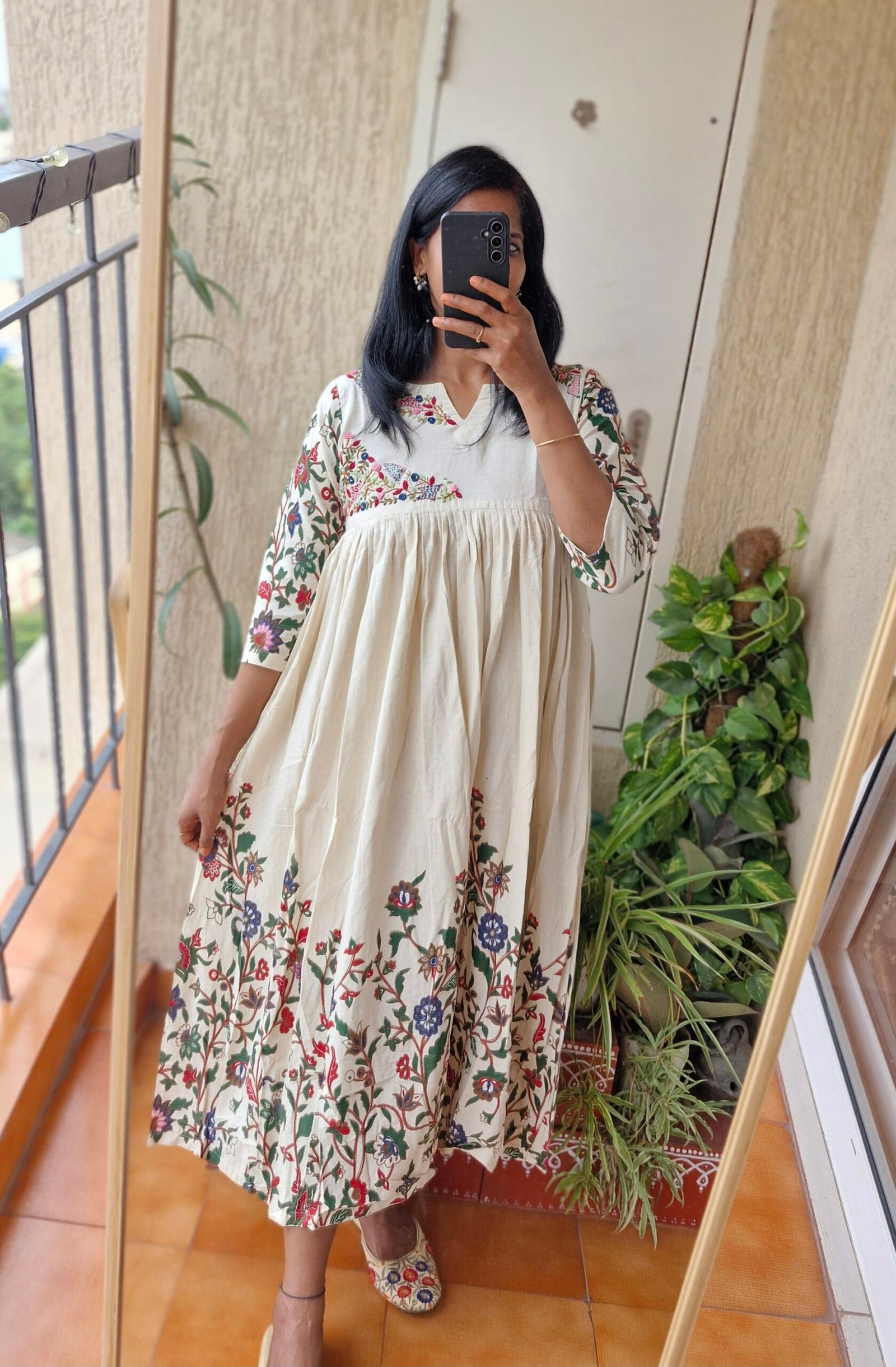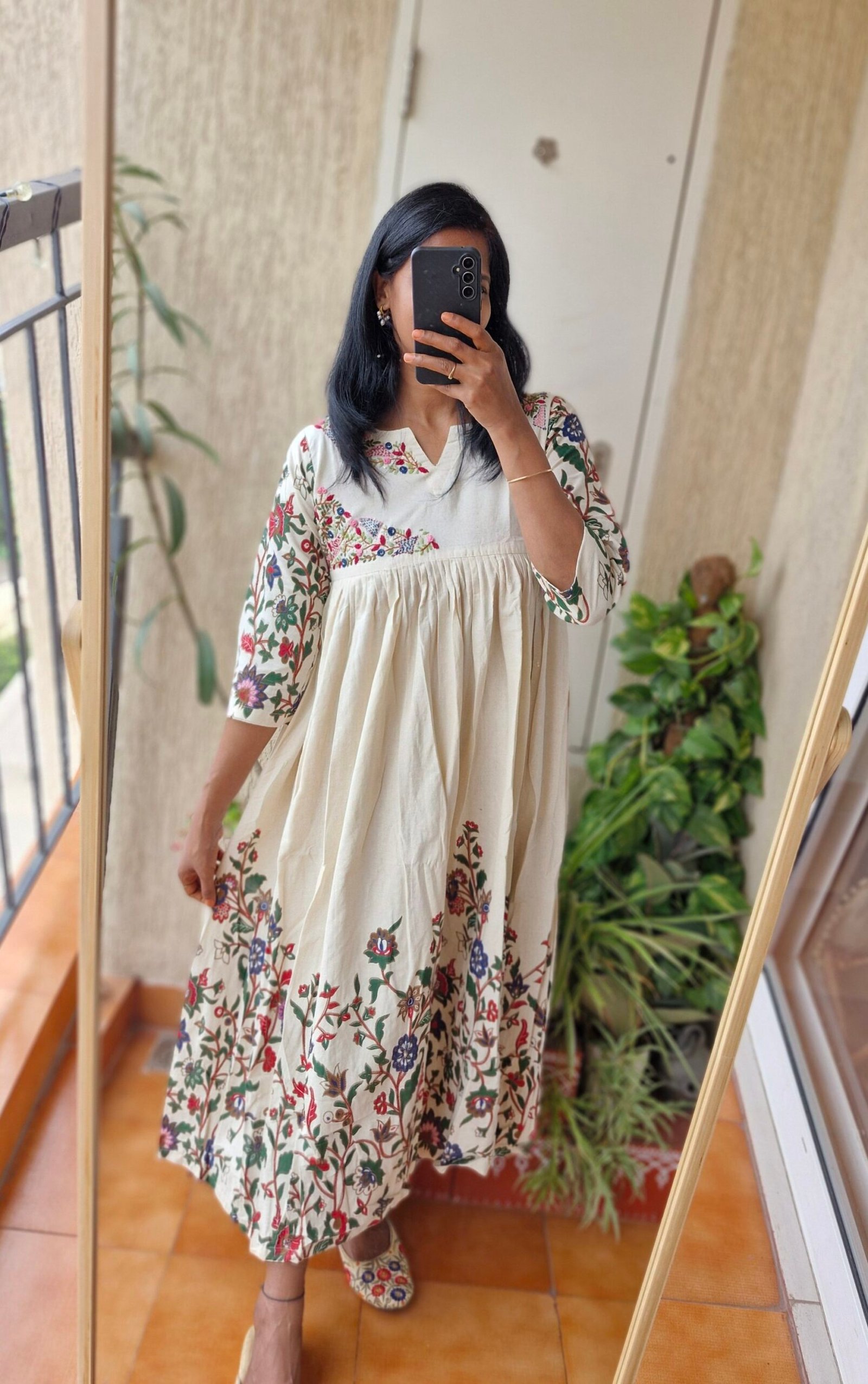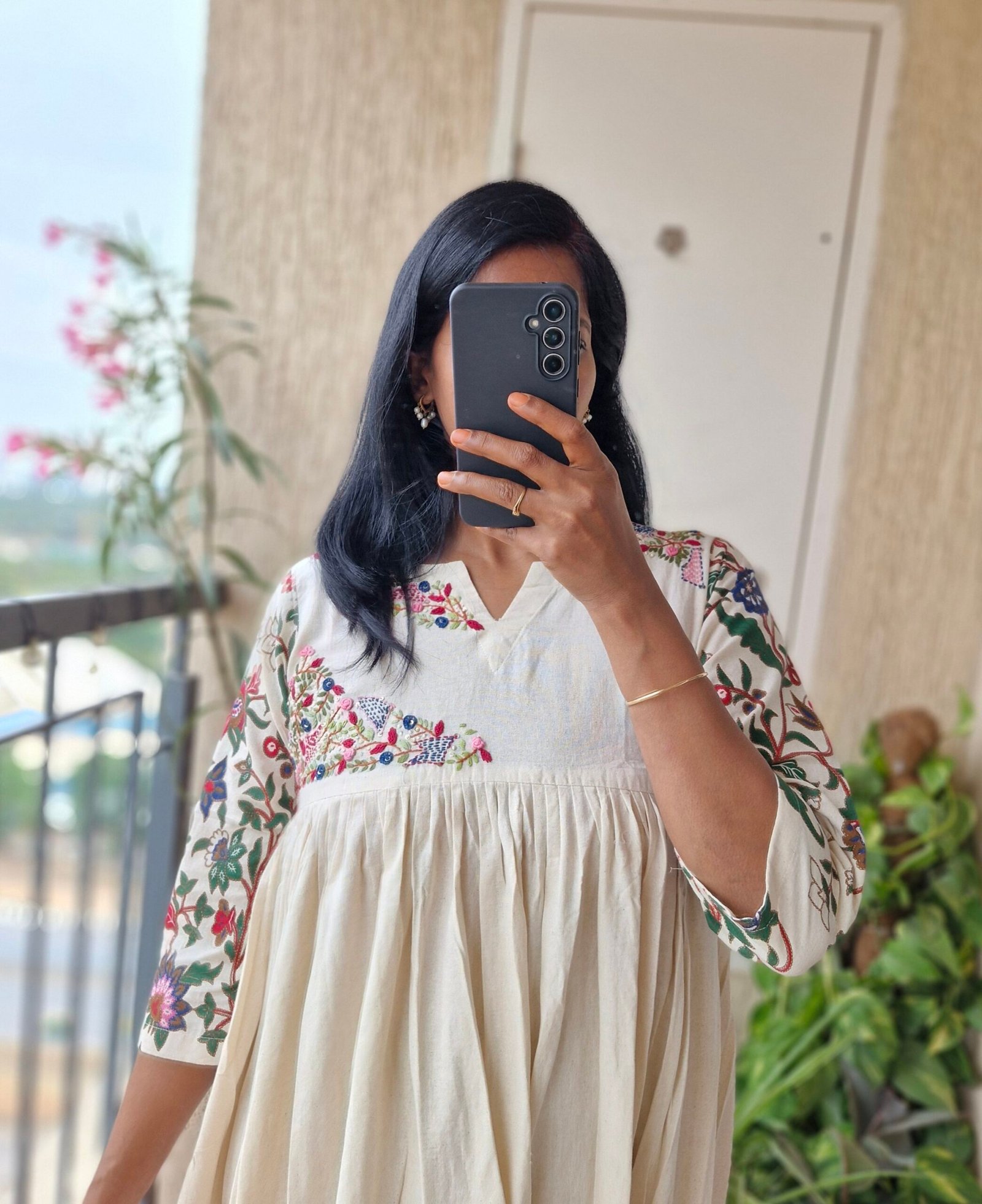 Beige Embriodery khadi cotton dress comes with a pleaated neckline.Length of the dress 47 inches and comes with a pocket.