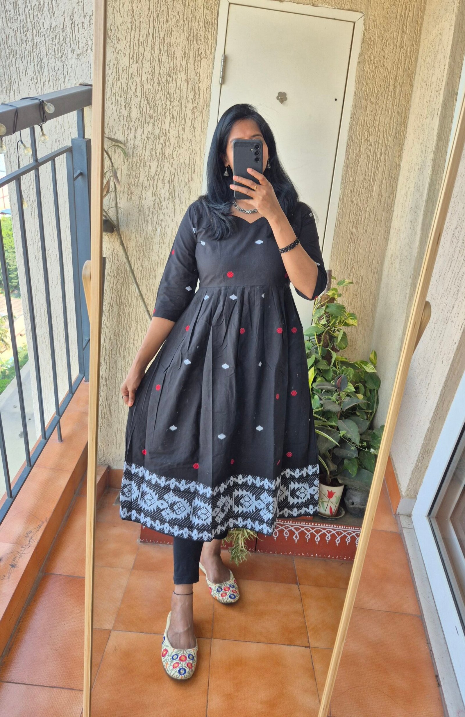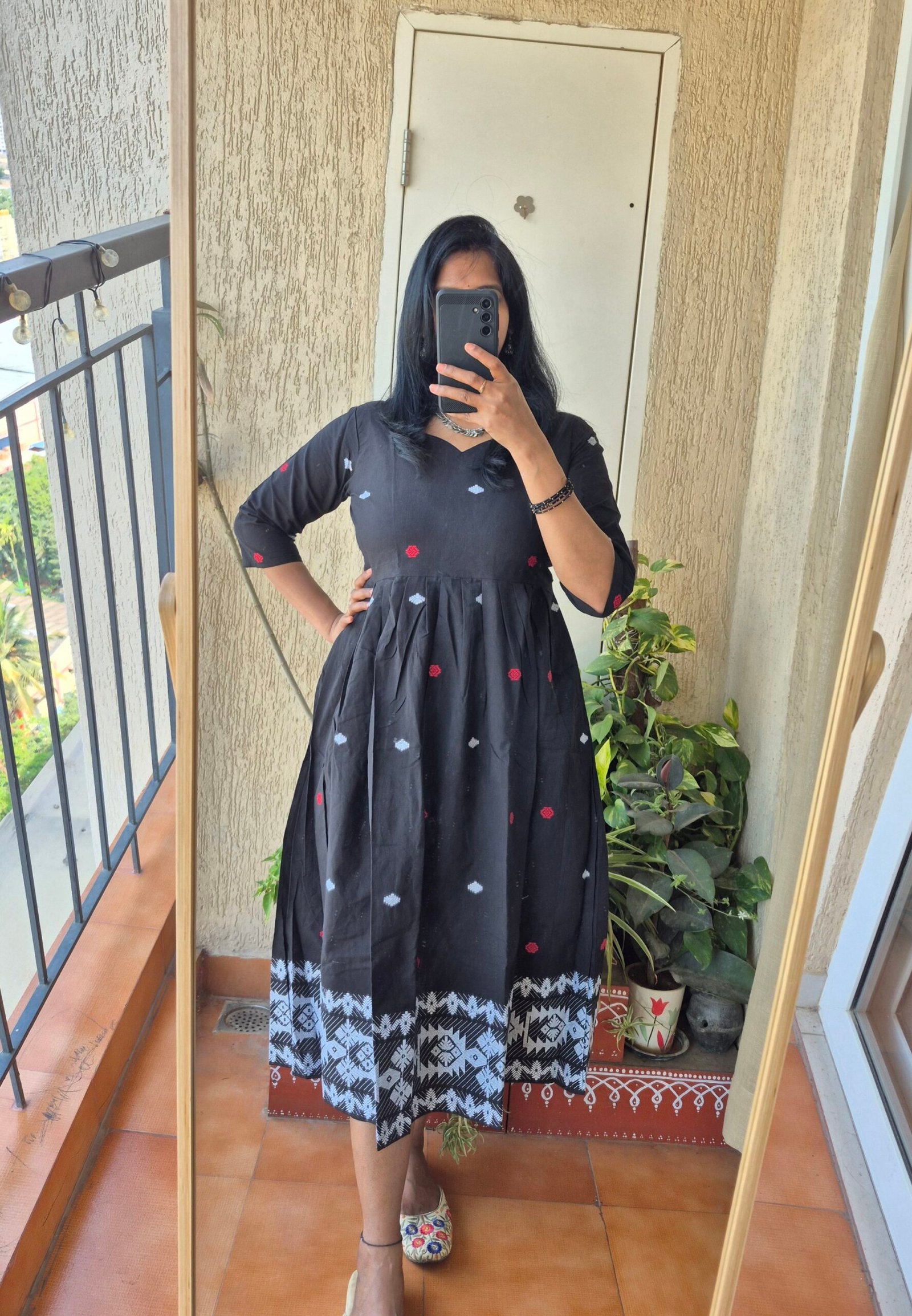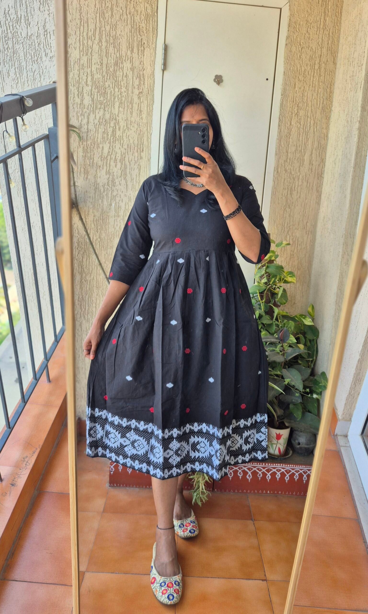 Beautiful Black Jamdhaani dress comes with all over buttis and the highlight of the dress having beautiful Jamdhani weaving at the bottom which gives stunnig look for the dress.Length of the dress is 46 inches .Can be styled multiple ways pair it with a palazzo or a legging or just wesr as it is.