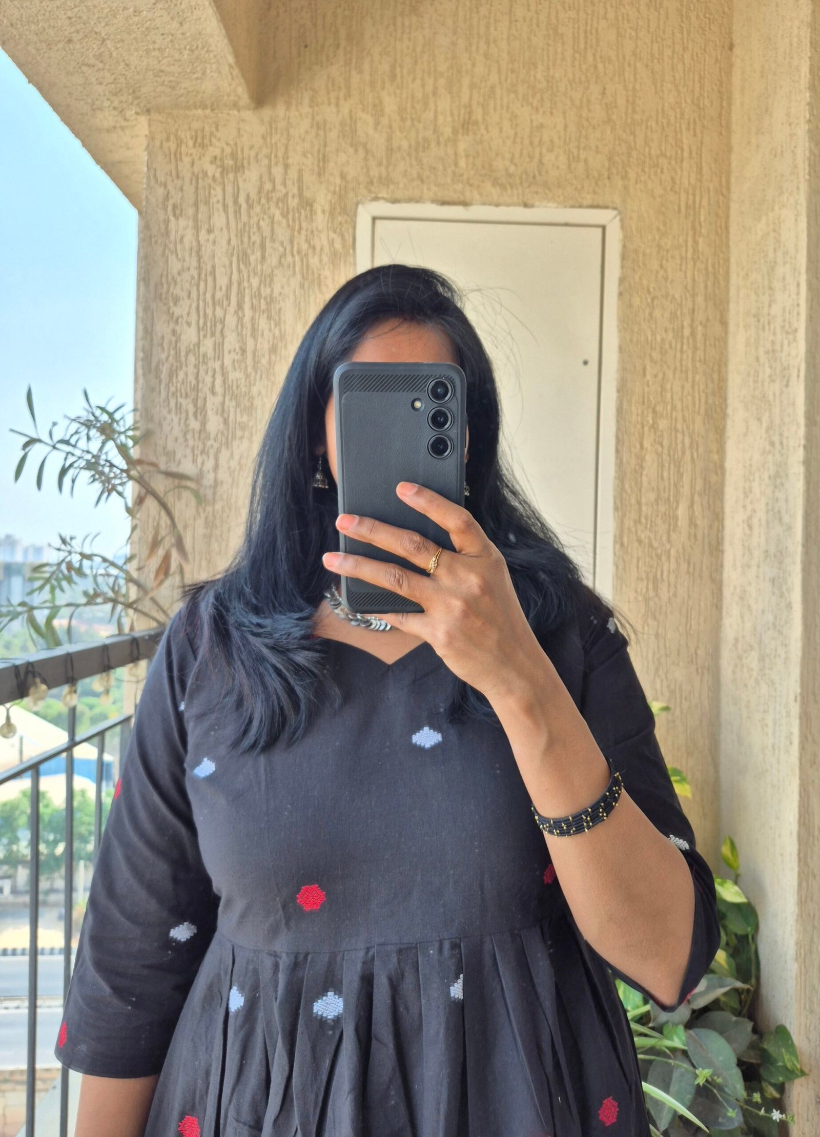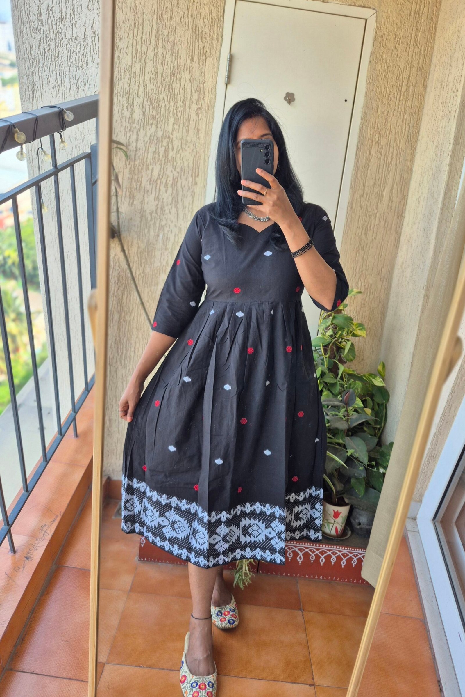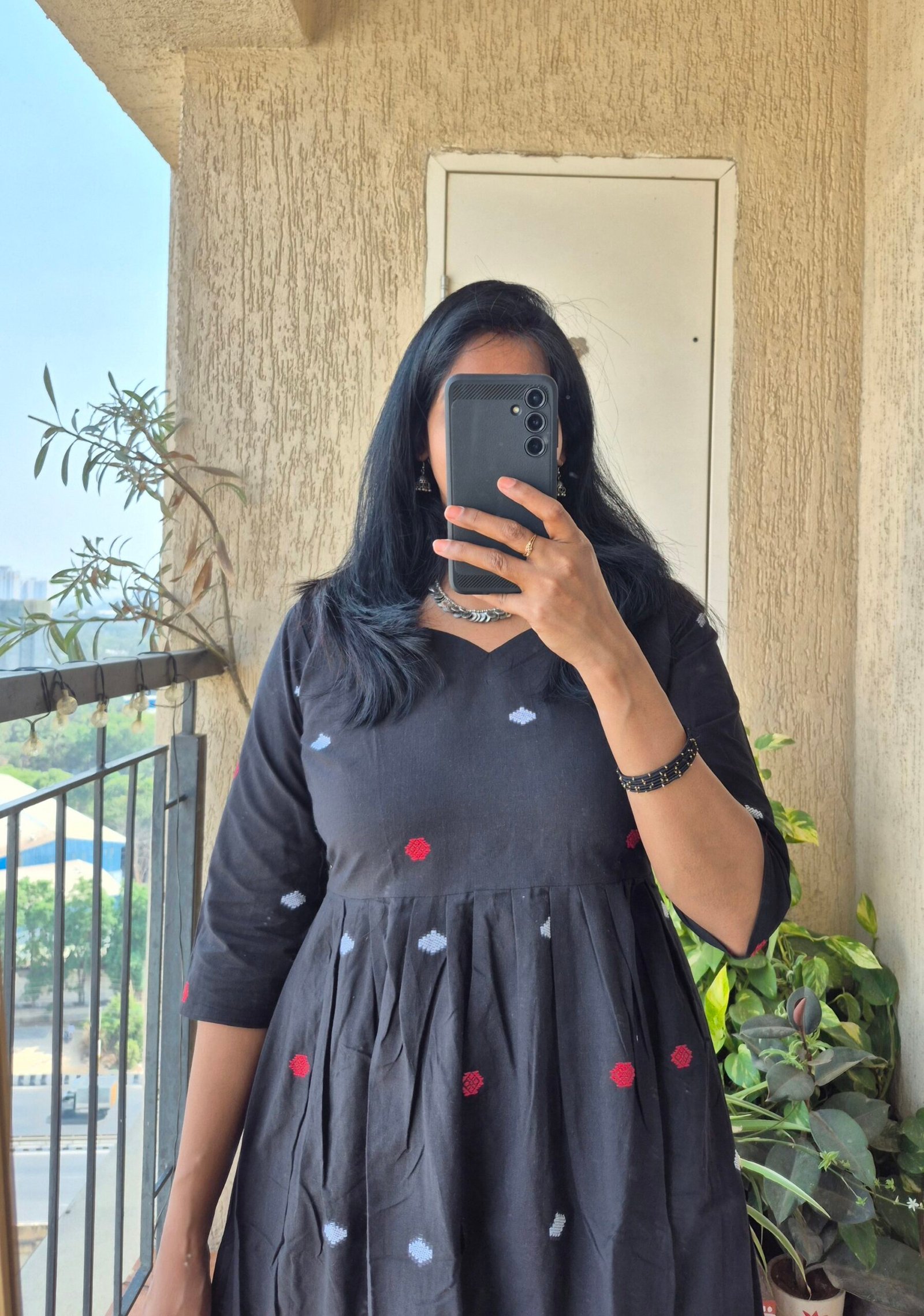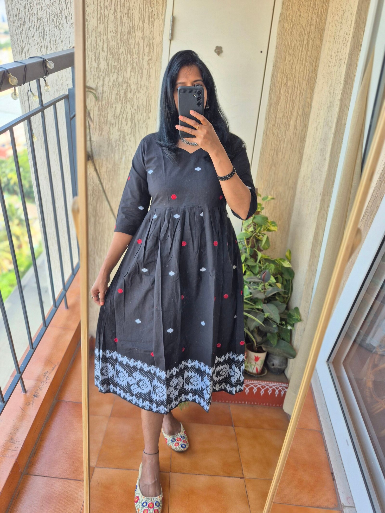 Beautiful Black Jamdhaani dress comes with all over buttis and the highlight of the dress having beautiful Jamdhani weaving at the bottom which gives stunnig look for the dress.Length of the dress is 46 inches .Can be styled multiple ways pair it with a palazzo or a legging or just wesr as it is.