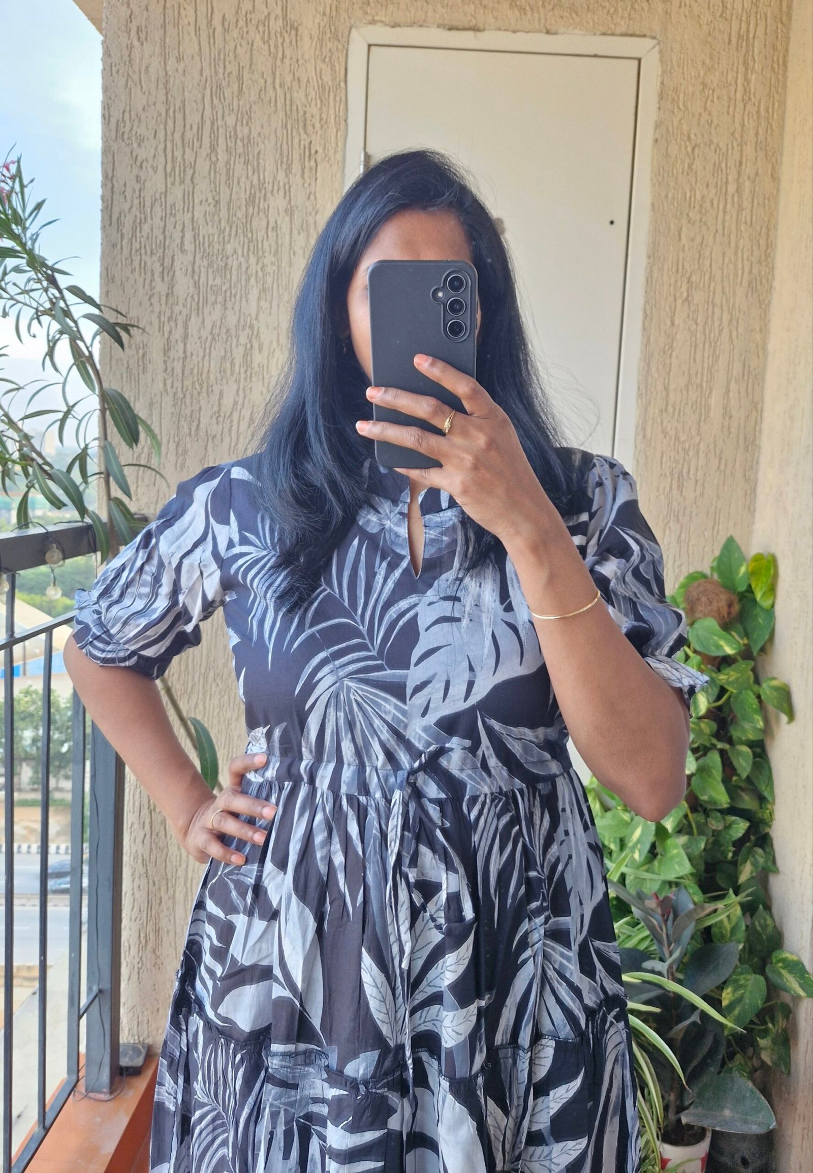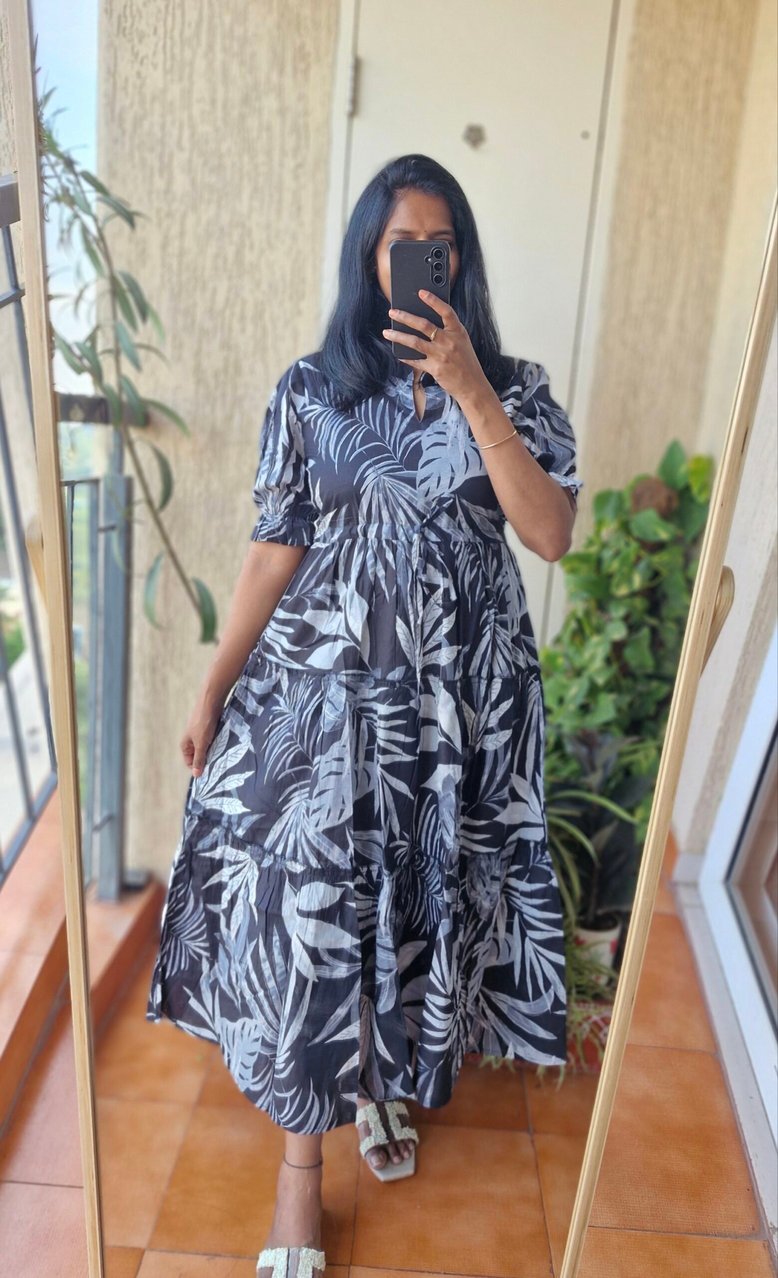 Beautiful Black leaf three tier cotton dress comes with a adjustable waist and with a length of 50 inches.Perfect for casual outing under such budget freindly price.