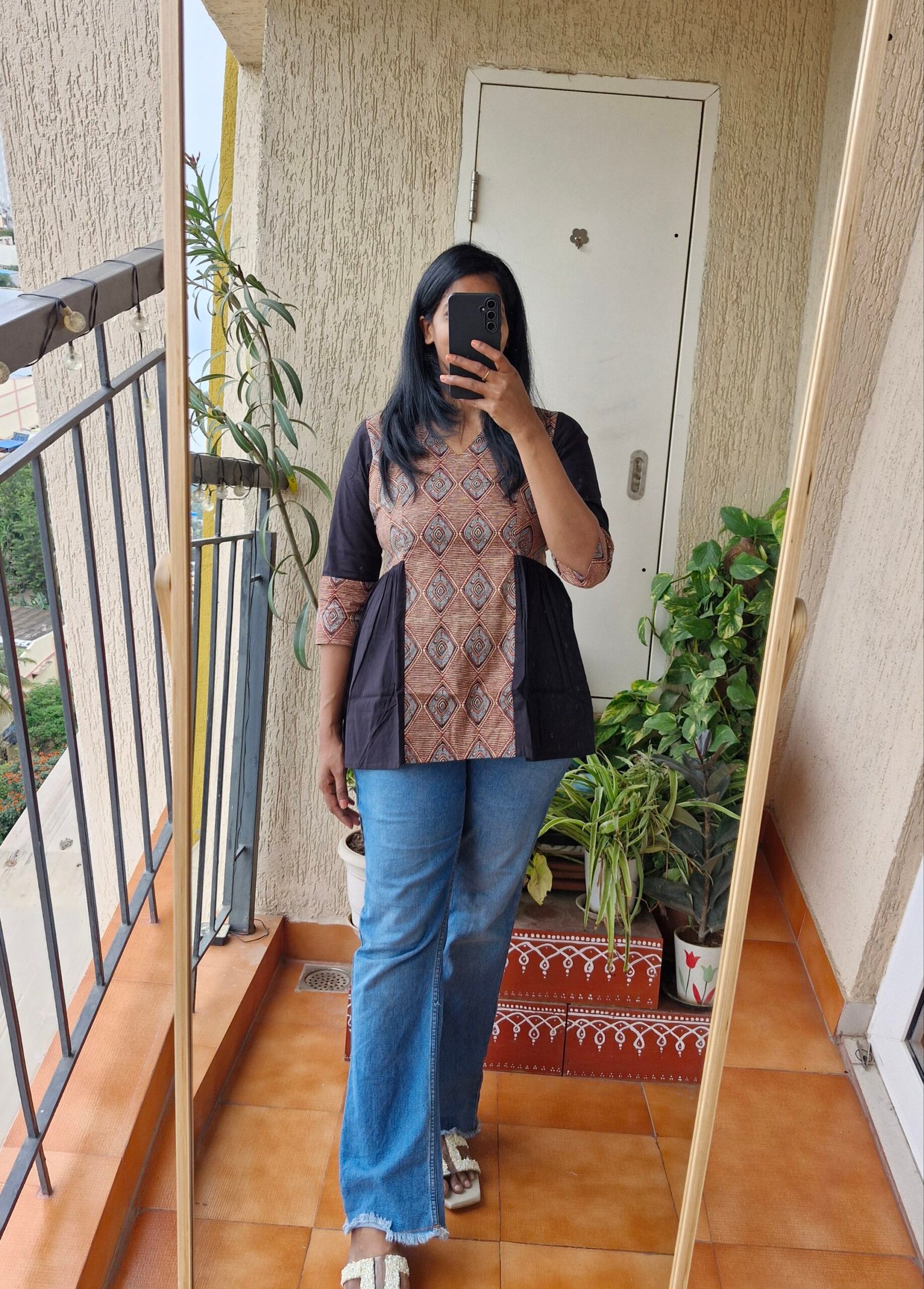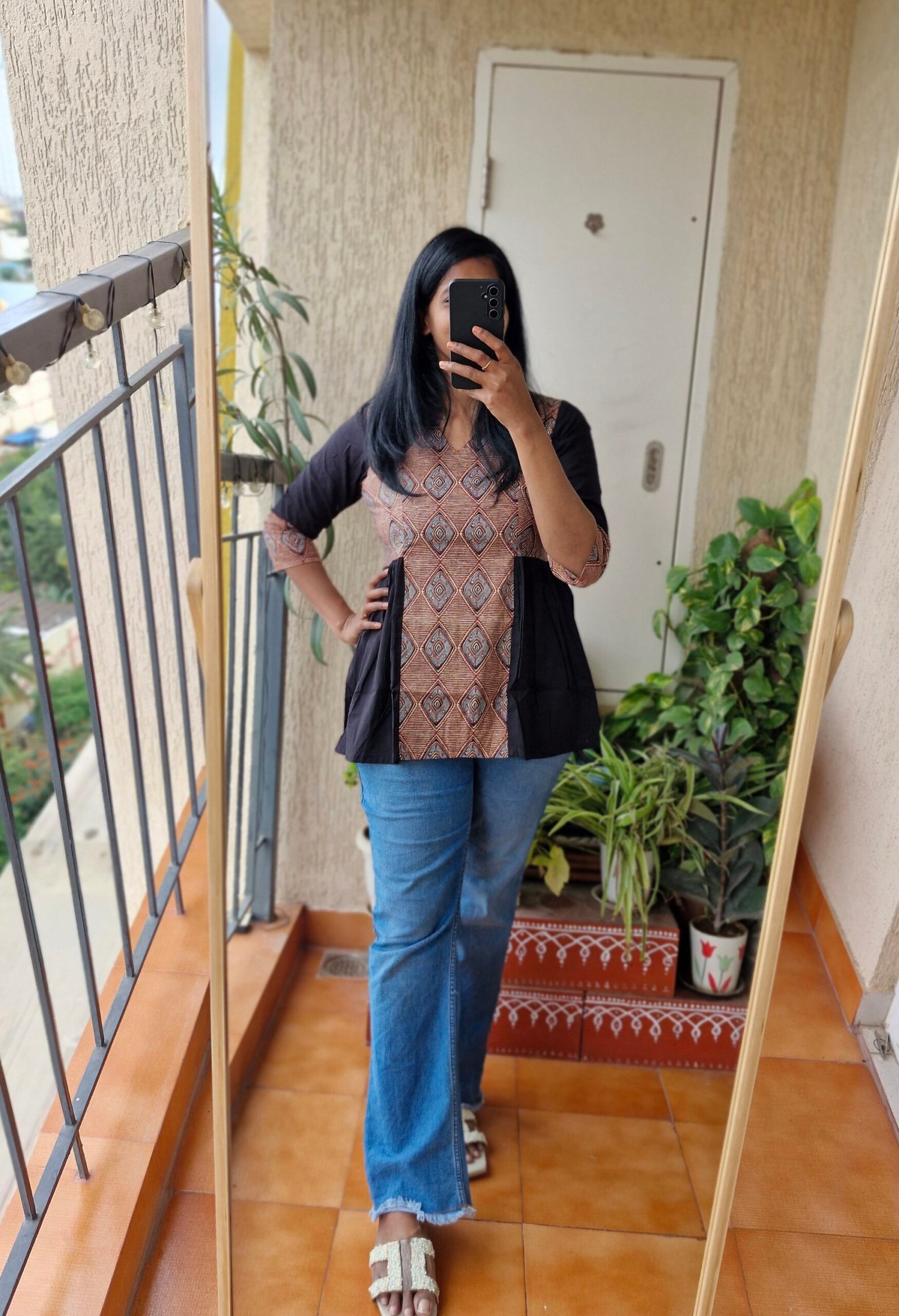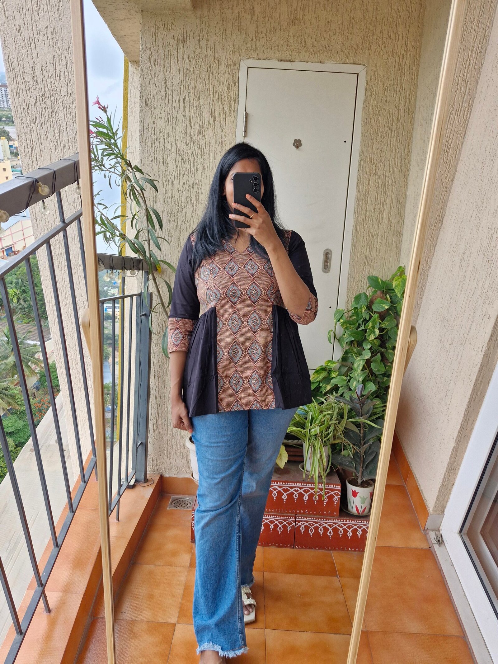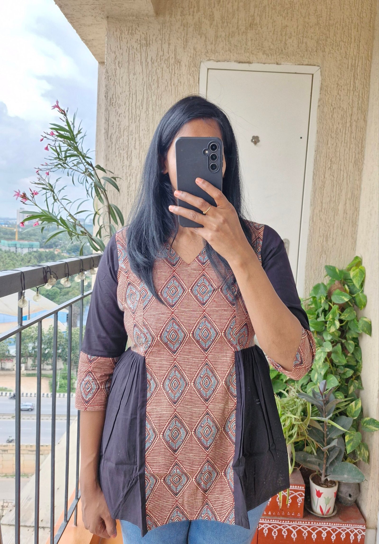 Beautiful black with rust short cotton kurta with a beautiful block prints with side frills gives full hip coverage. Length of the top is 27 inches.Exact to bust size .