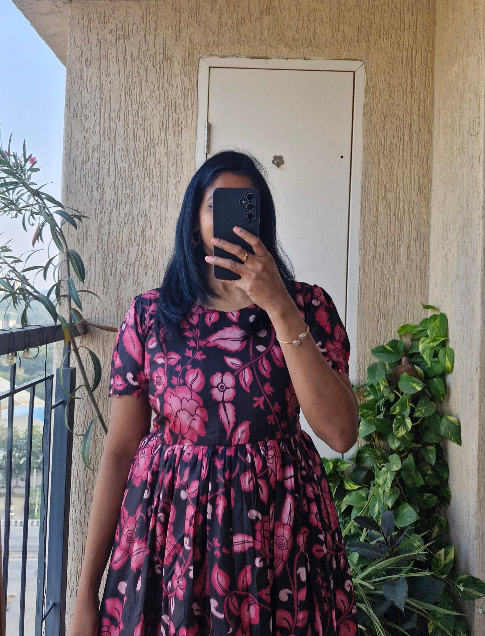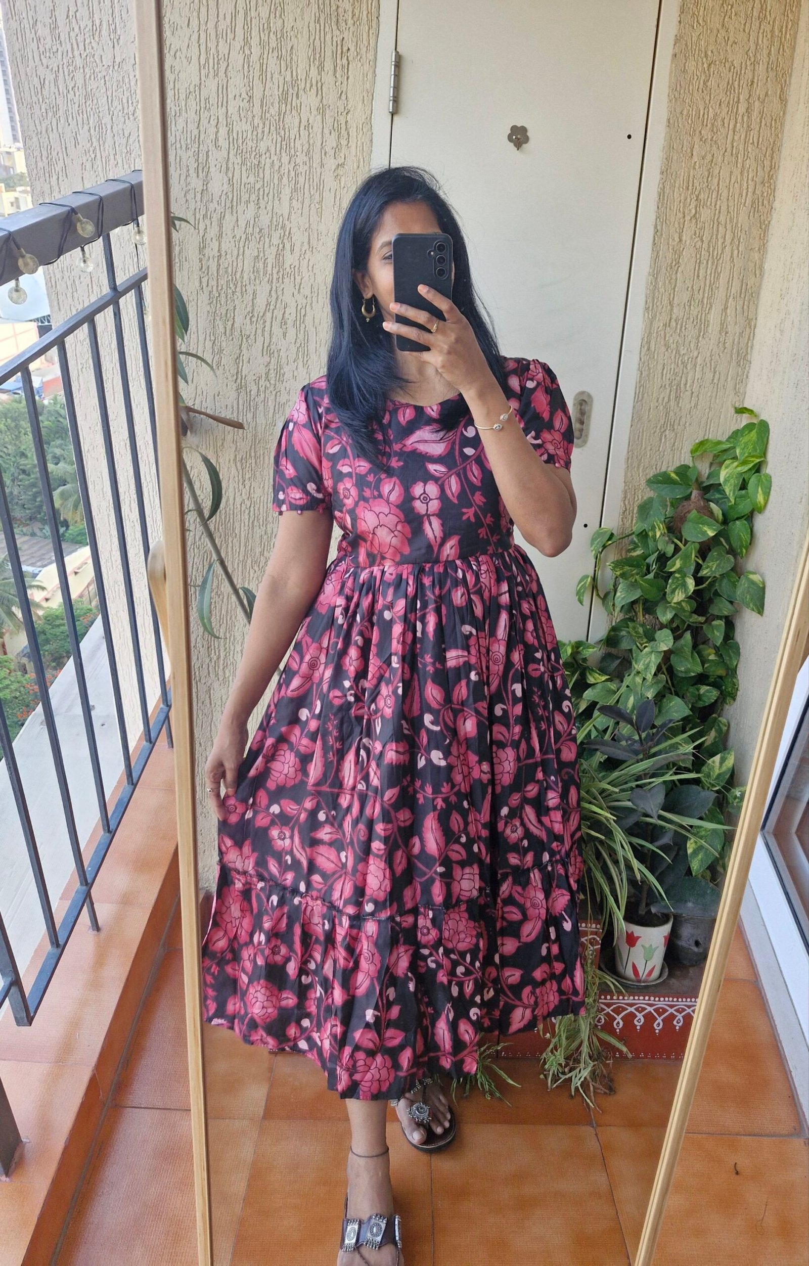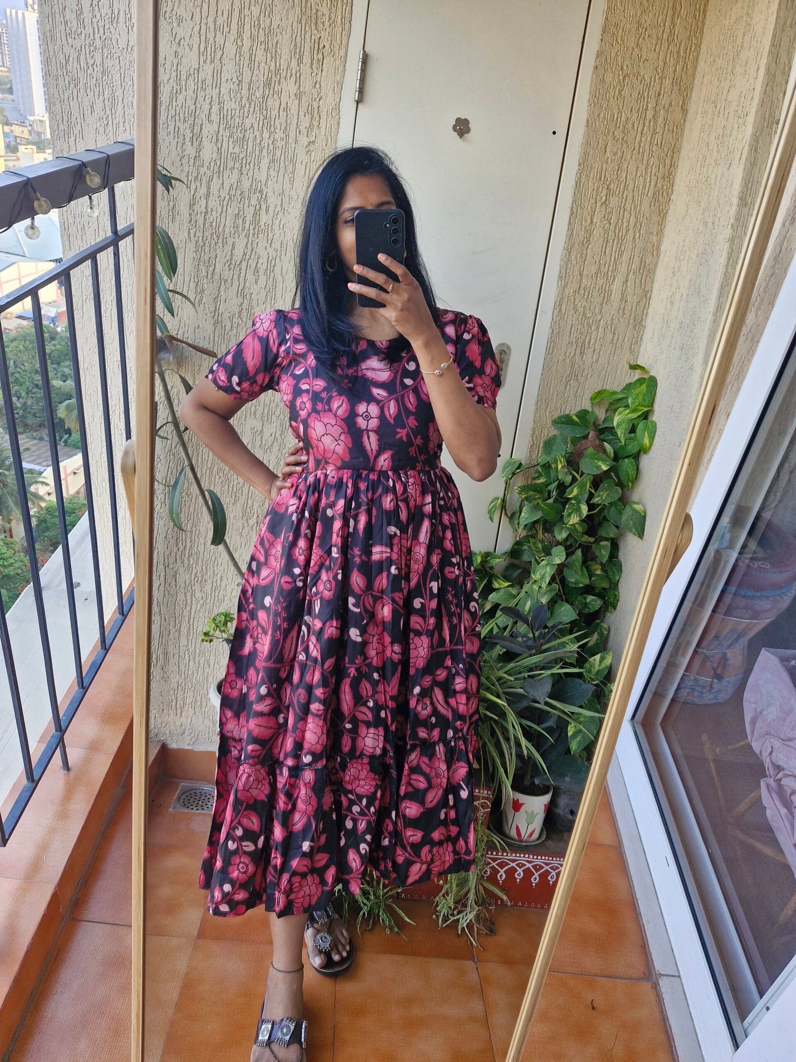 Luxuries Black pink floral Tussar silk Kalamkaari dress comes with length of 48 inches and with full lining inside with a beautiful neckline and cute potlis for the hands. Tussar silk is a premium silk and looks so luxuries with a vibrant prints these are easily maintained .These dress runs exactly to the size If you are exact 38 better go for next size less than 38 choose 38 only.