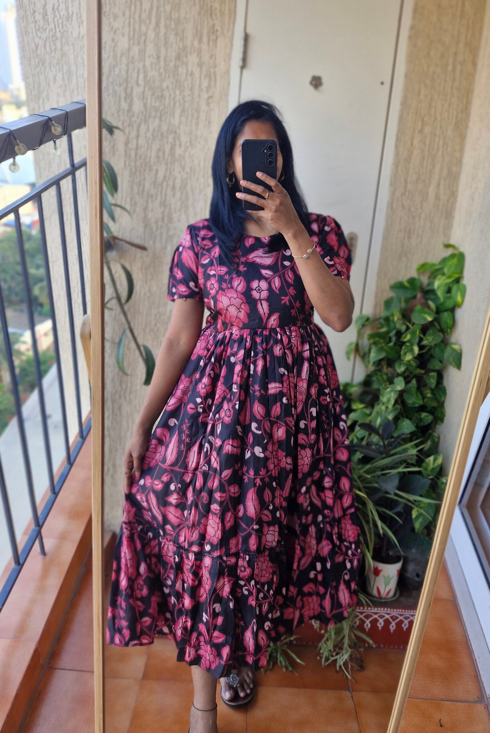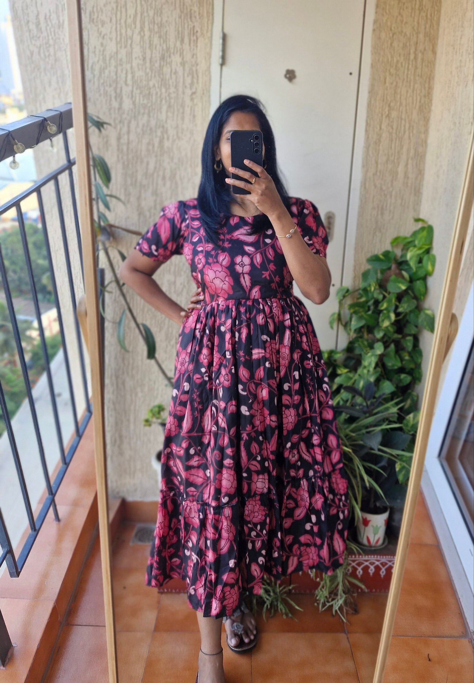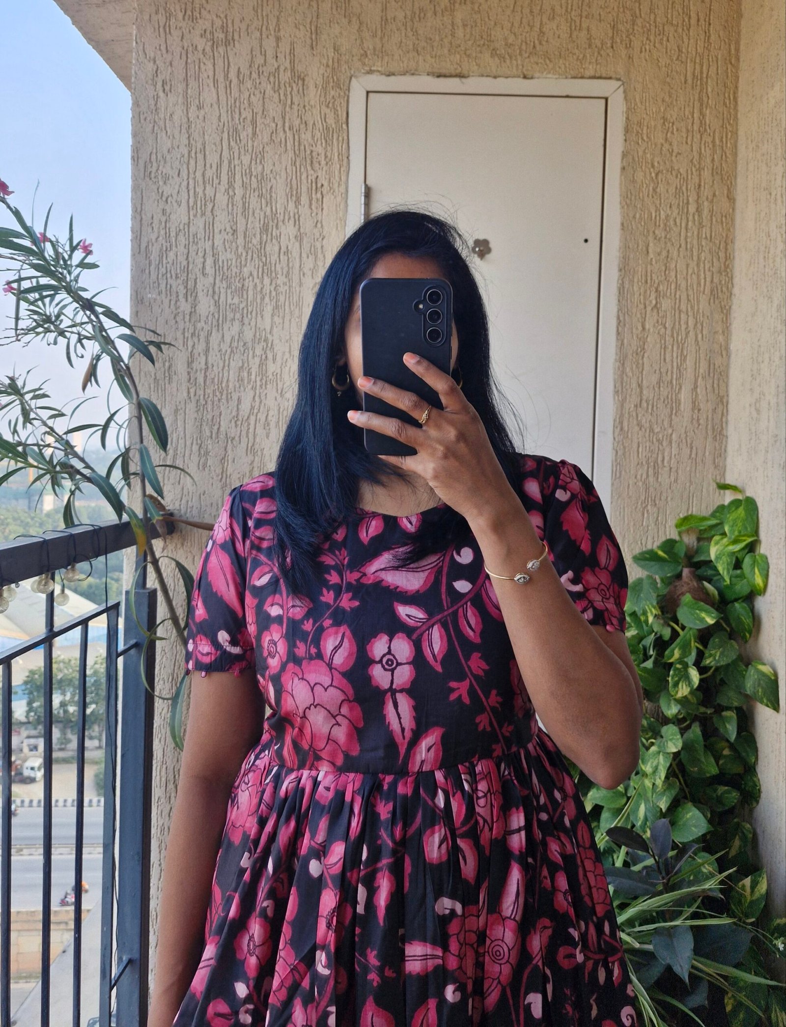 Luxuries Black pink floral Tussar silk Kalamkaari dress comes with length of 48 inches and with full lining inside with a beautiful neckline and cute potlis for the hands. Tussar silk is a premium silk and looks so luxuries with a vibrant prints these are easily maintained .These dress runs exactly to the size If you are exact 38 better go for next size less than 38 choose 38 only.