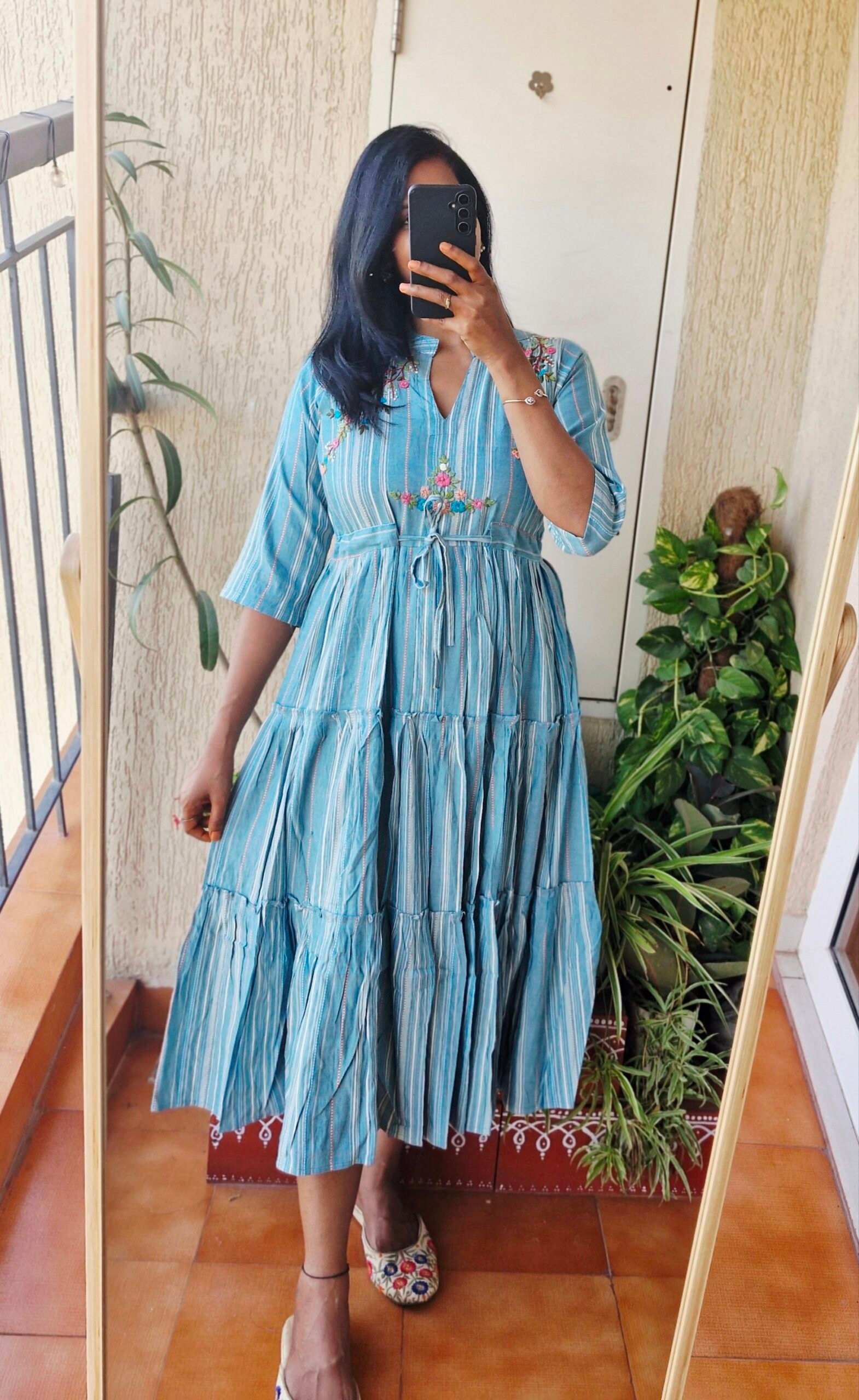Blue lenin cotton dress with a beautiful embroidery dress on yoke part and adjustable waist cmand the length if the dress is 47 inches.
