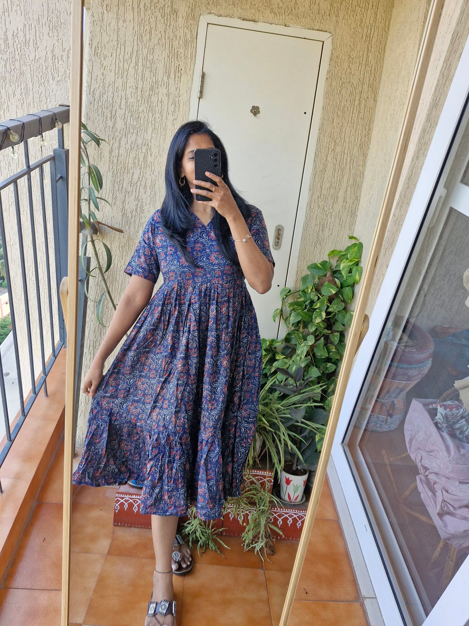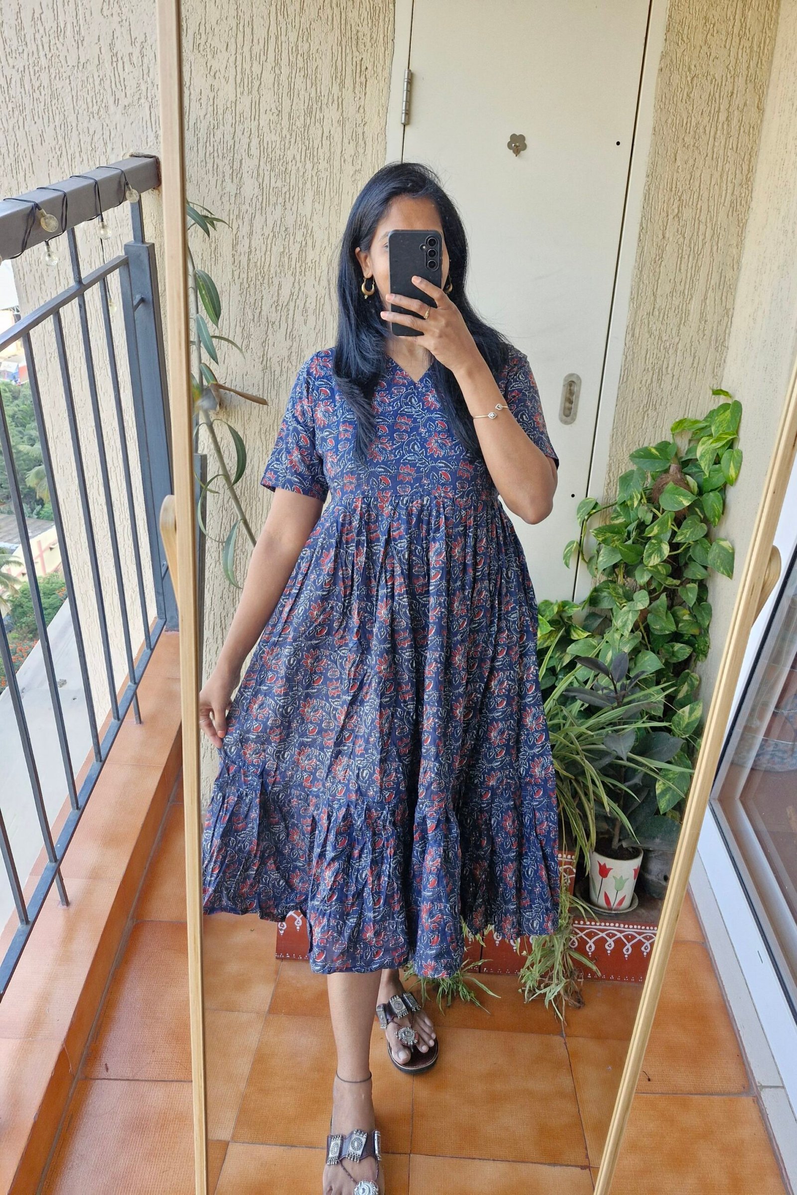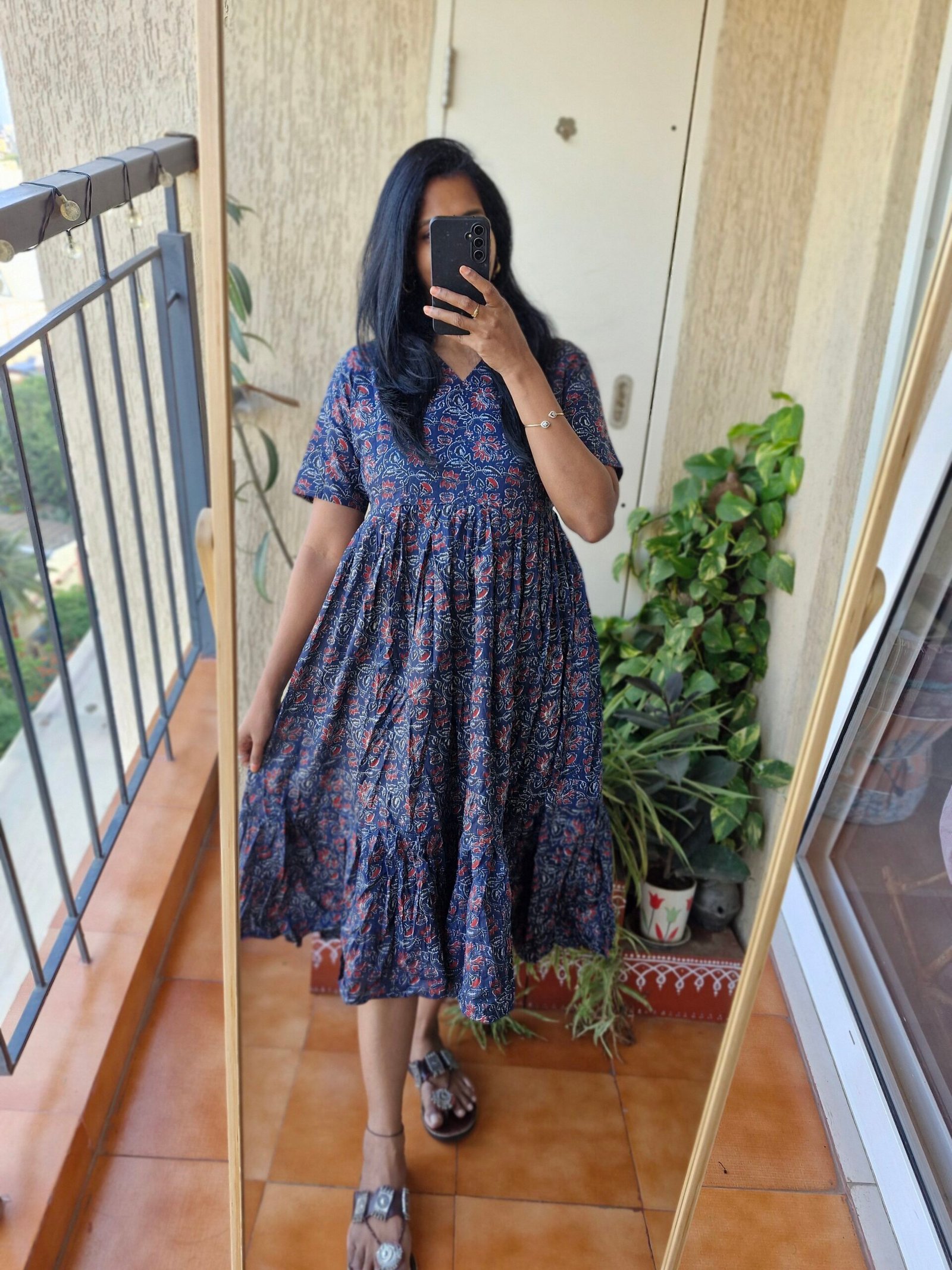 Beautiful handloom Ajrack cotton dress comes with a back tie up and the length of the dress is 46 inches. This dress runs little lower than actual size so we have made L(40) as M(38). Please choose as per your bust size and do not choose bigger size as we have already adjusted to the right size with extra inches.