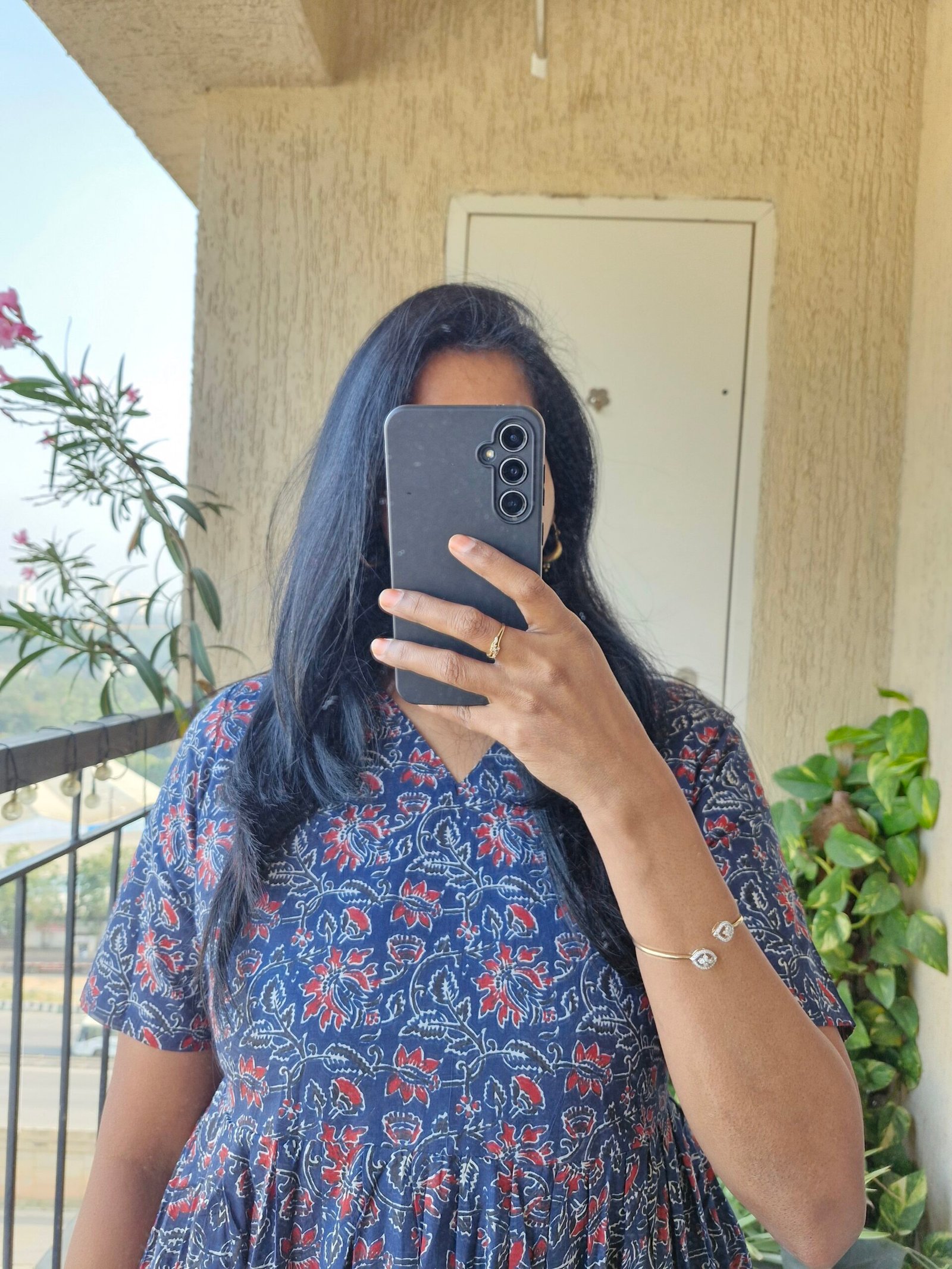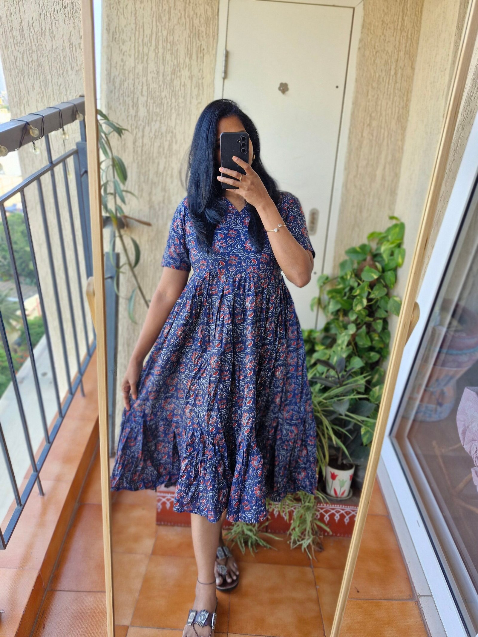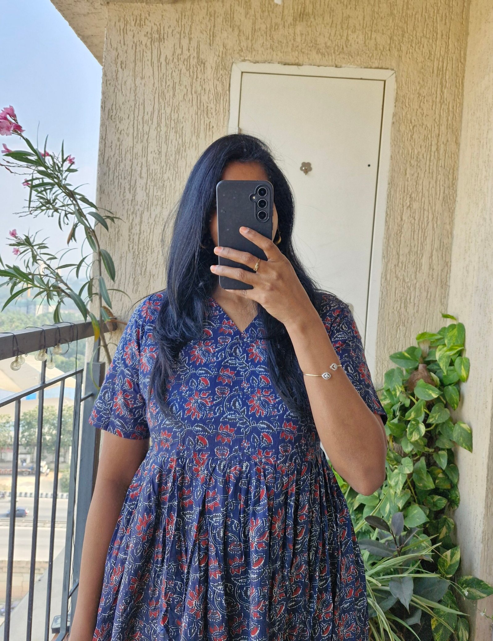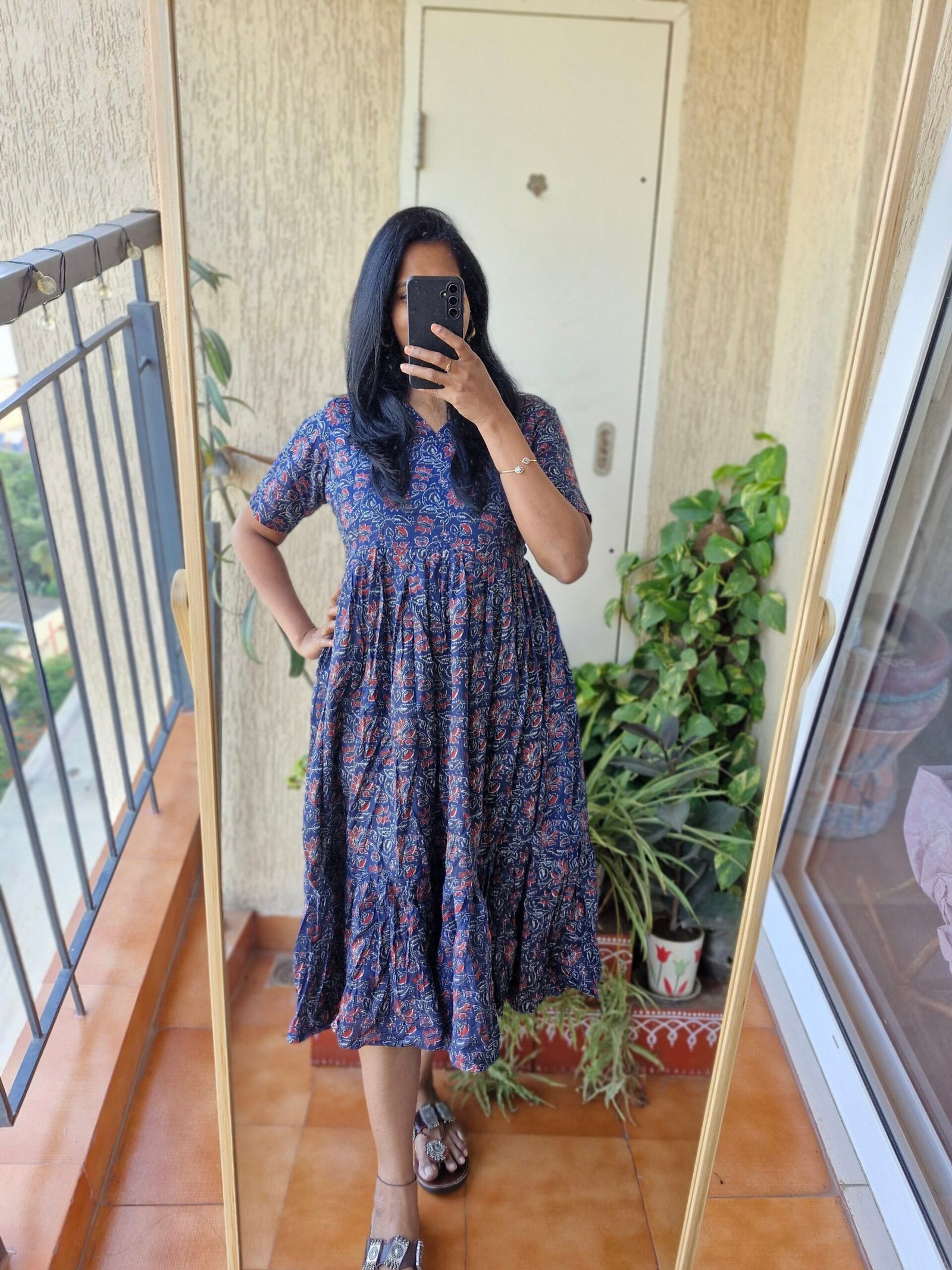 Beautiful handloom Ajrack cotton dress comes with a back tie up and the length of the dress is 46 inches. This dress runs little lower than actual size so we have made L(40) as M(38). Please choose as per your bust size and do not choose bigger size as we have already adjusted to the right size with extra inches.