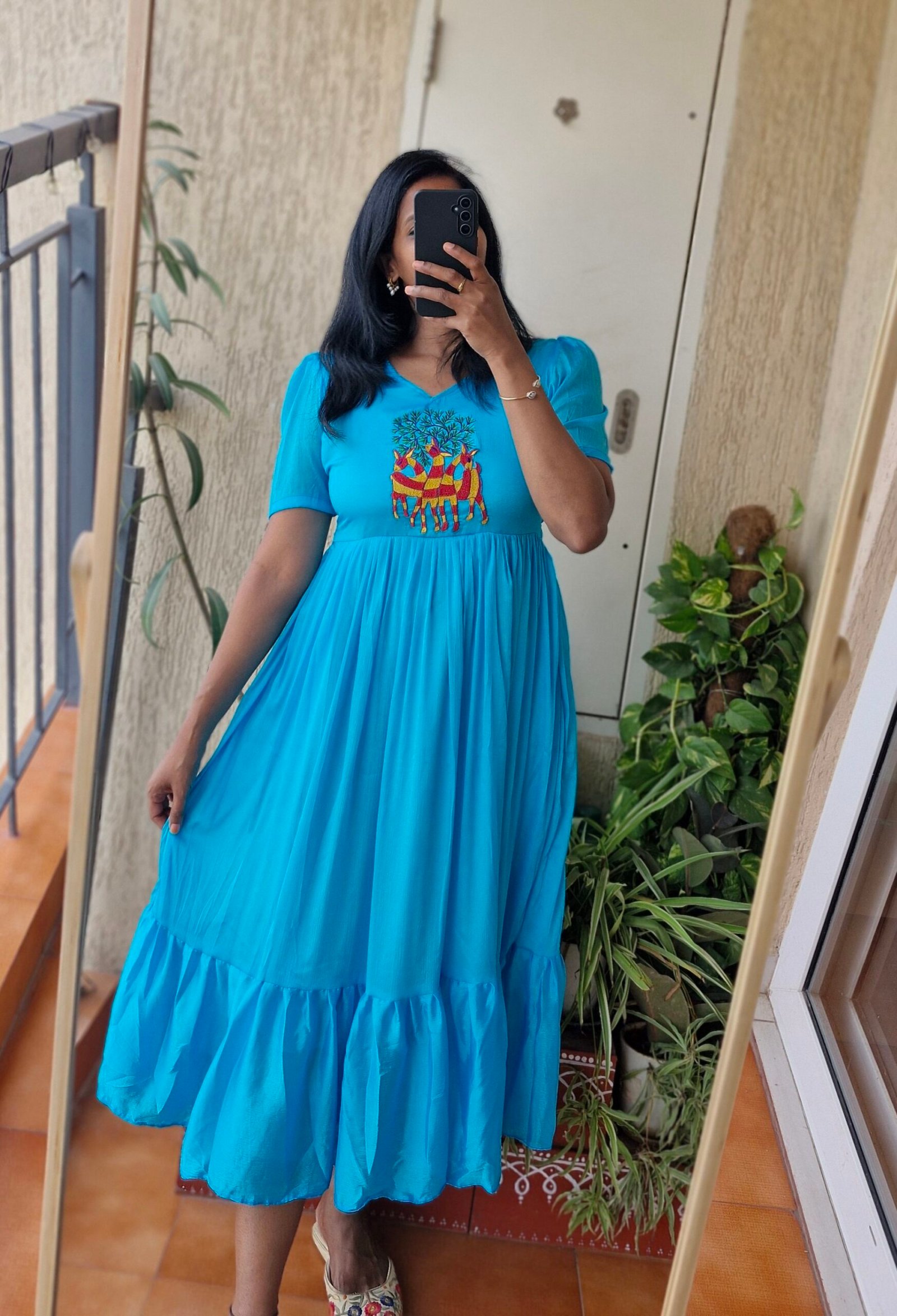 Blue Deer Chinon frock comes with a full lining super lightweight and travel friendly.Length of the dress is 47 inches.