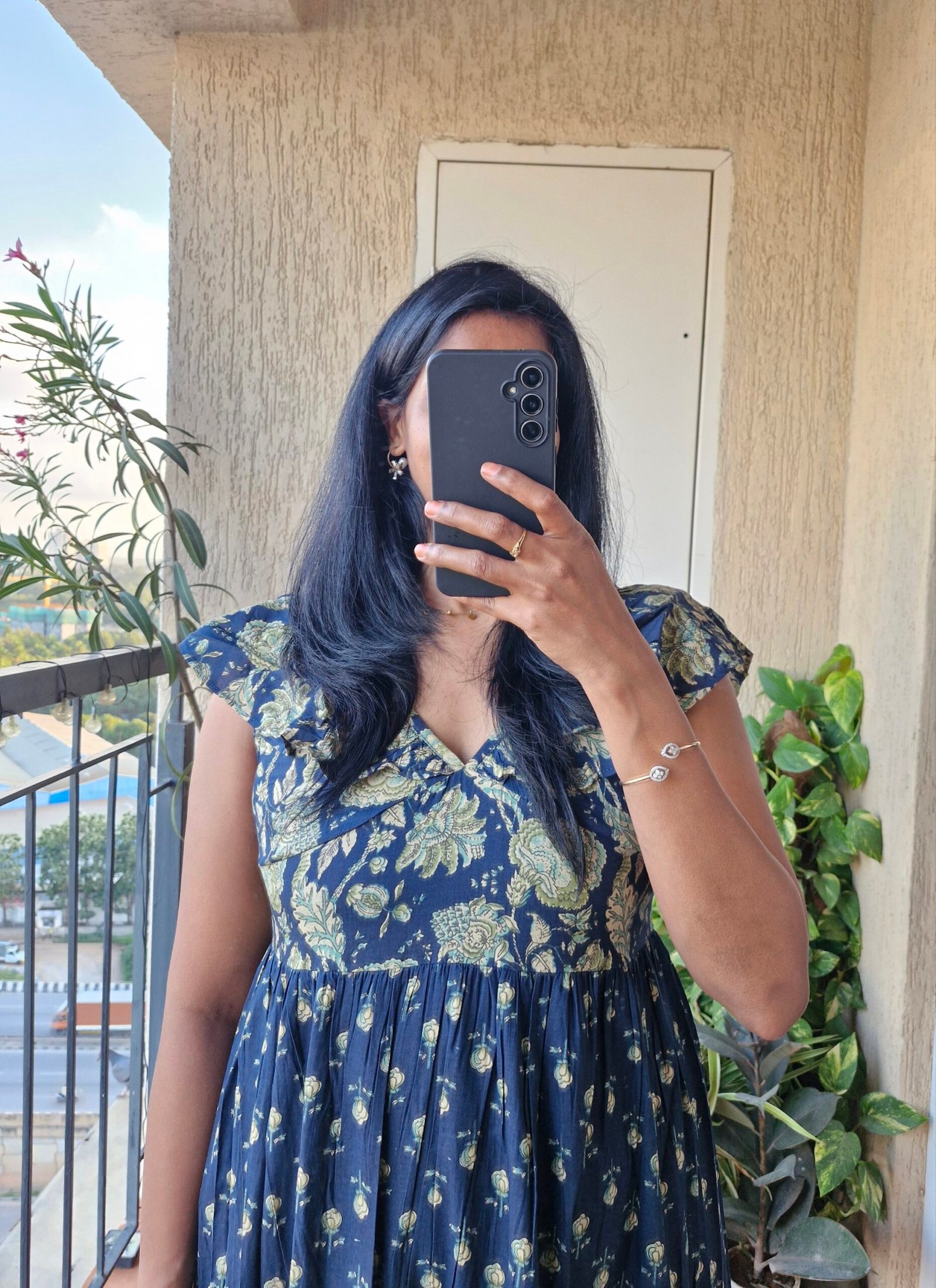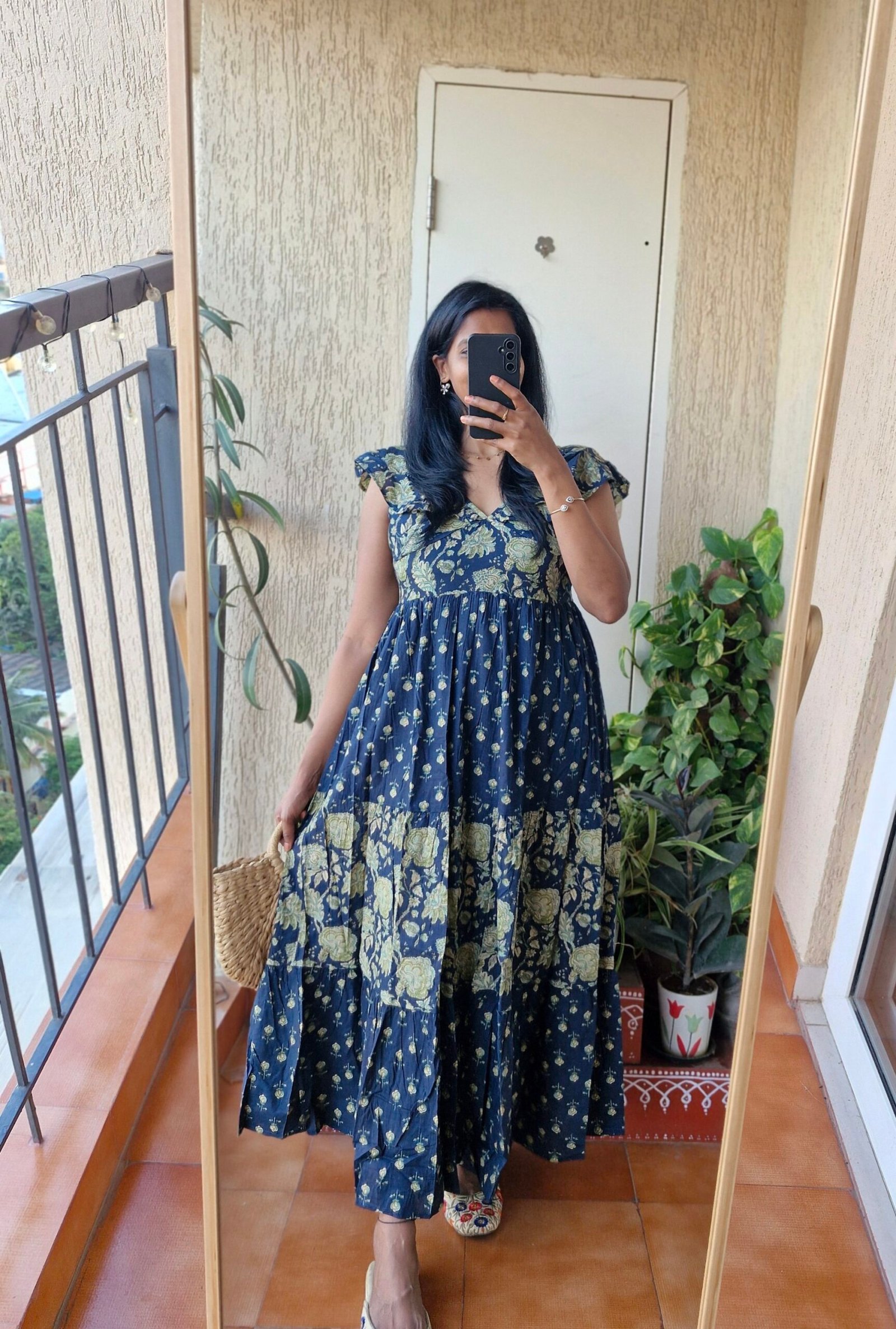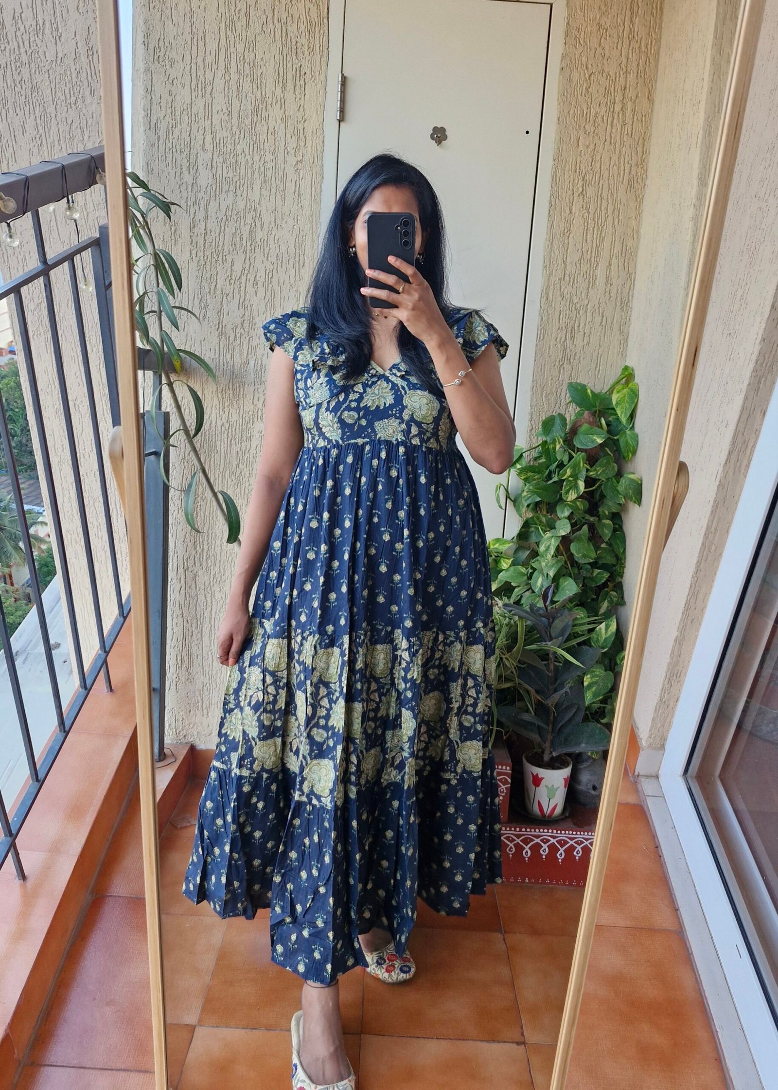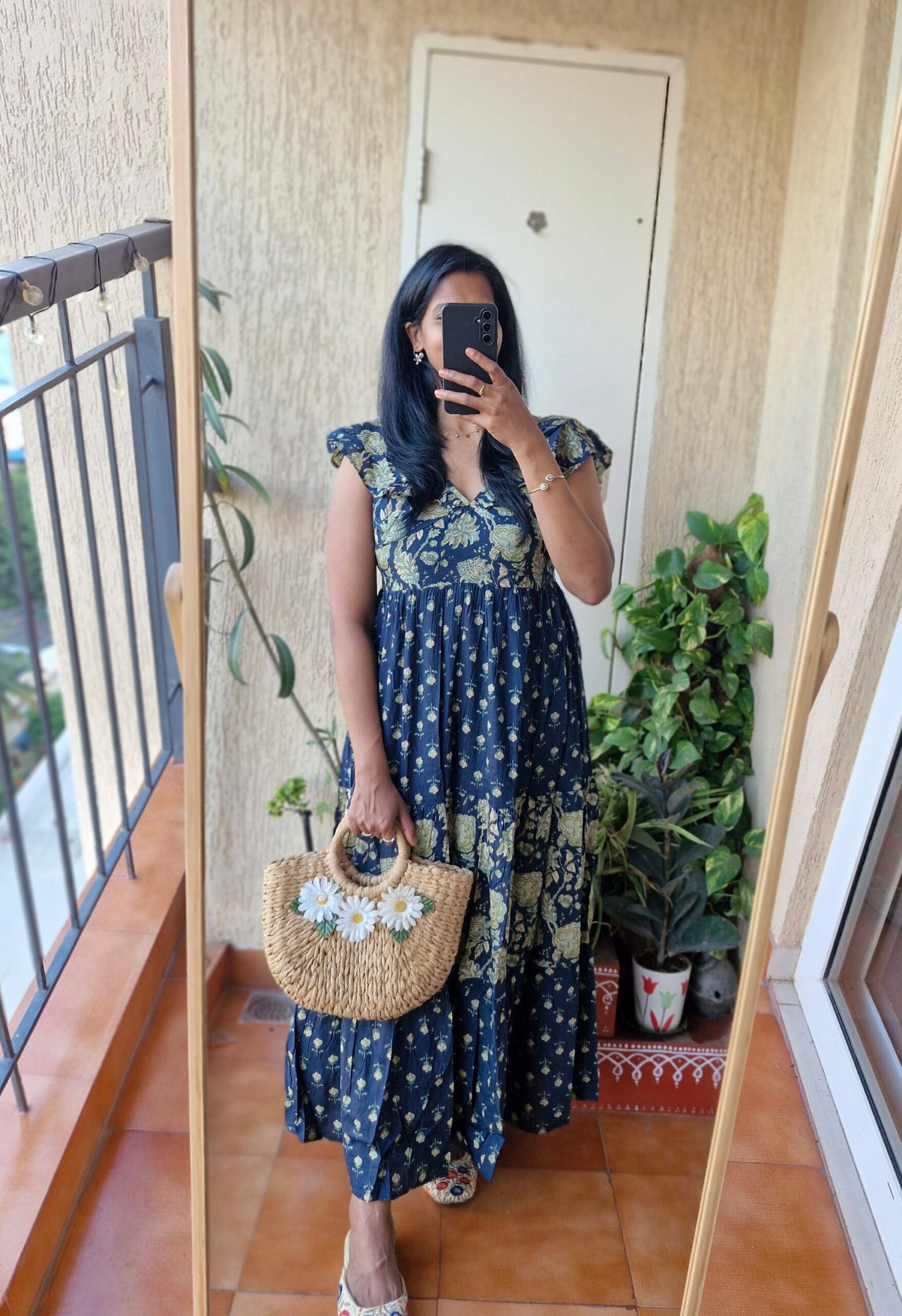 Beautiful blue floral cotton maxi dress perfect go to vacay/brunch dress and a perfect budget friendly dress. Comes with a length of 53 inches.