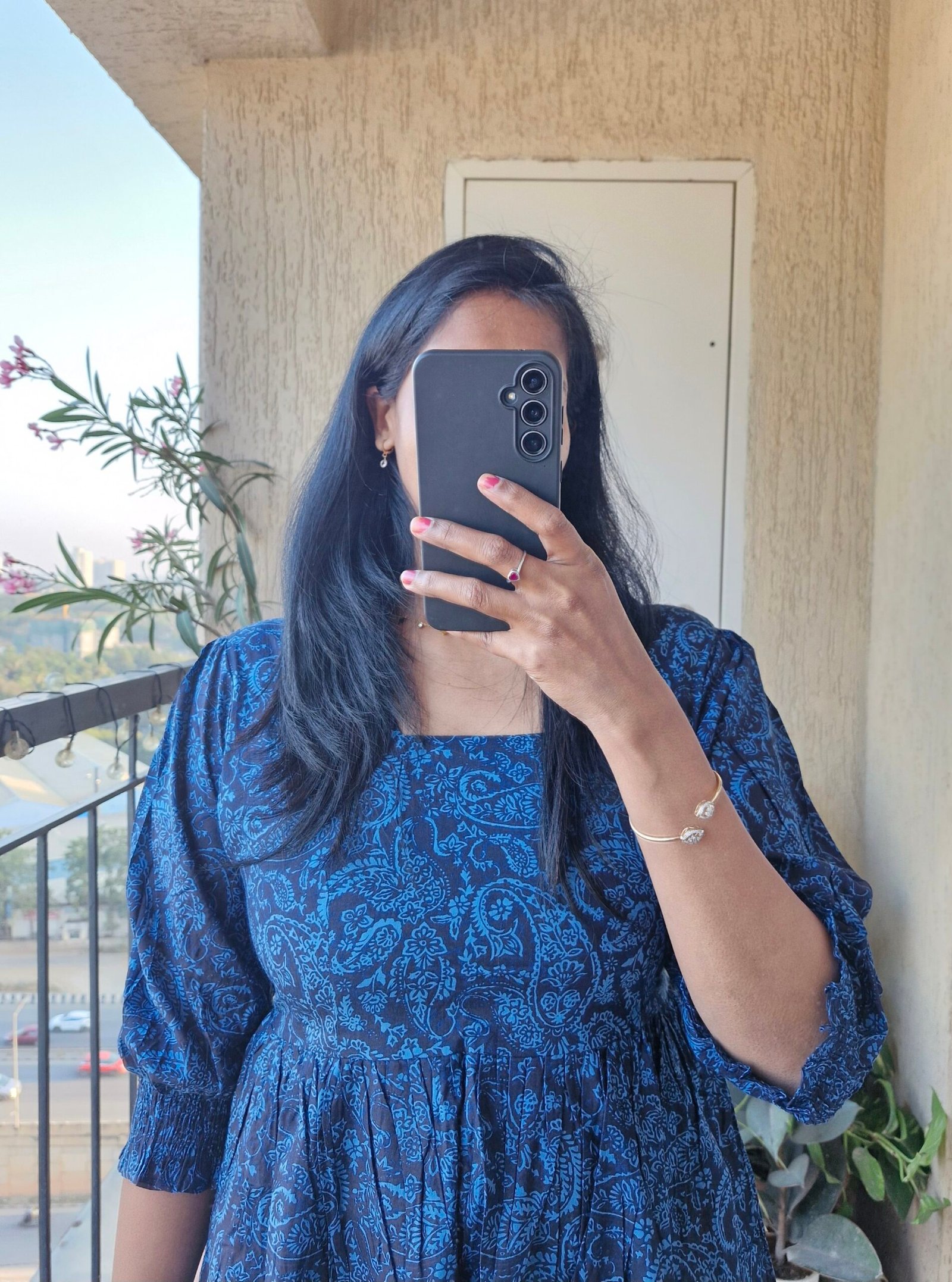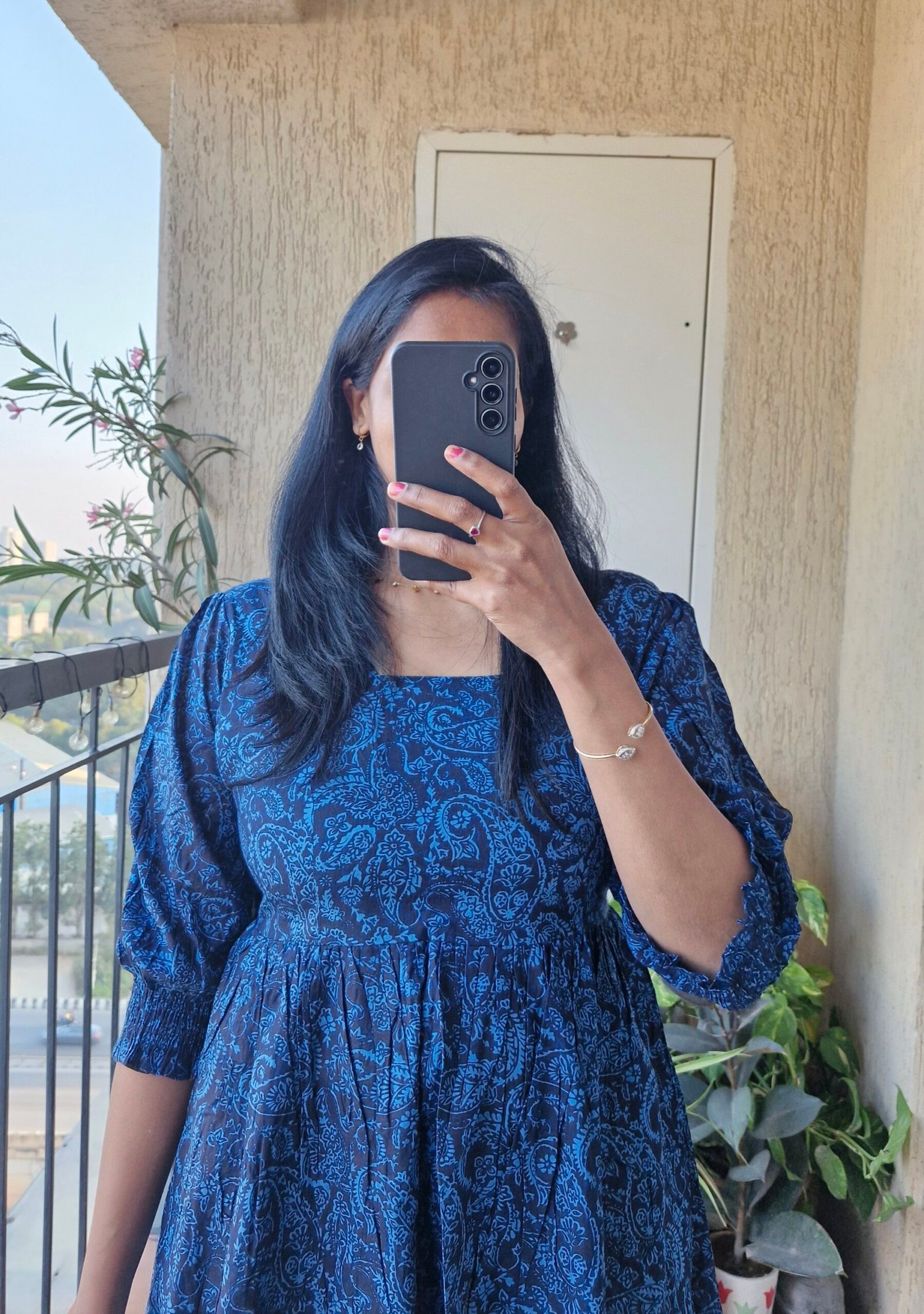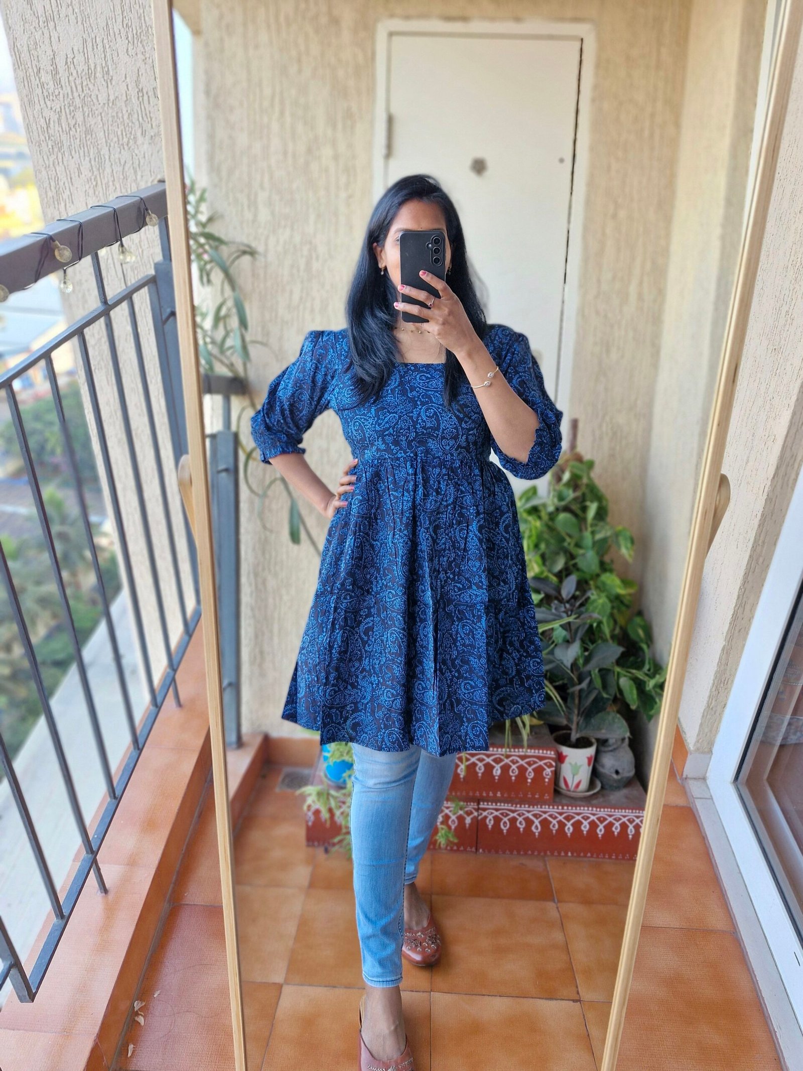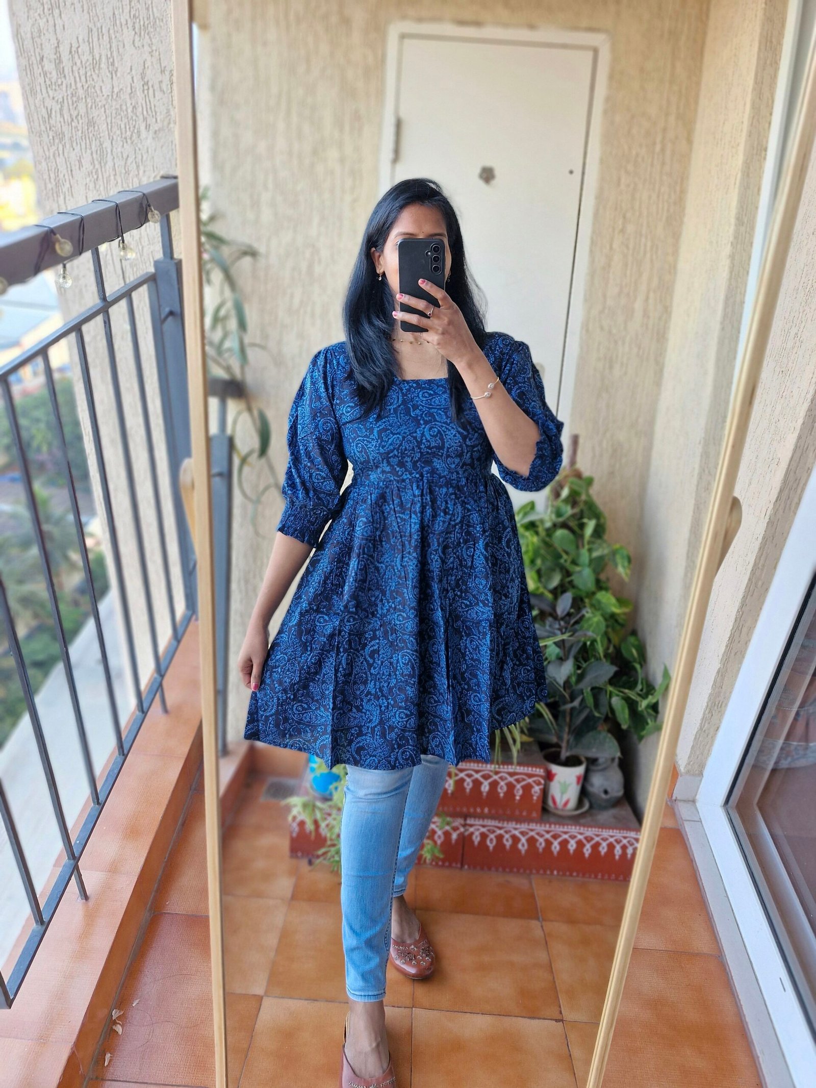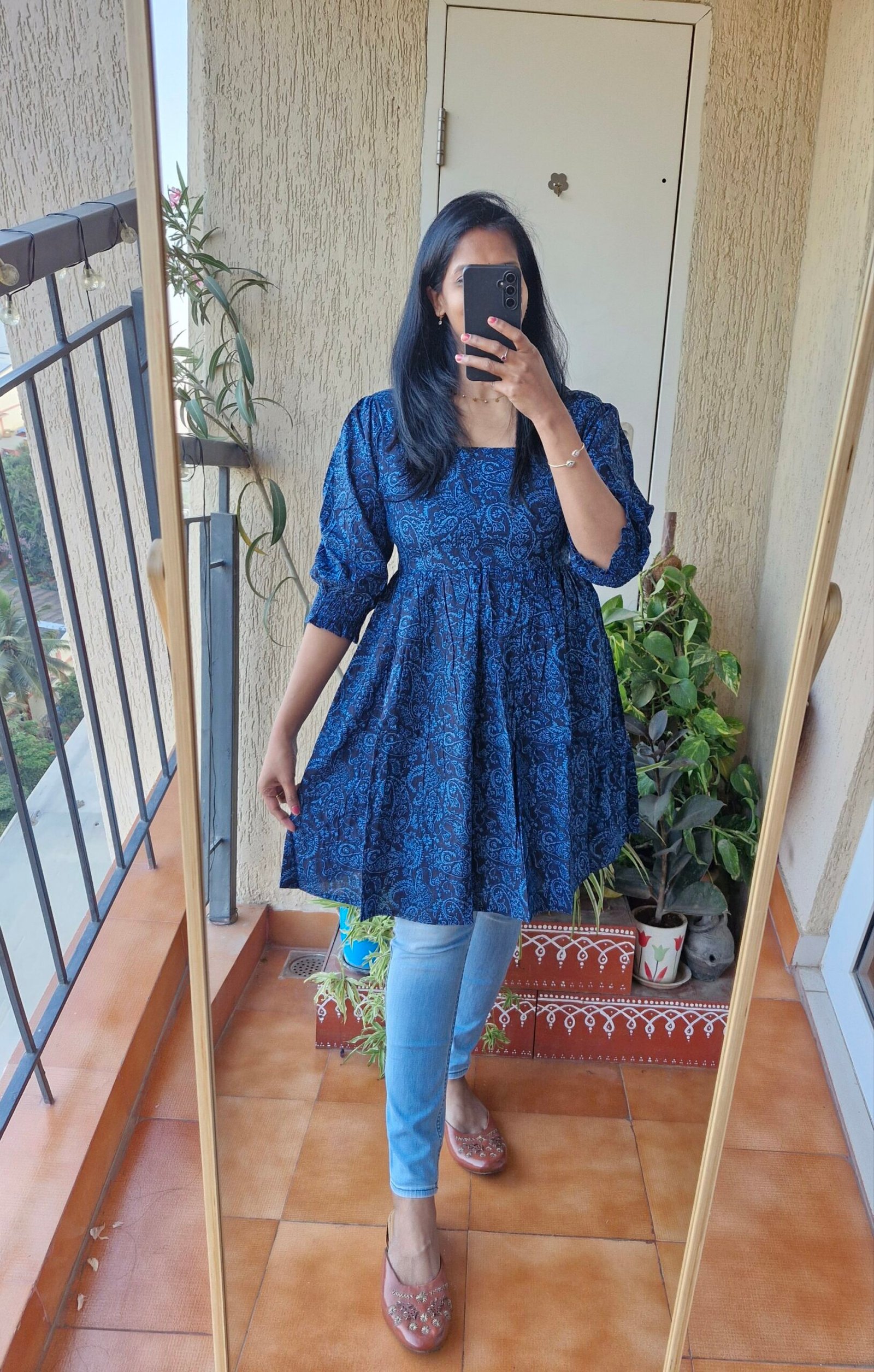 Beautiful blue Paisley print pure cotton tunic top comes with a smoked effect at the back and also for the sleeves.Perfect for casual/office wear so comfortable and stylish.This dress runs little lower than exact size.So please choose one size up though it has a strechable back.Last picture is for reference only.Length of the top.is 36 inches.