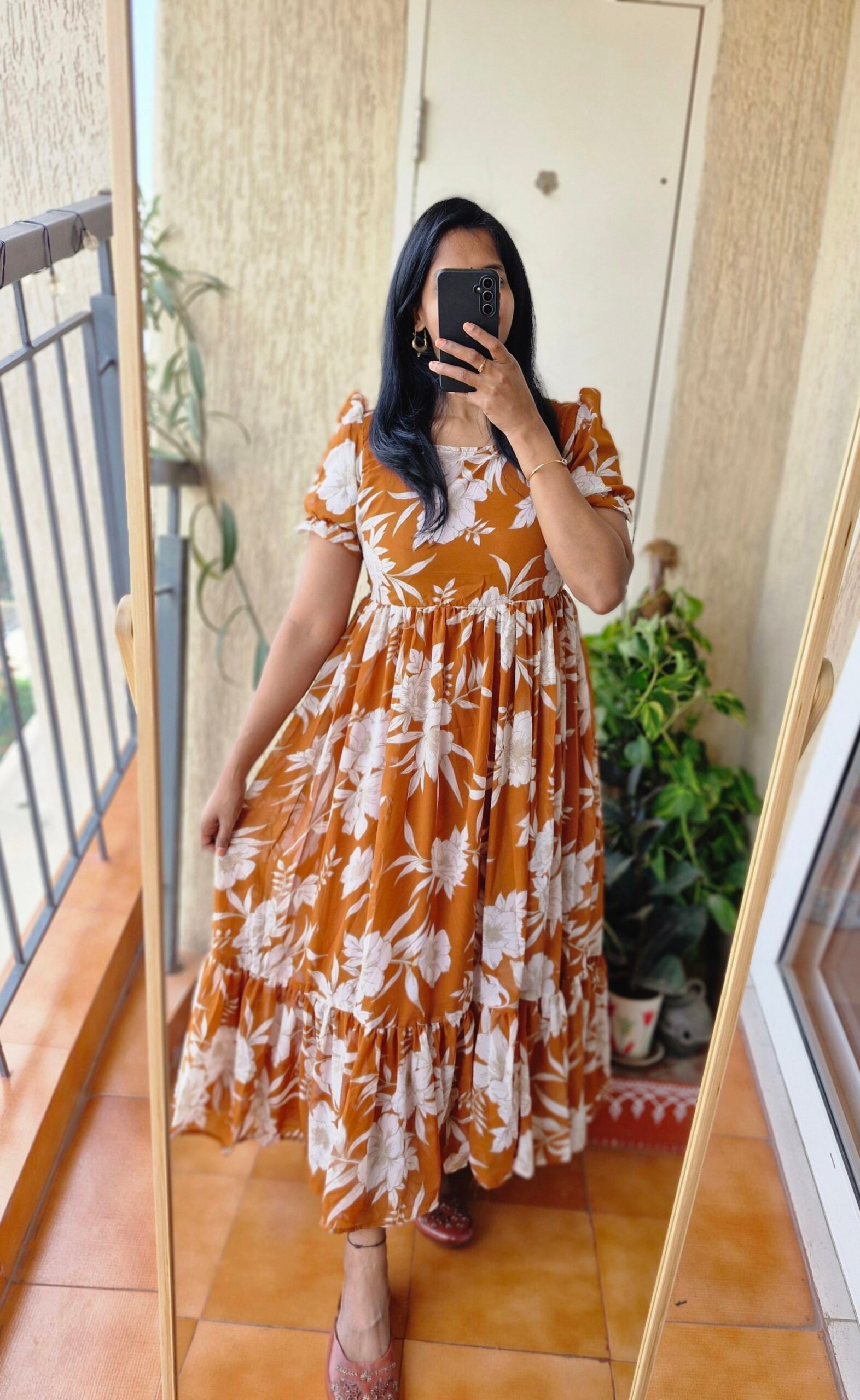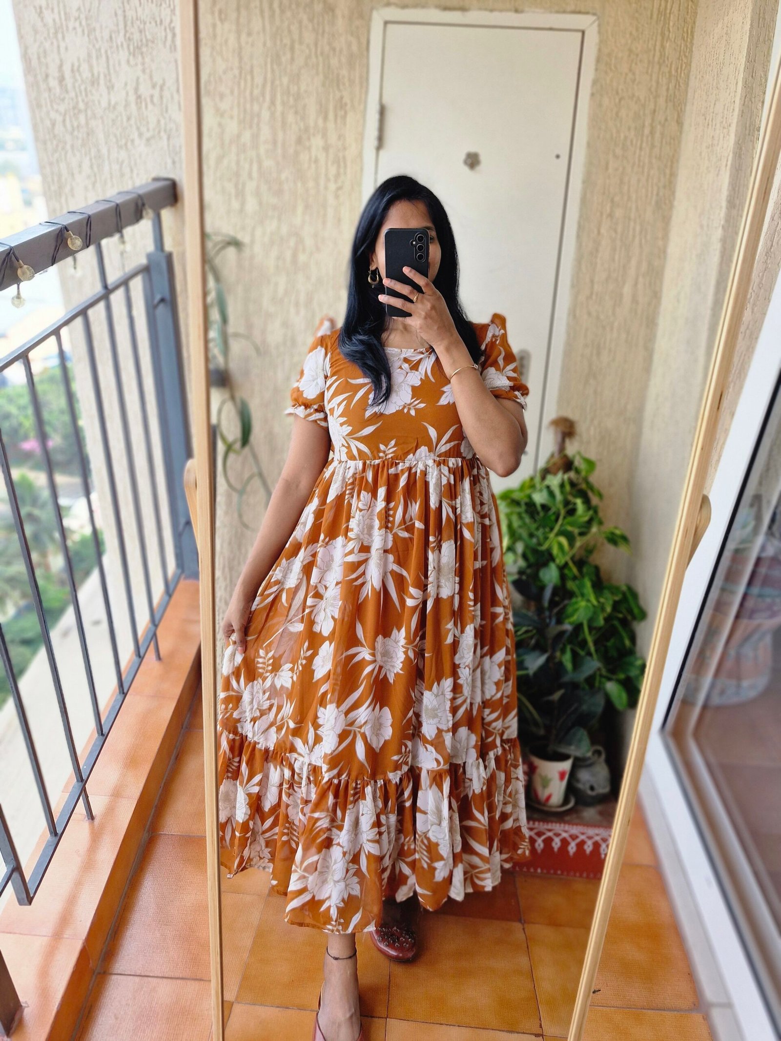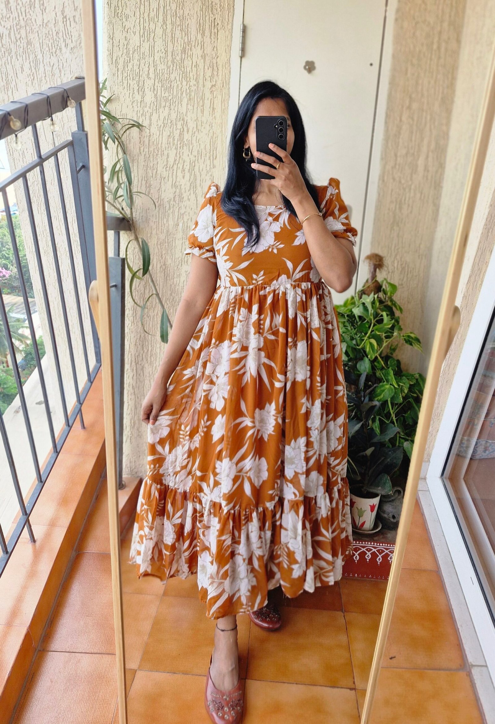 Beautiful burnt orange solid gerogette dress comes with a heavy flare with full lining and a back tieup.Length of the dress is 51 inches.This dress runs exact to bust size .If you are exact 38 please choose one size up if you are less than 38 then choose 38 only.