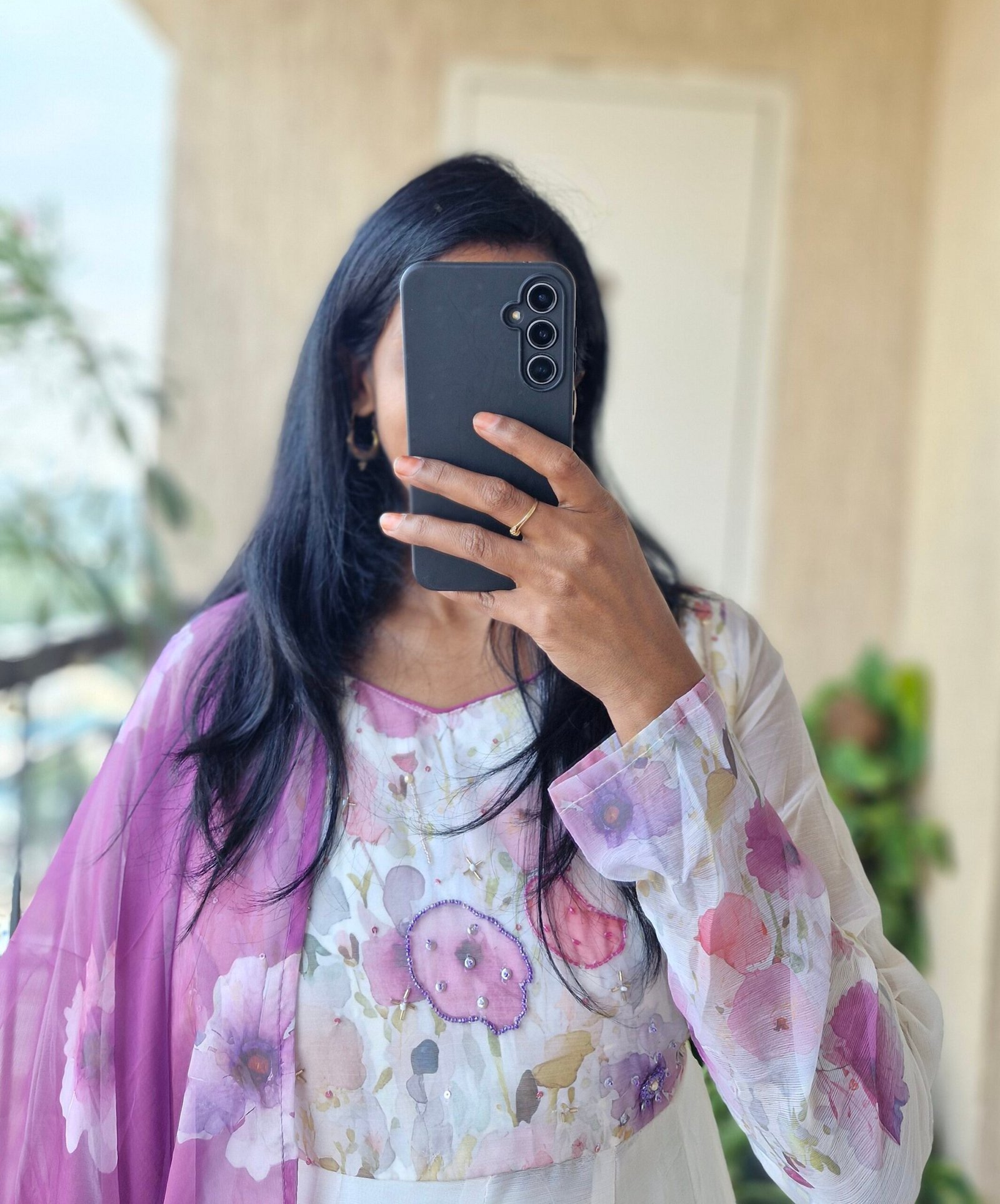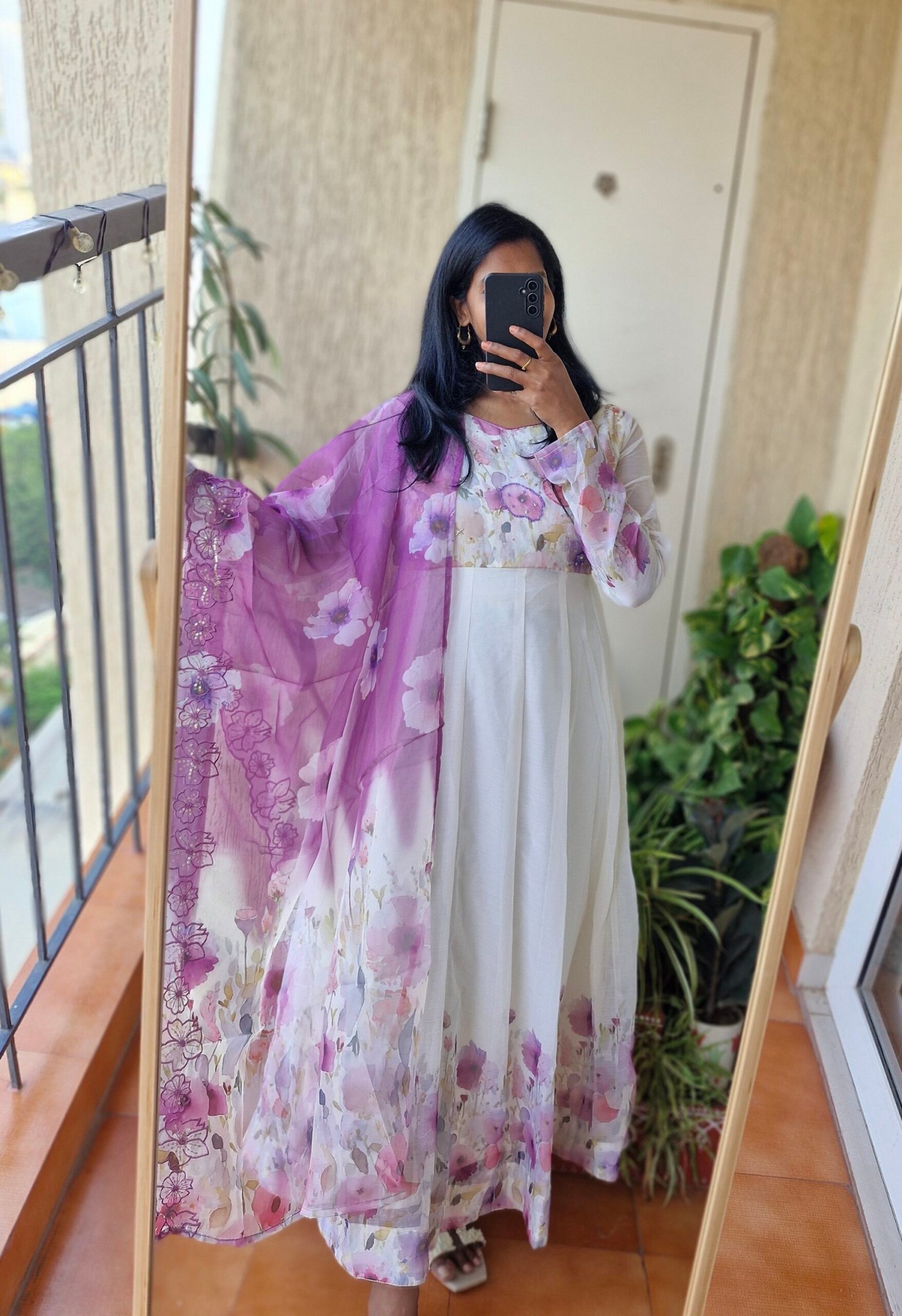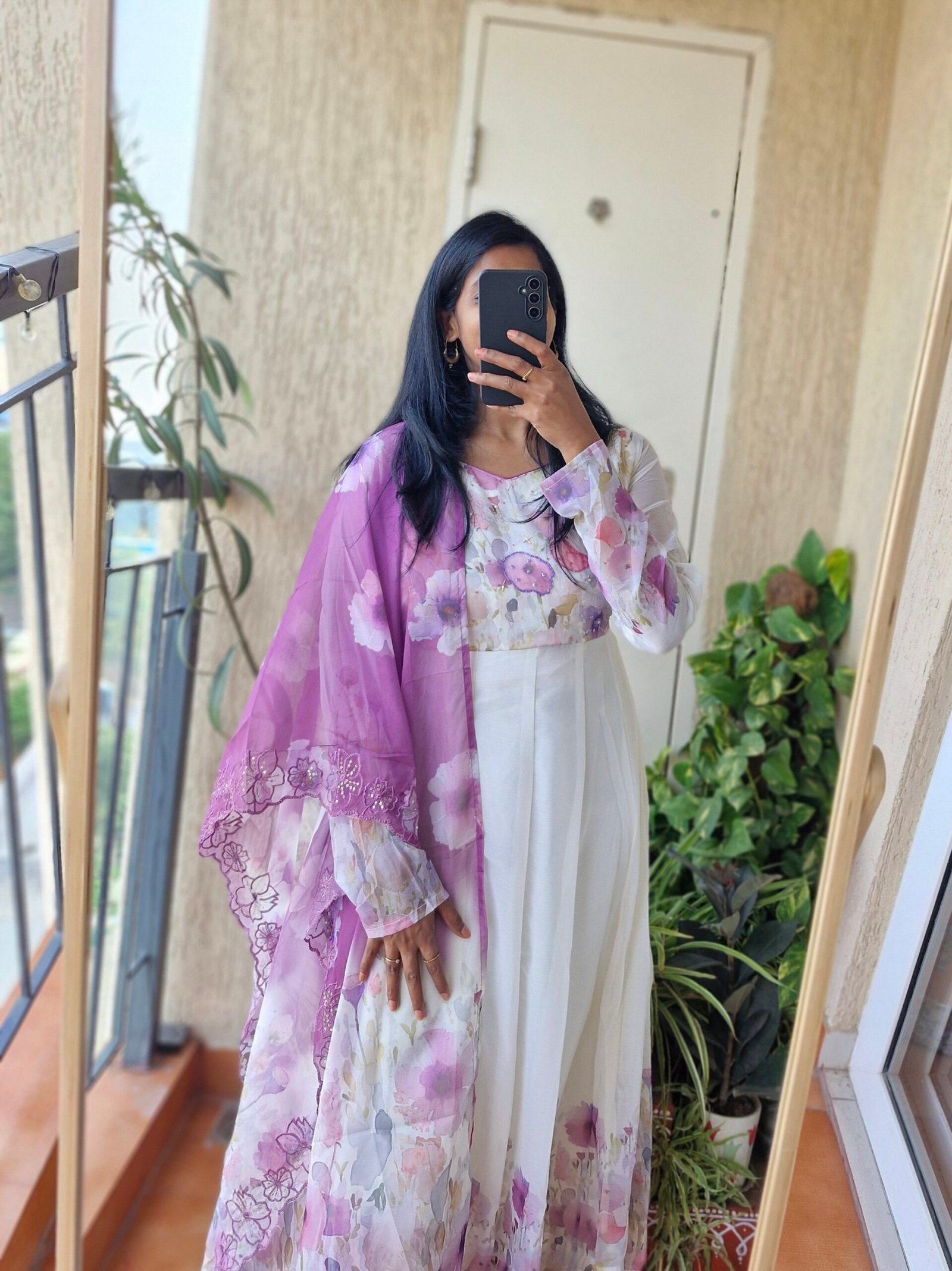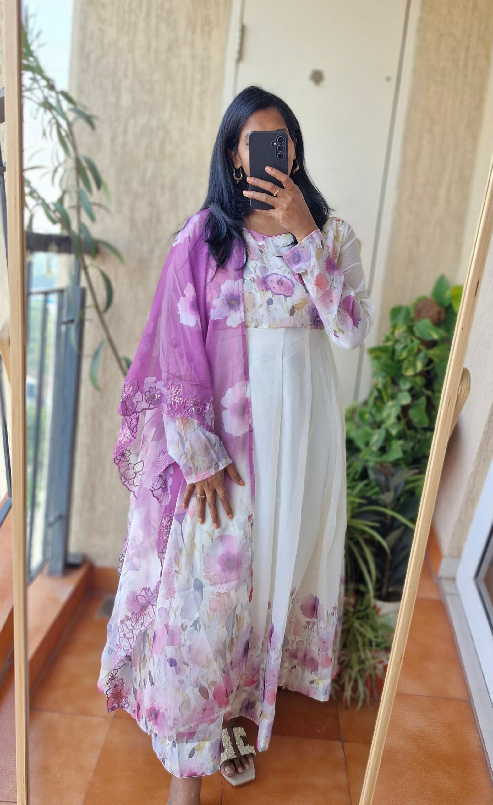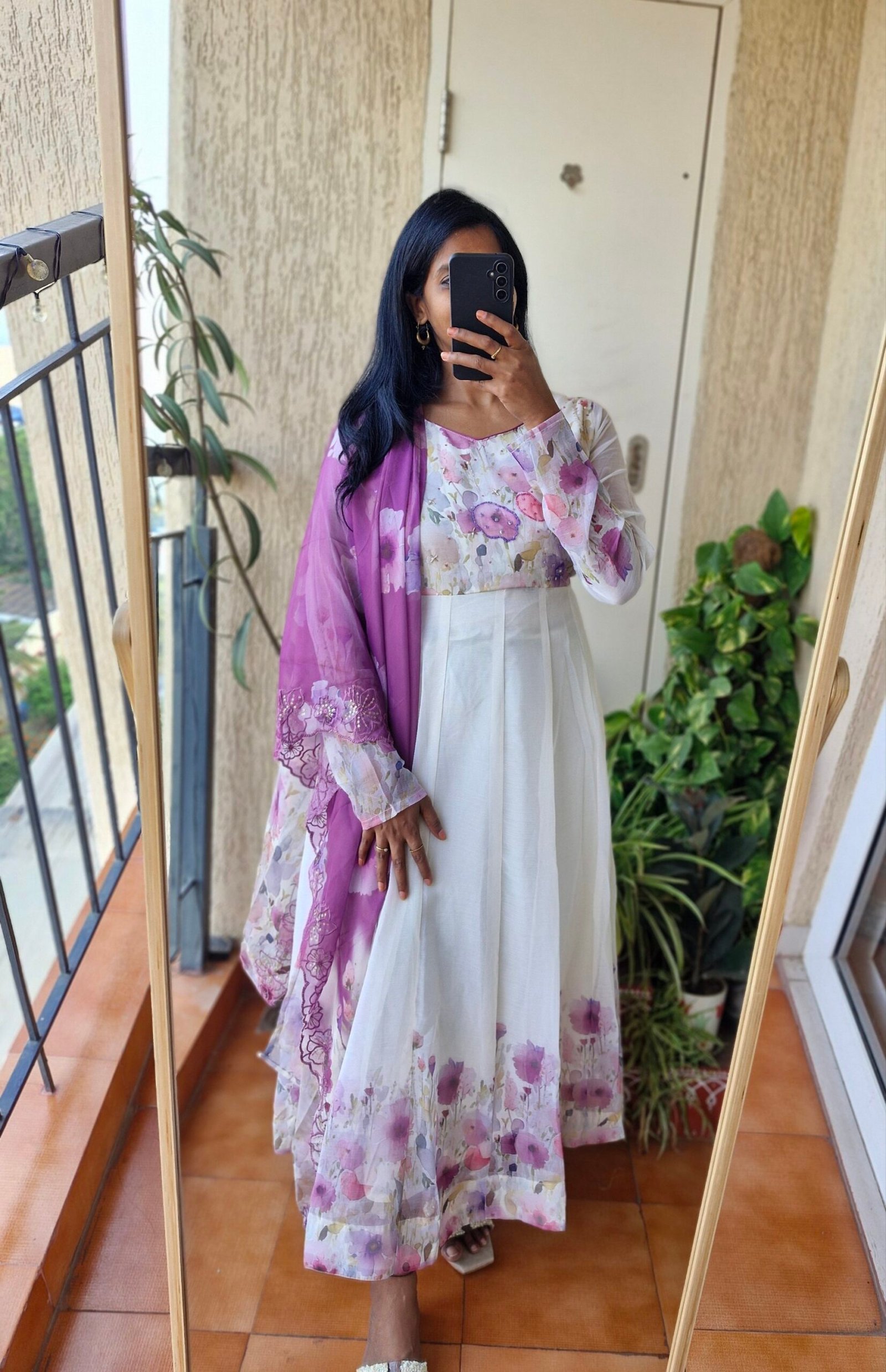 Beautiful chiffon purple anarkali kurta set comes with a organza dhupatta with a sequence work and scallop border.Length of the dress is 51 inches.