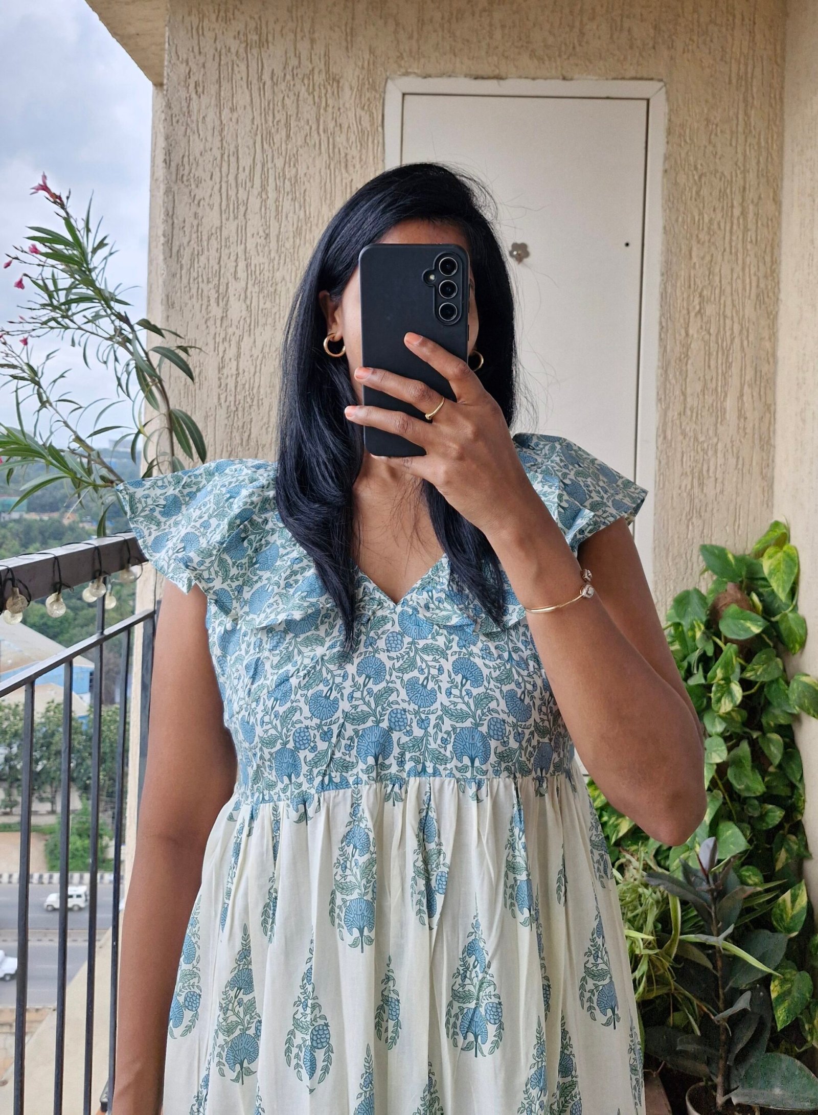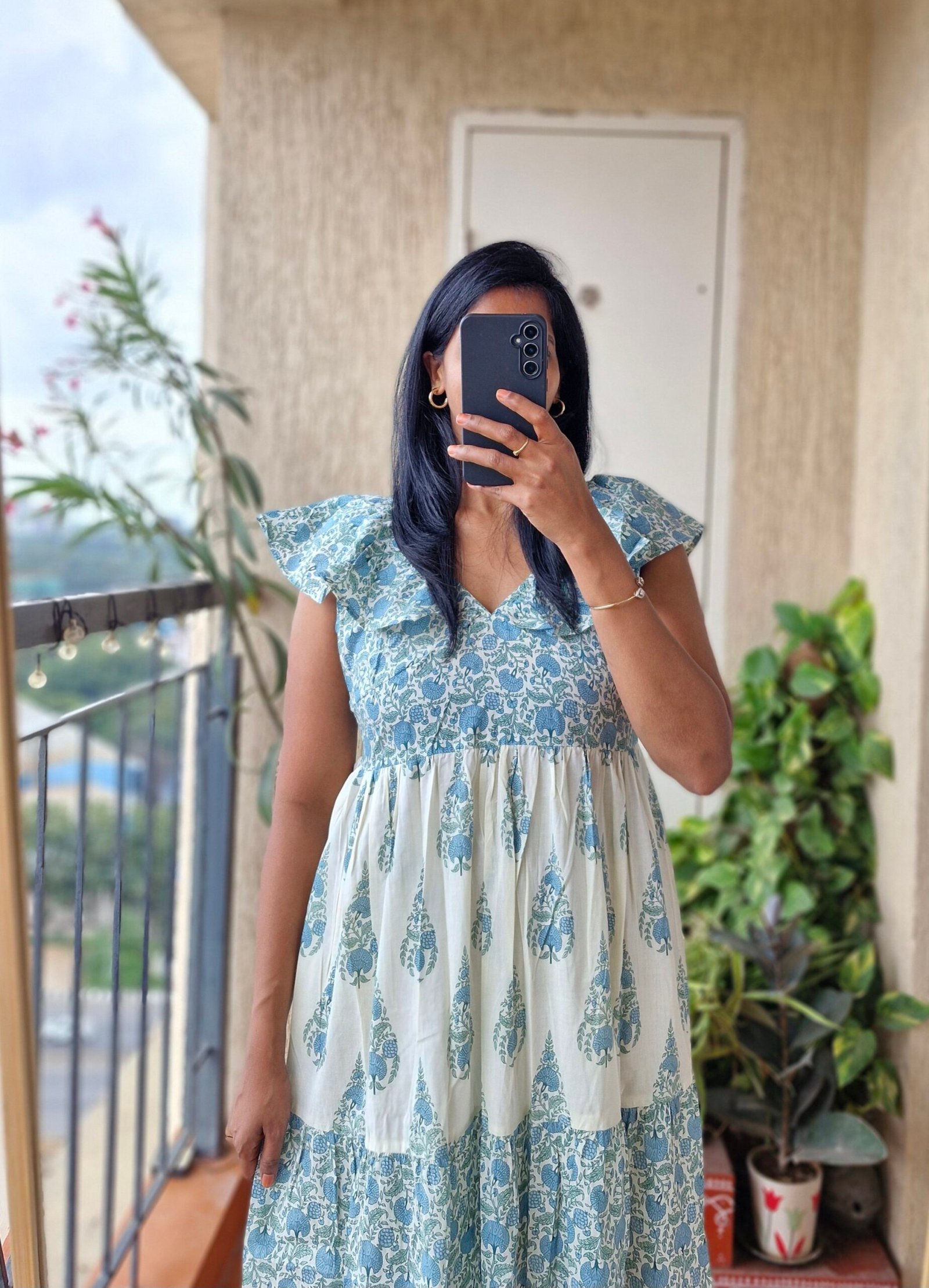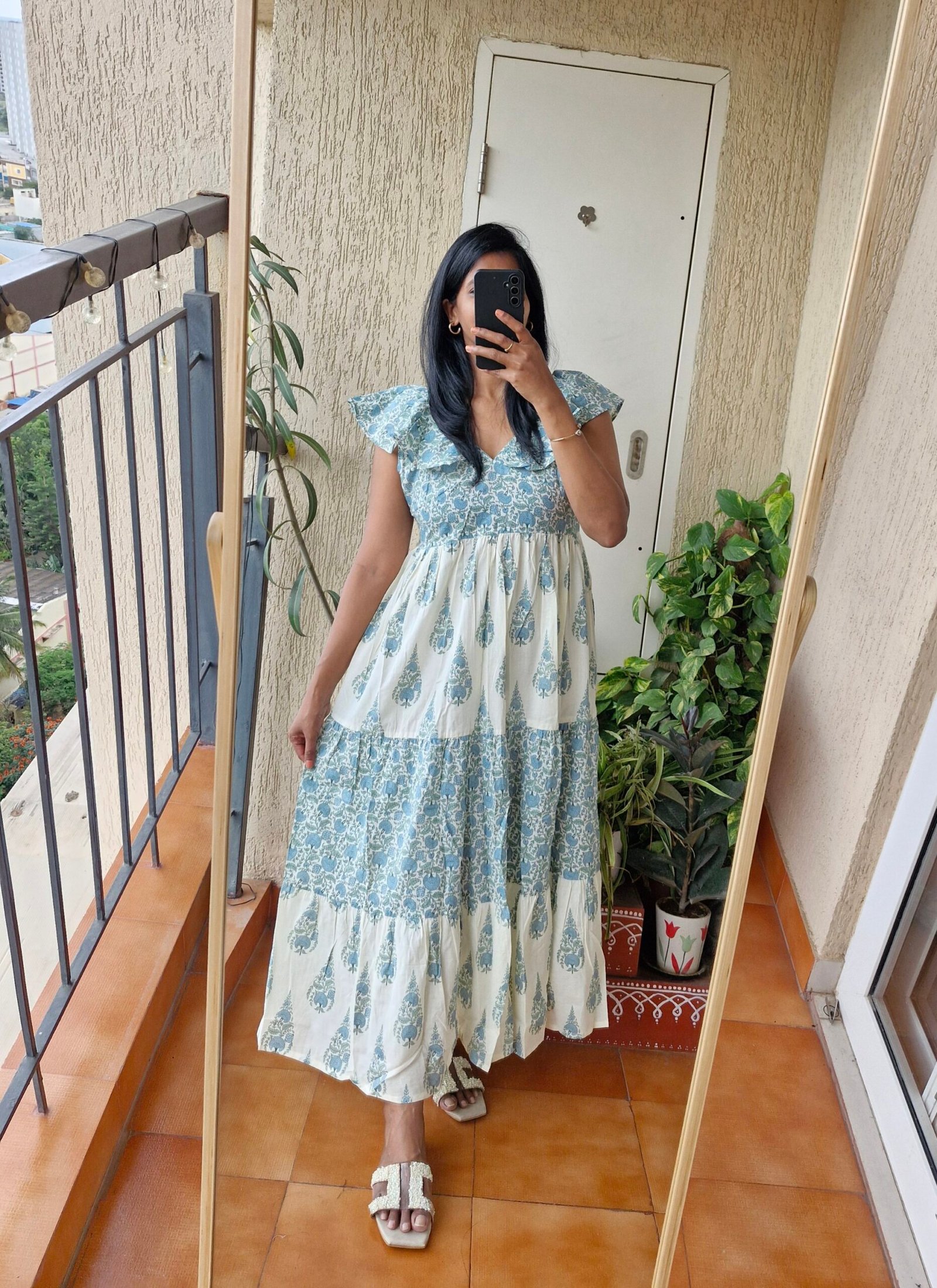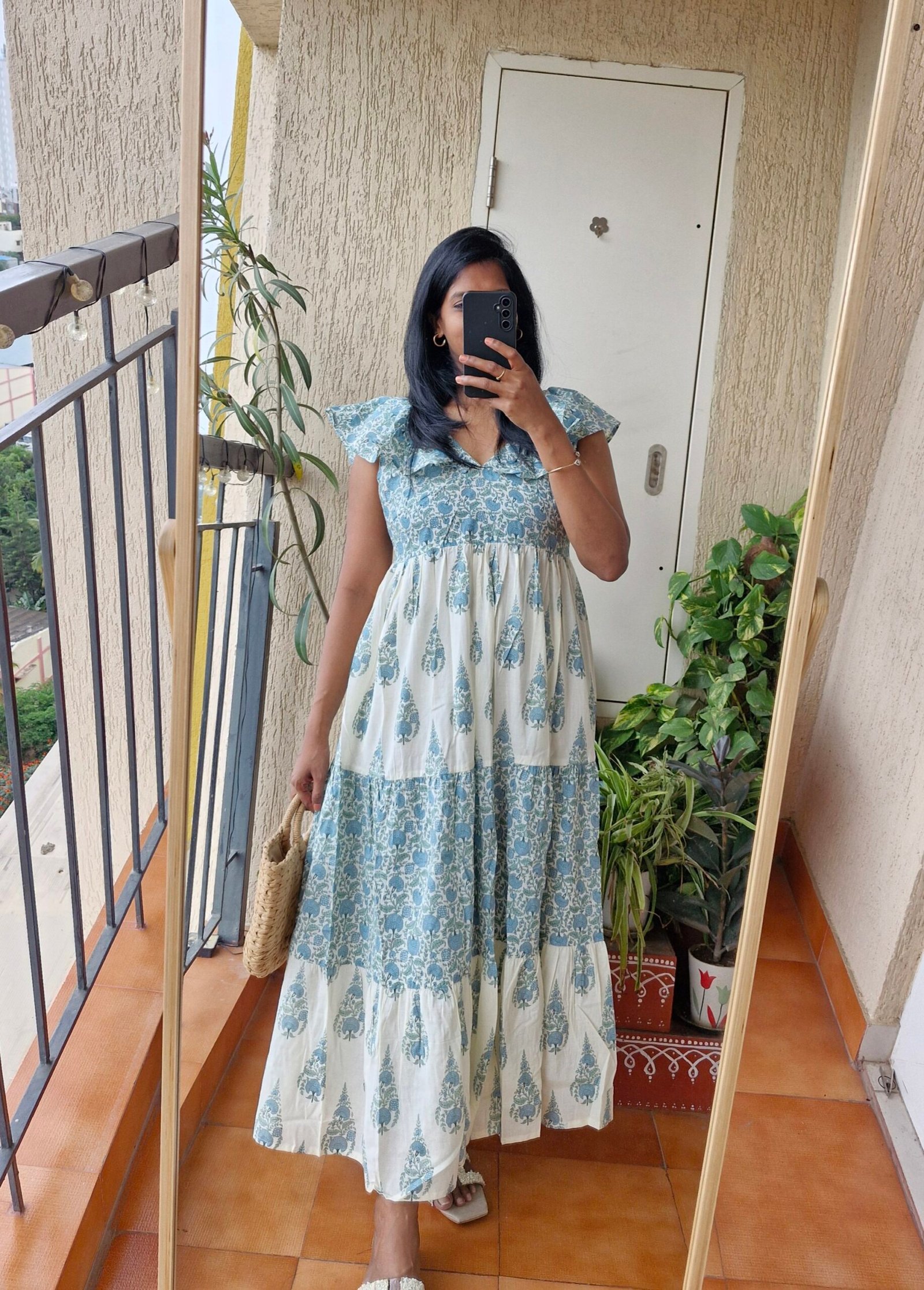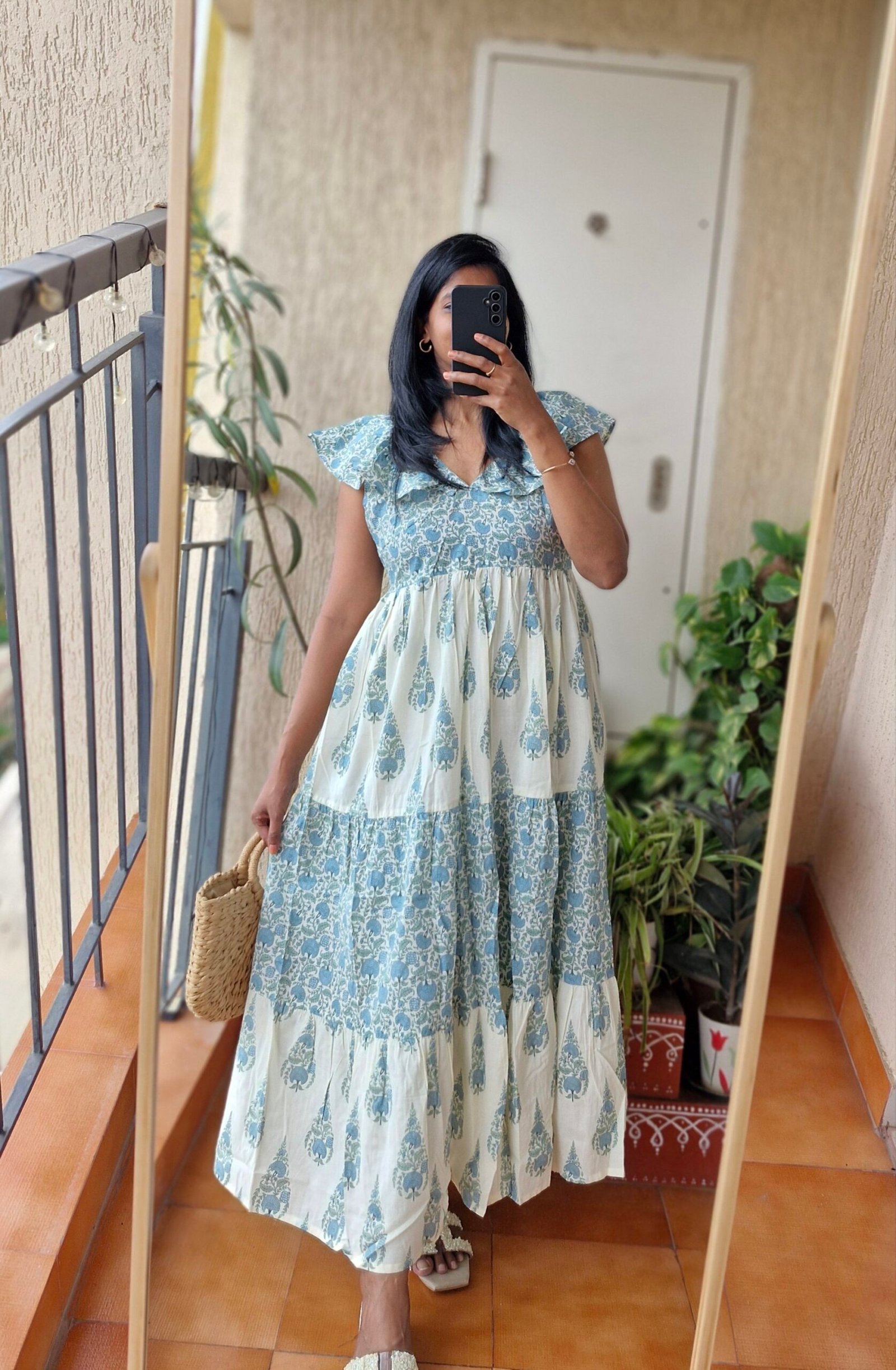 Beautiful Cream/blue block print cotton dress perfect go to vacay/brunch dress and a perfect budget friendly dress. Comes with a length of 53 inches.
