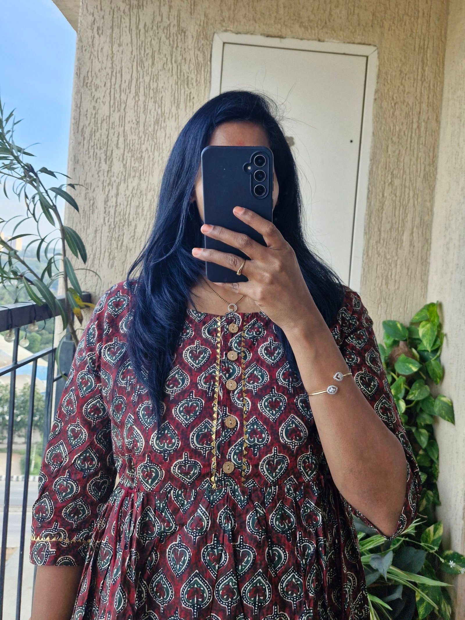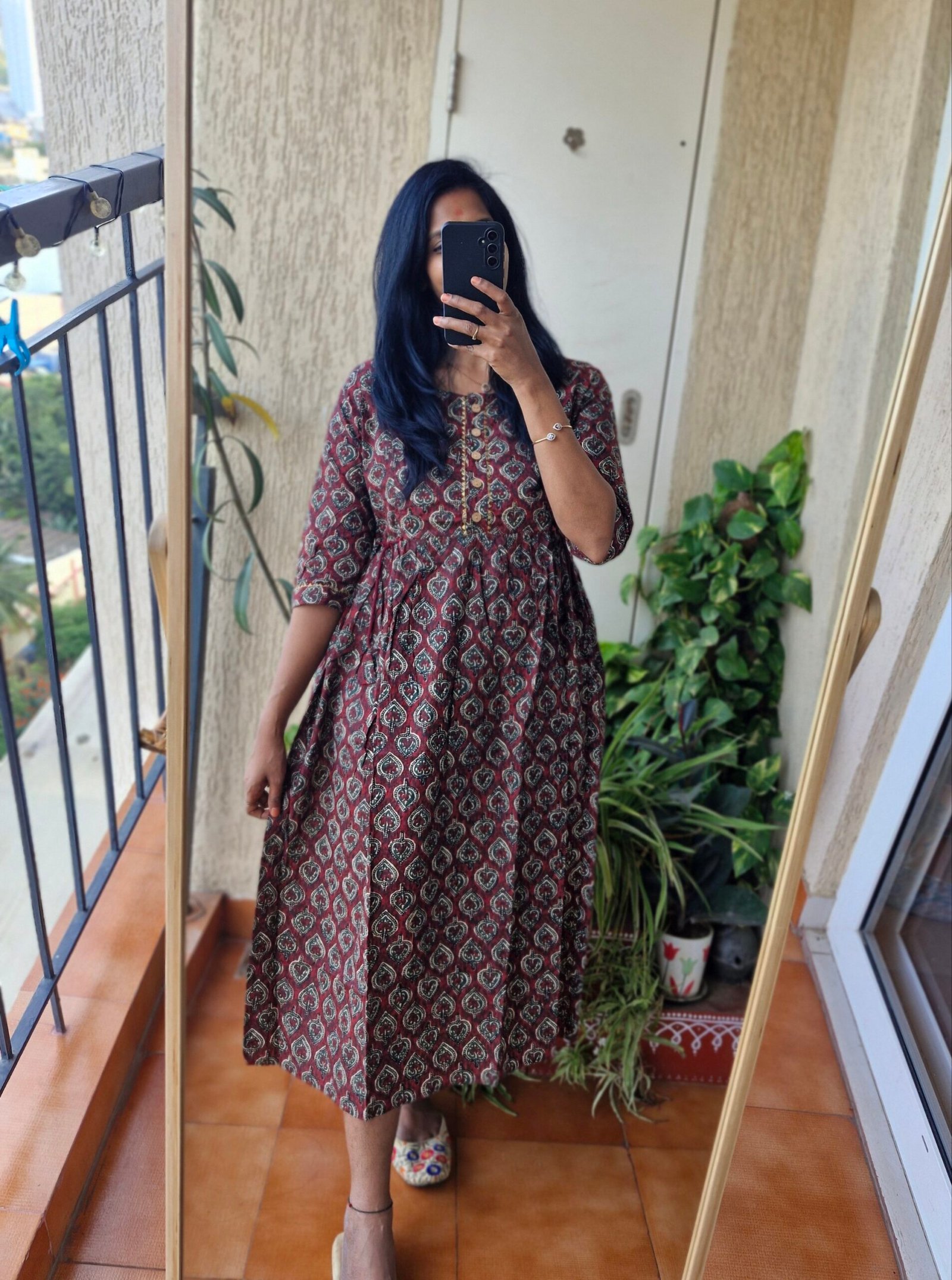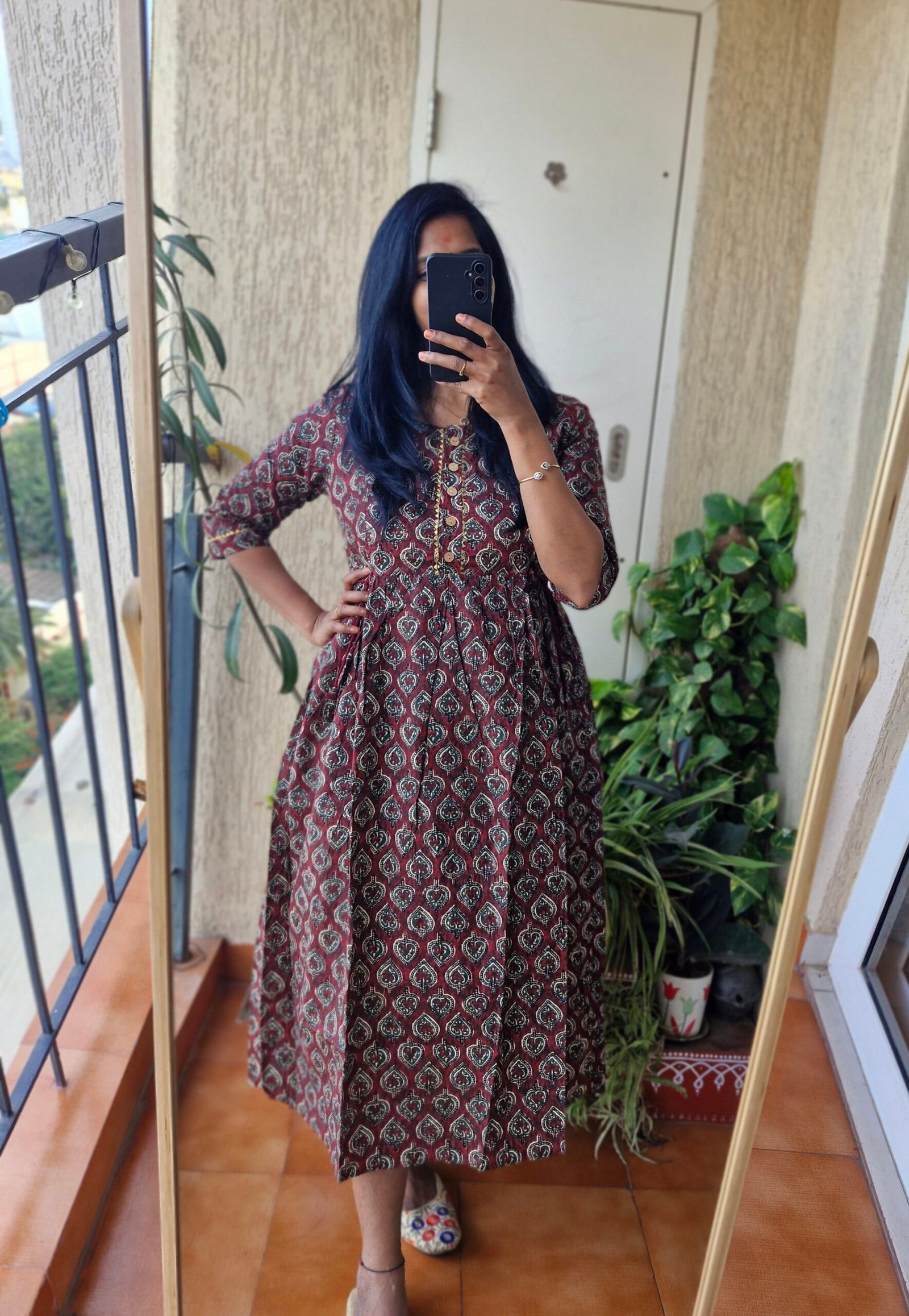 Beautiful dark maroon block print feeding dress comes with two soft zippers and the zippers are neatly enclosed inside comes with a adjustable tieups. Length 0f the dress is 46 inches.