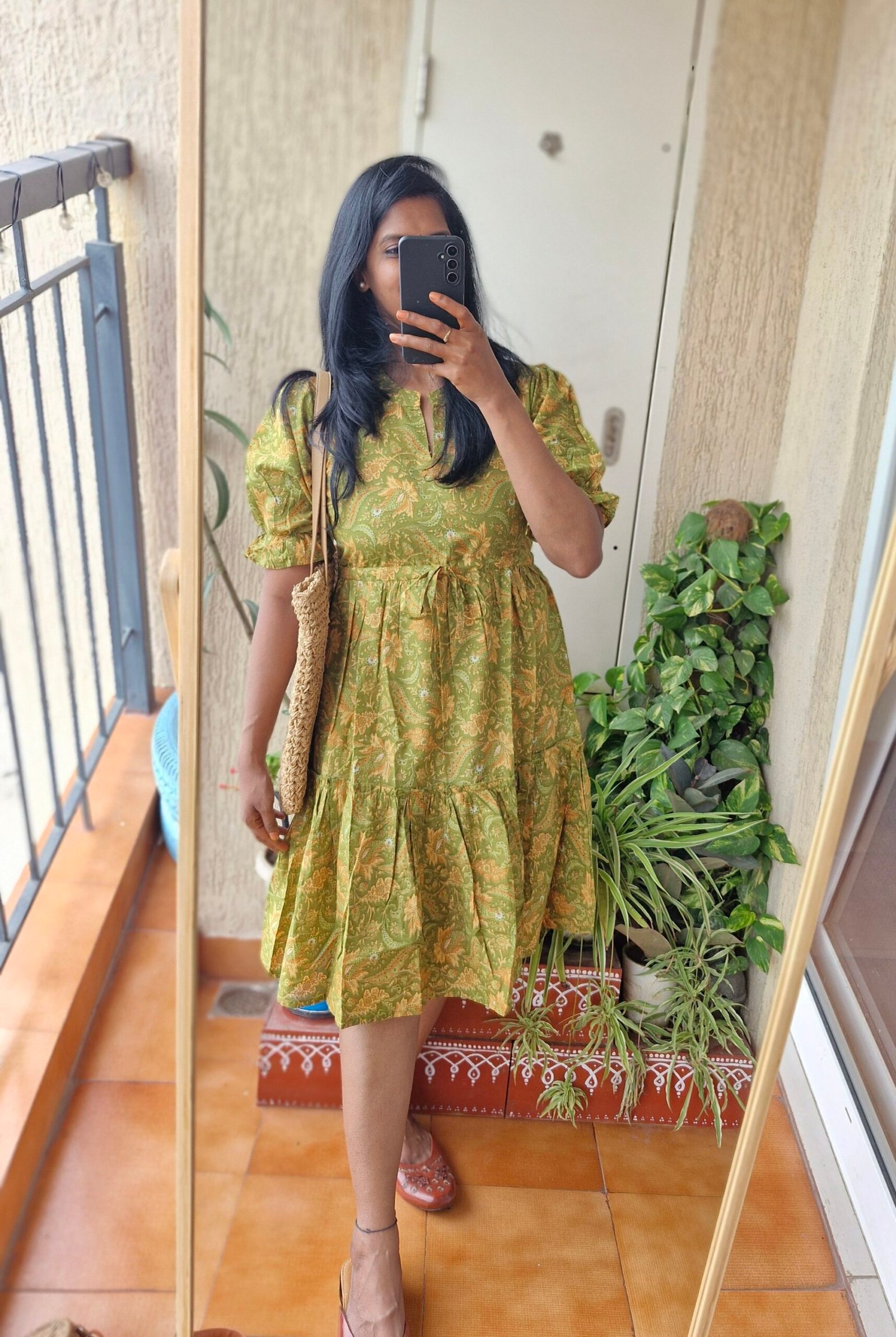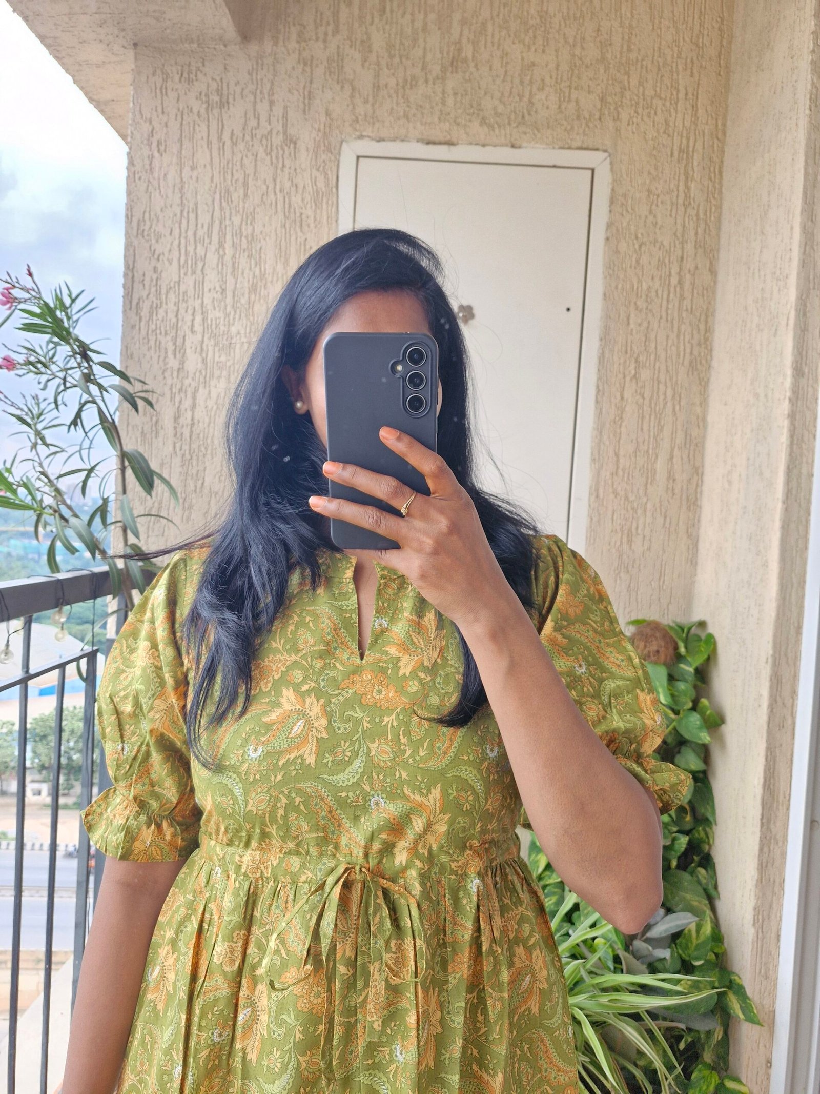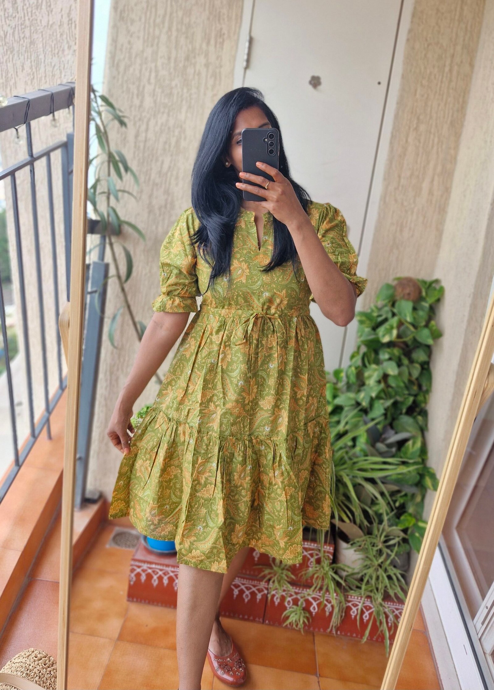 Beautiful green floral cotton dress come tunic with adjustable waist can be worn just like a dress or pair with a legging or a Jean.Length of the dress is 40 inches.