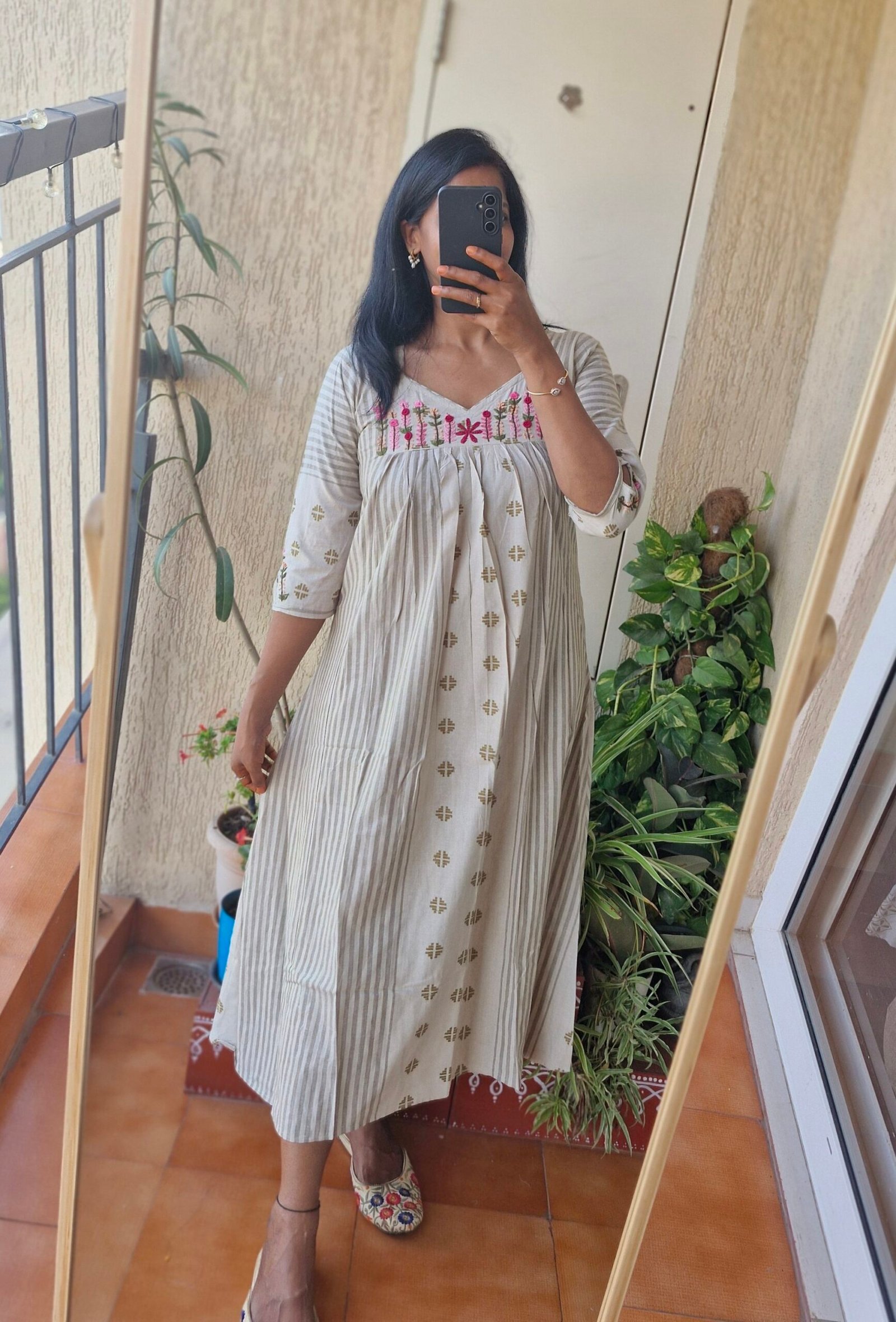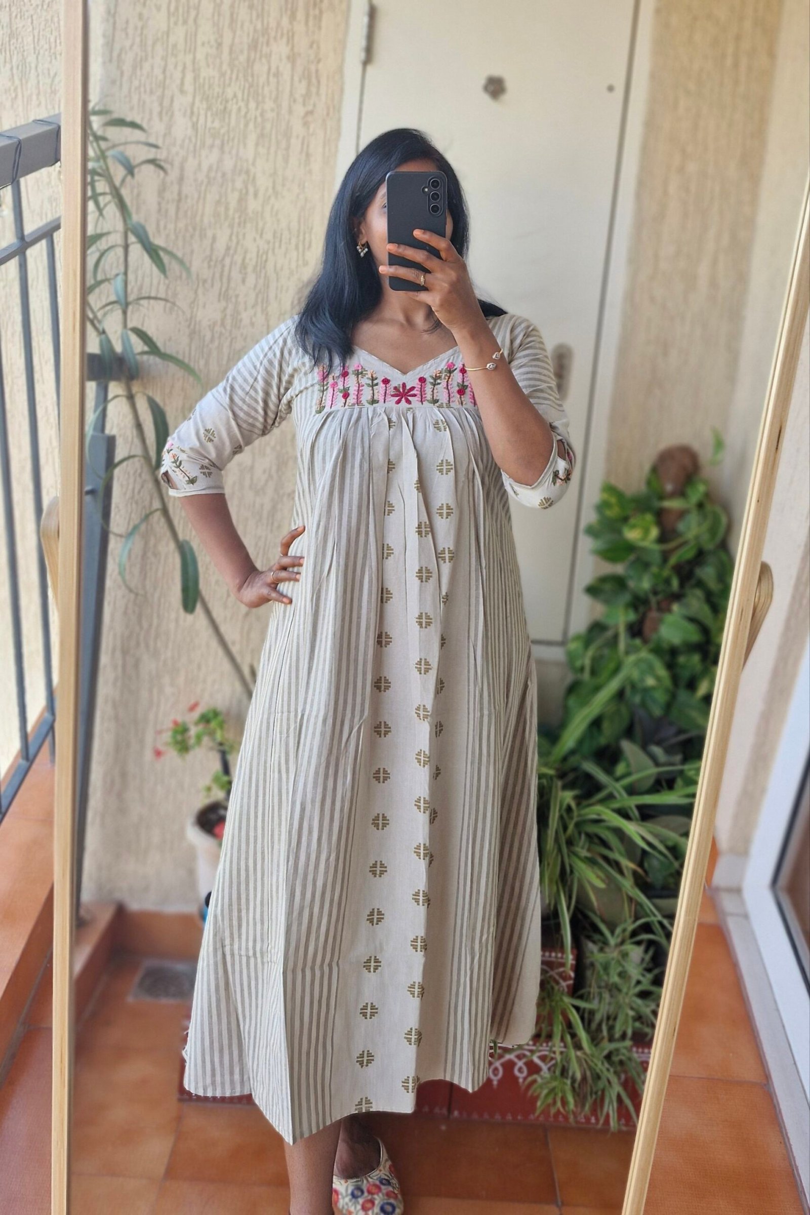 Jamdhani Beige green embroidery kurta comes with an A line cut.Length of the dress is 46 inches.