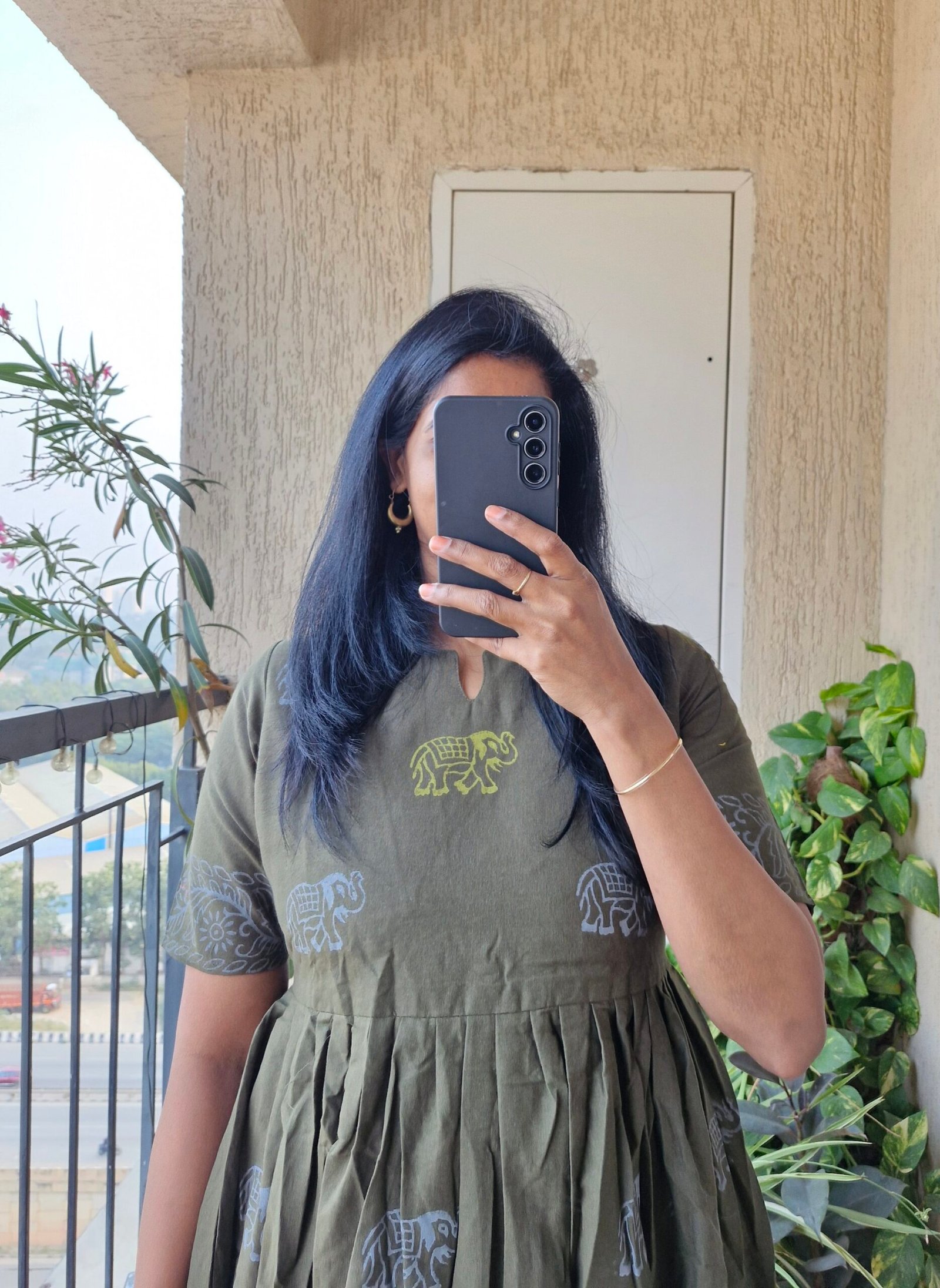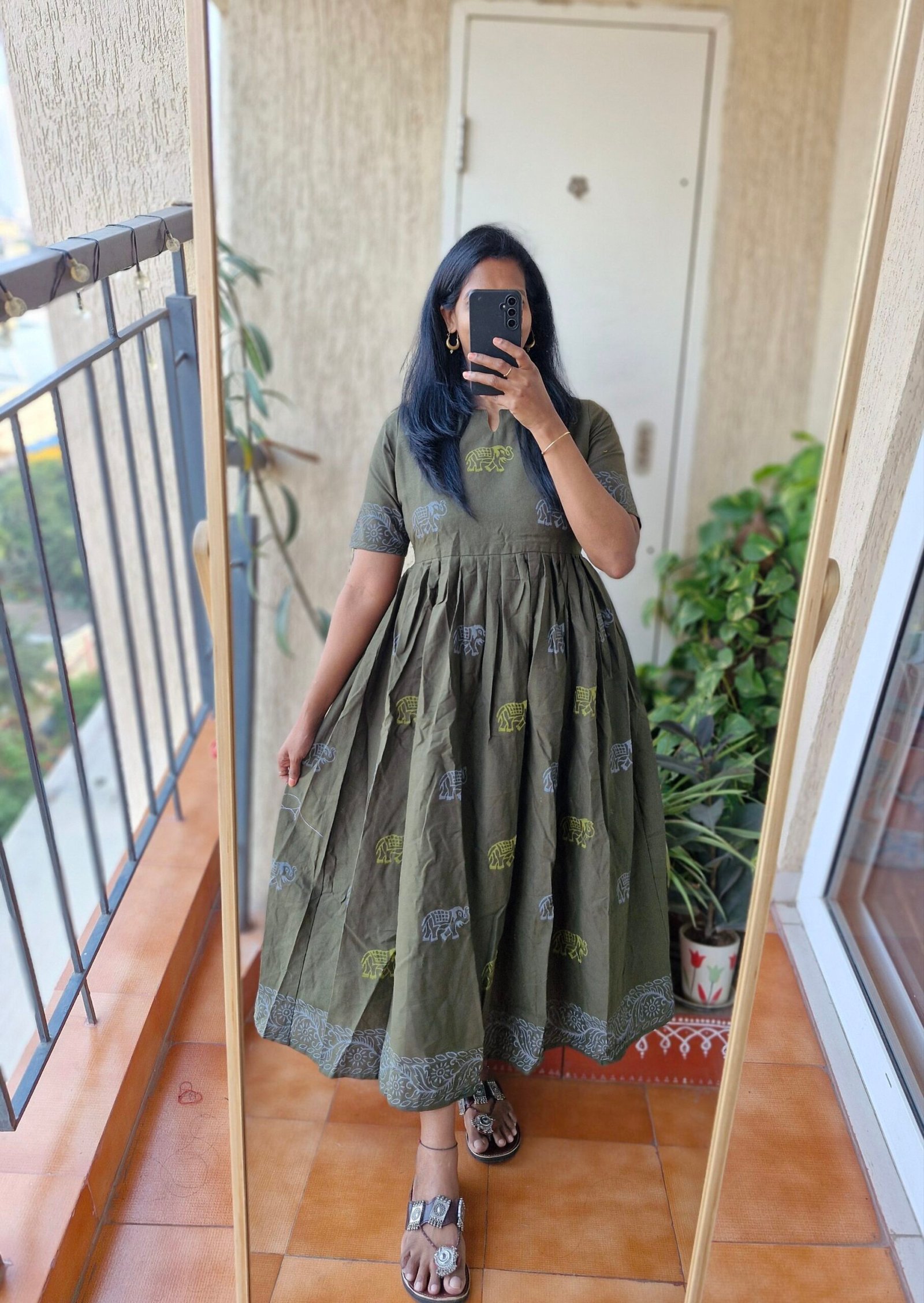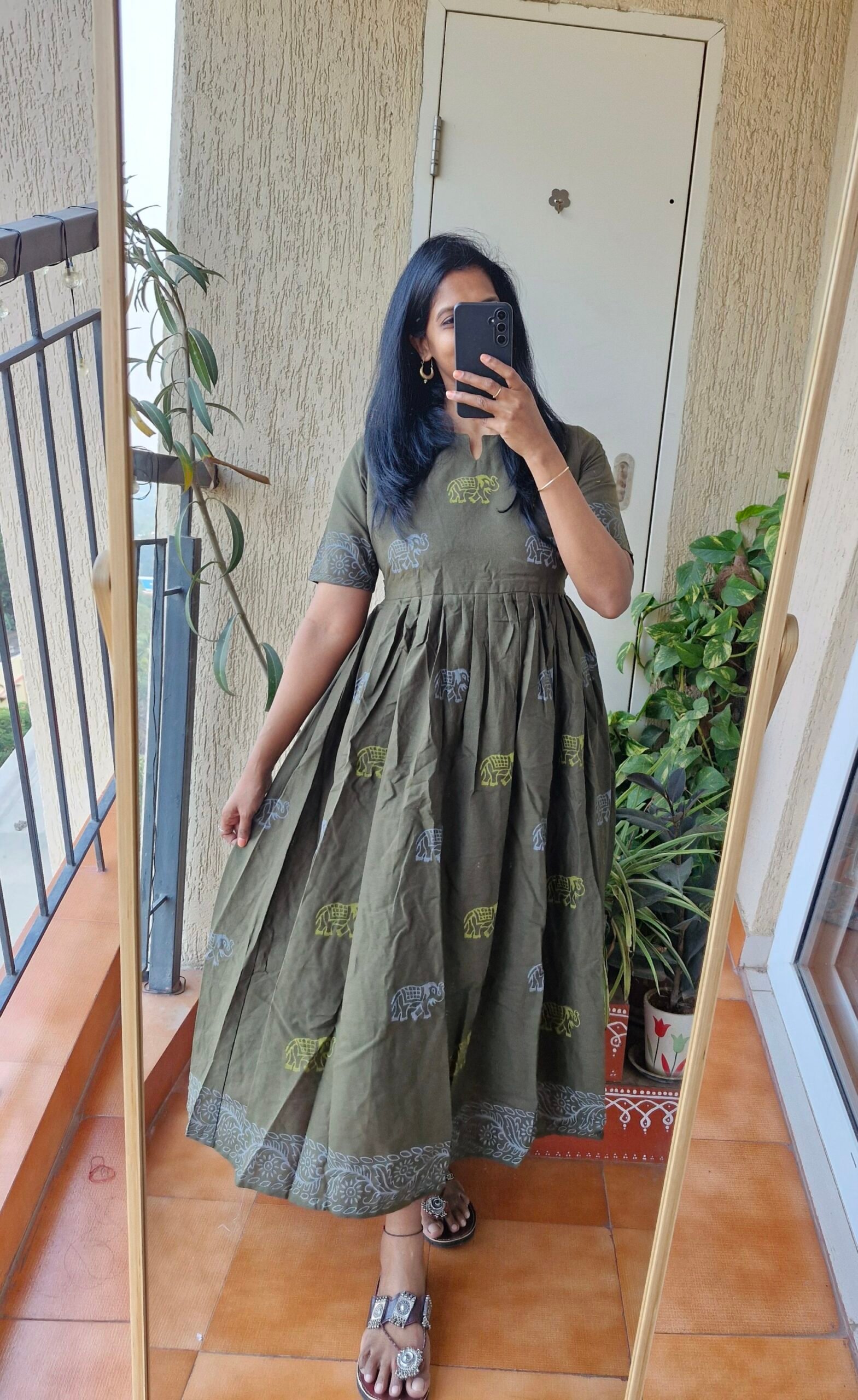 Beautiful olive green Khaadi Handblock elephant dress with a beautiful block print borders all over the dress comes with a back tieup and with a length of 48 inches.Yoke part has lining.This dress runs little lower than actual size so please choose one size up than usual.If you are bust size is exact 38 choose next size if it less than 38 go for 38.