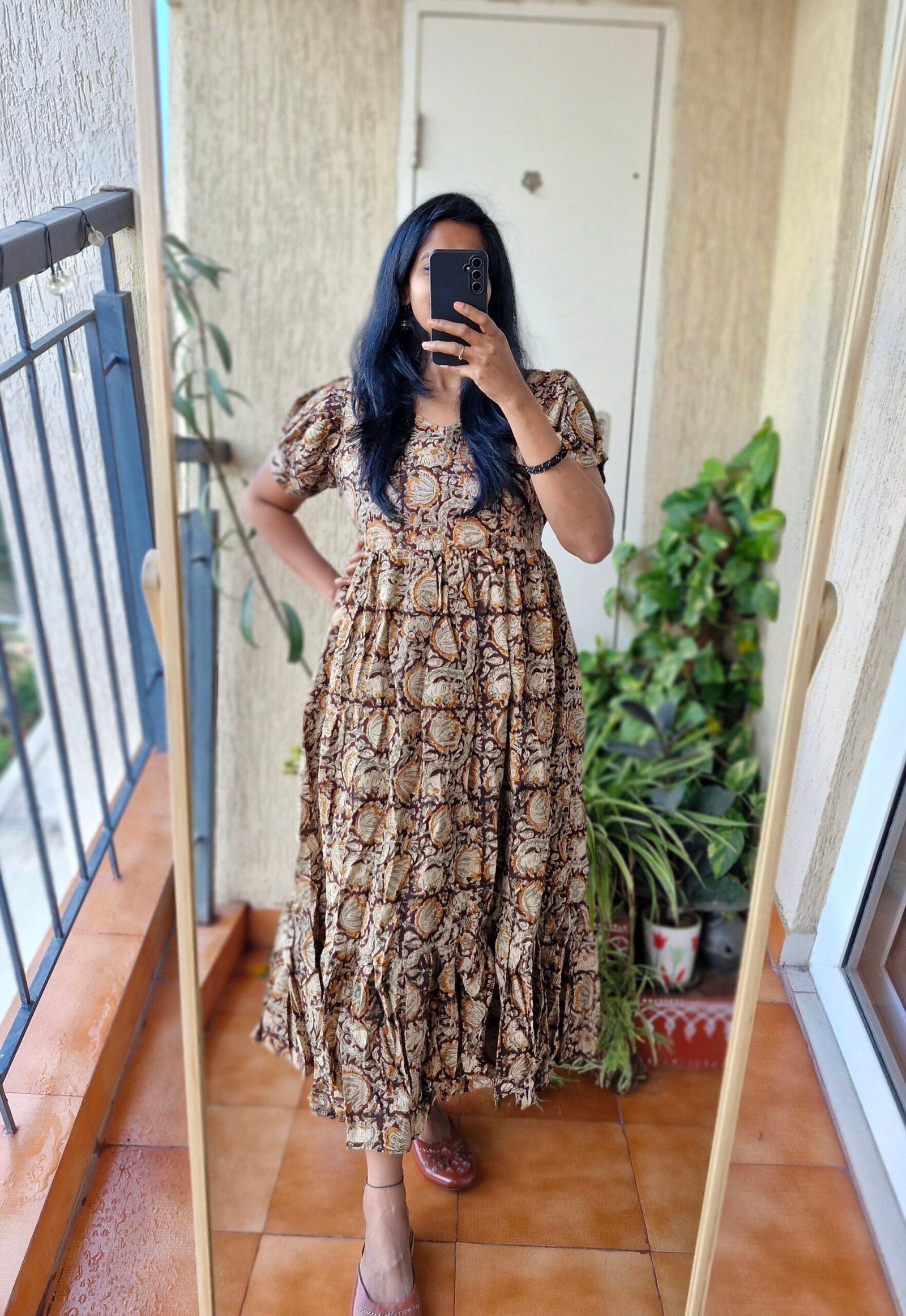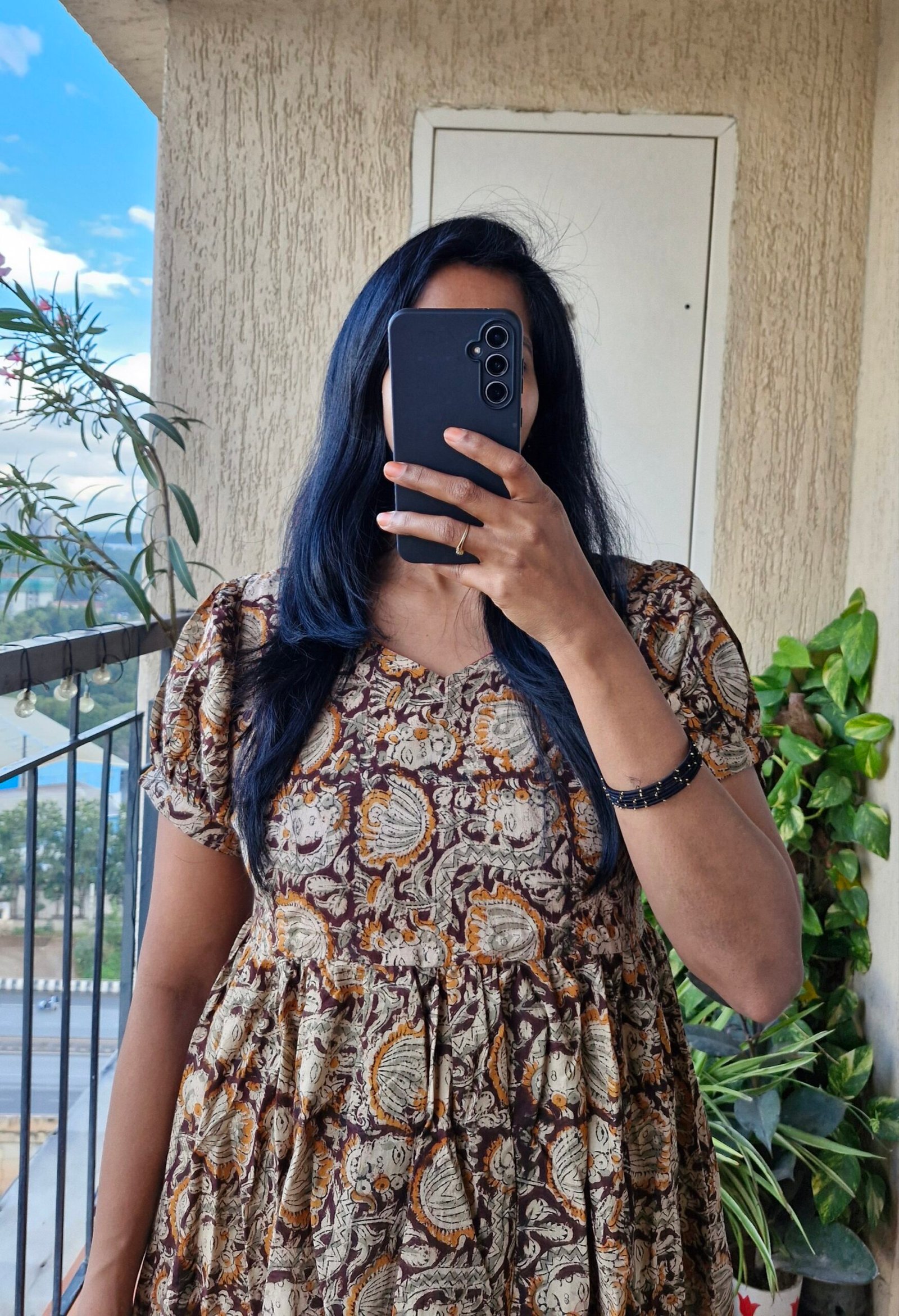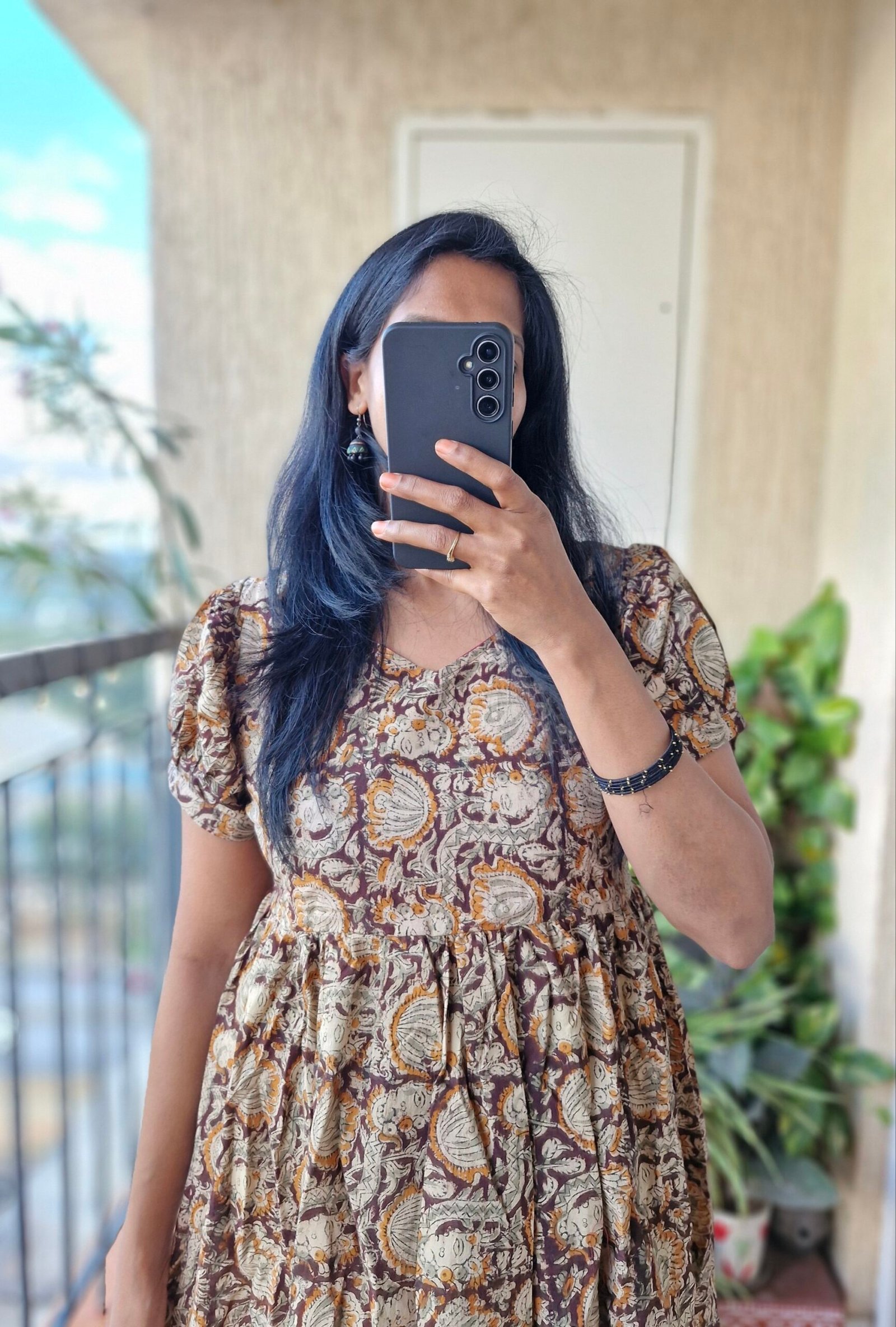 Beautiful kalamkaari brown floral handloom cotton dress comes with a back tie up and the length of the dress is 50 inches.This dress runs little lower than actual size so we have made L(40) as M(38). Please choose as per your bust size and do not choose bigger size as we have already adusted to right size with enough margin!