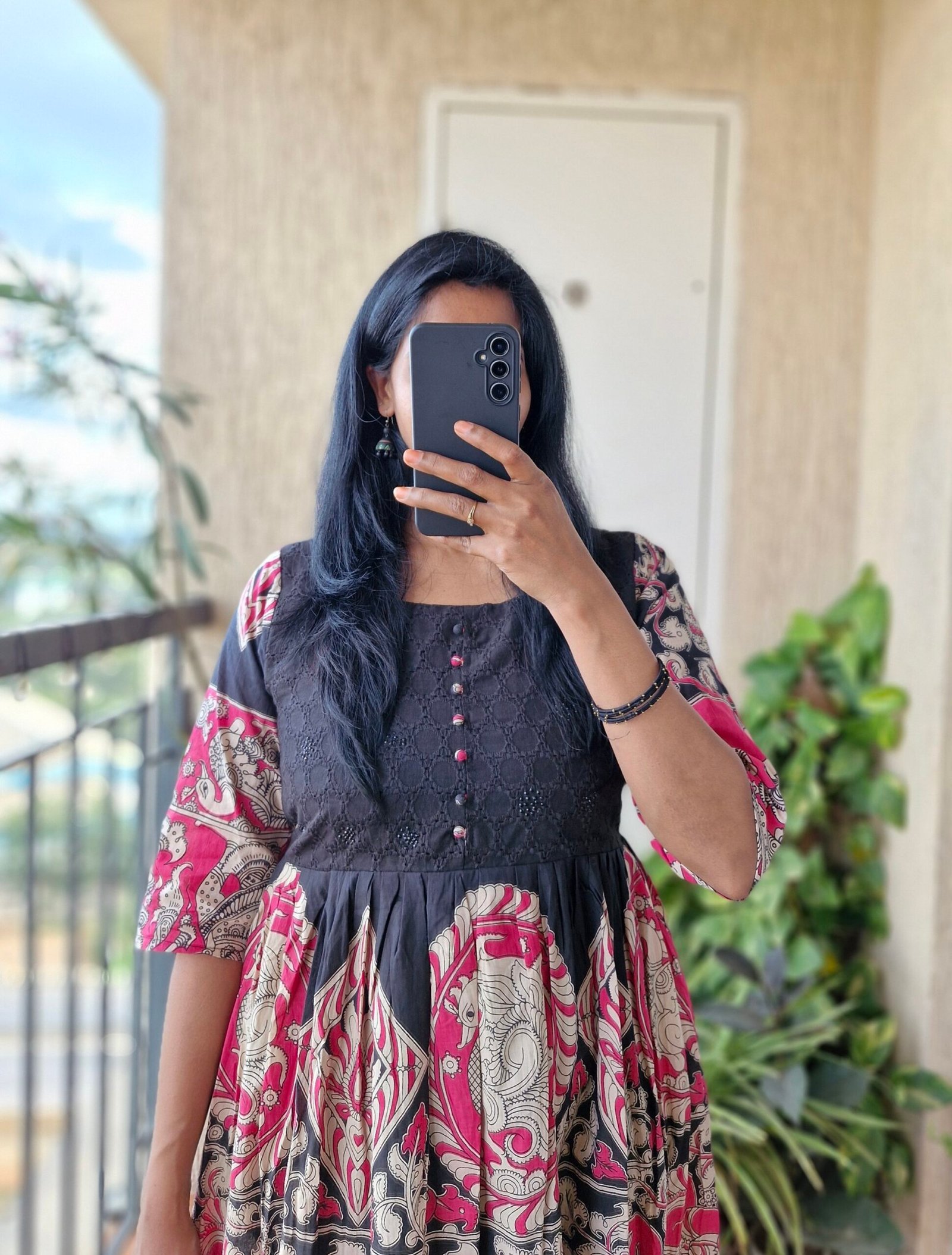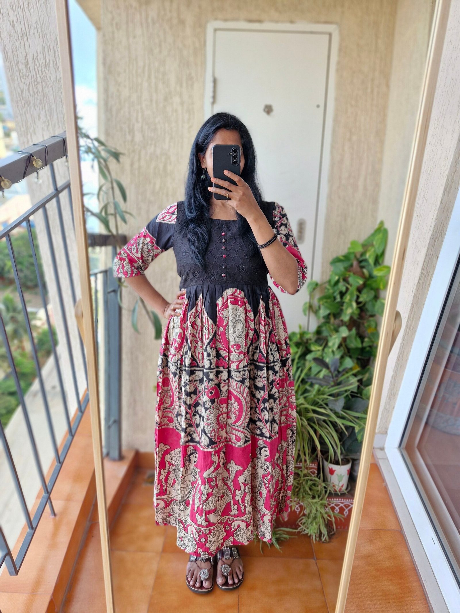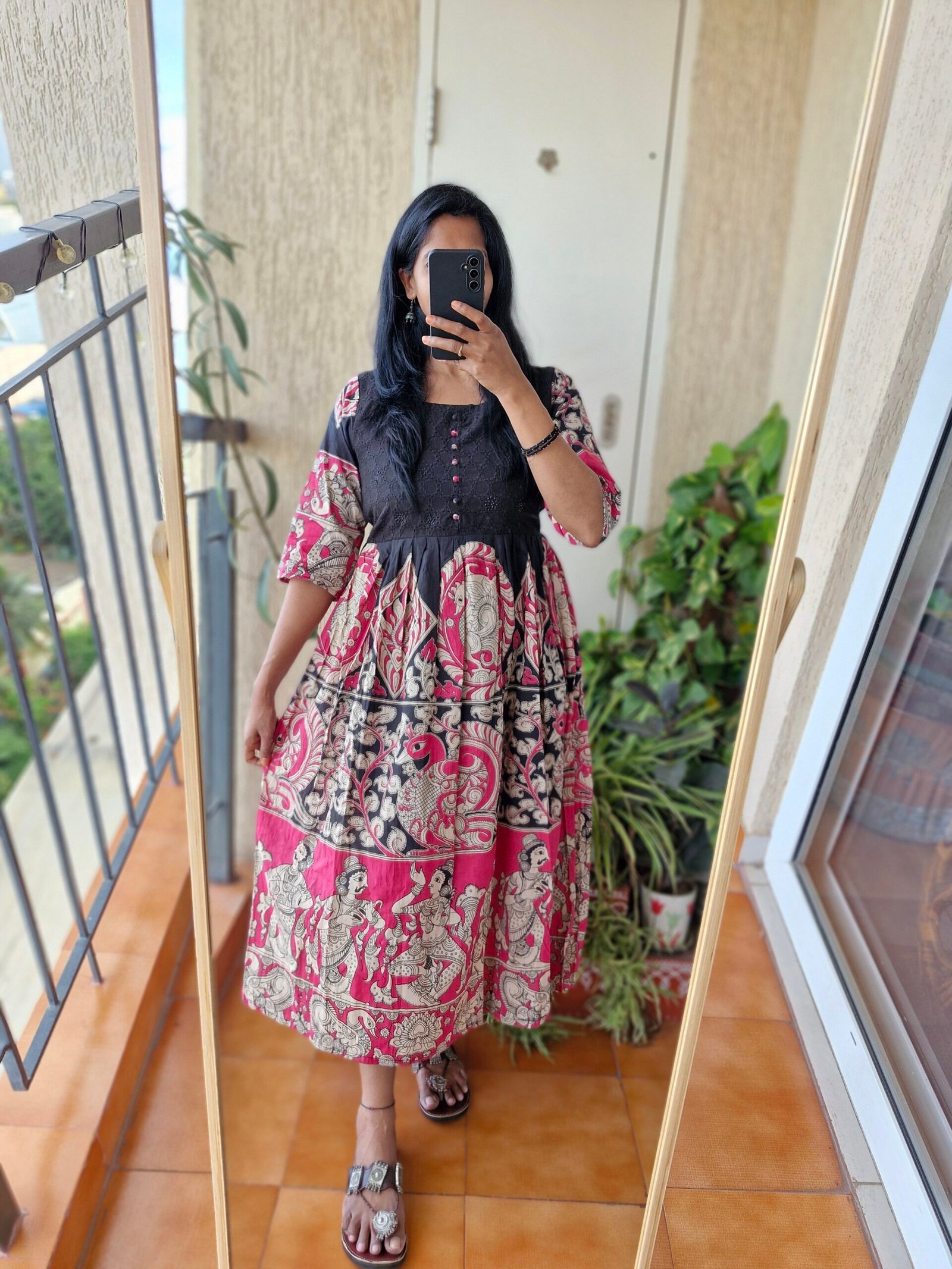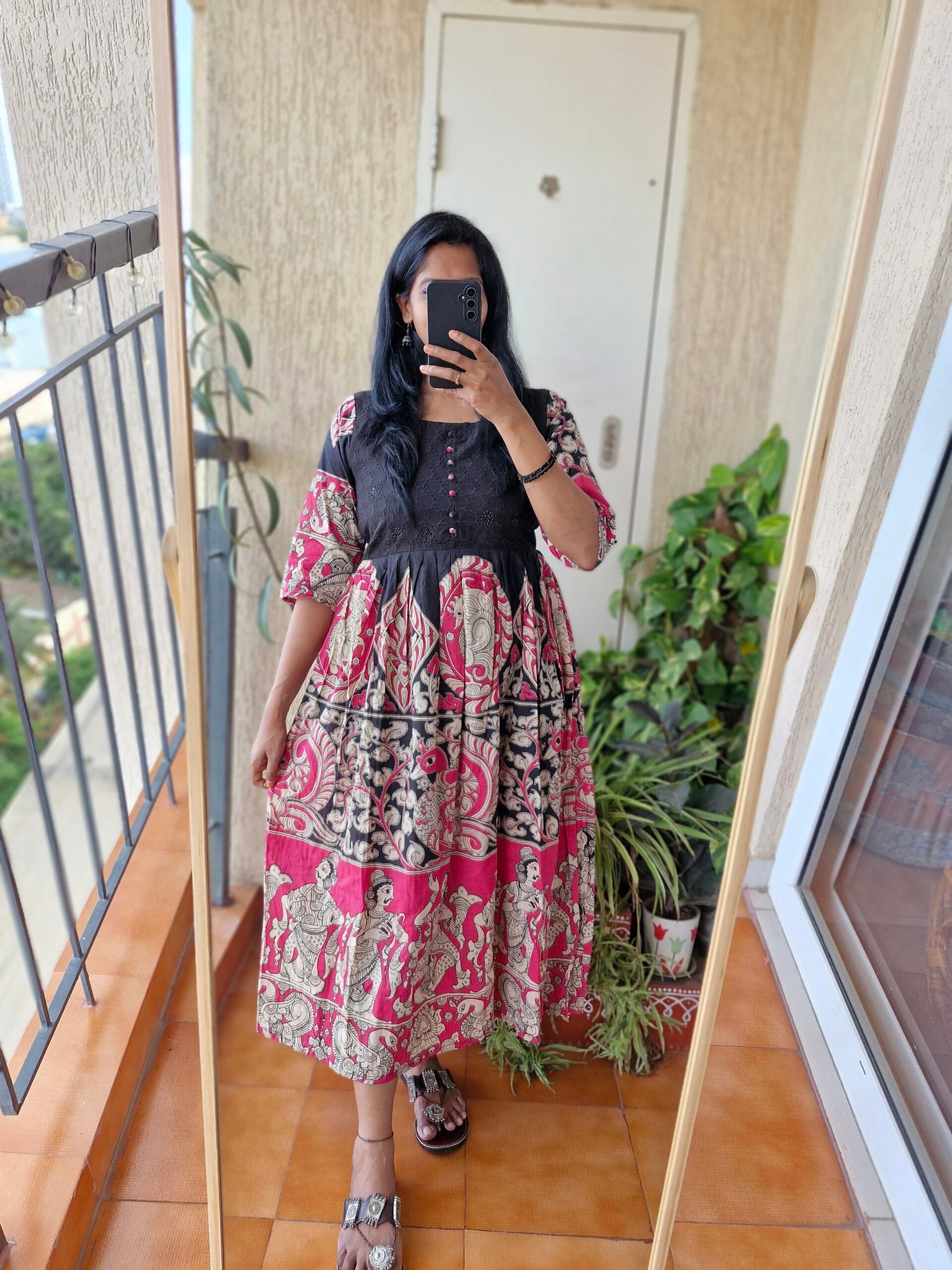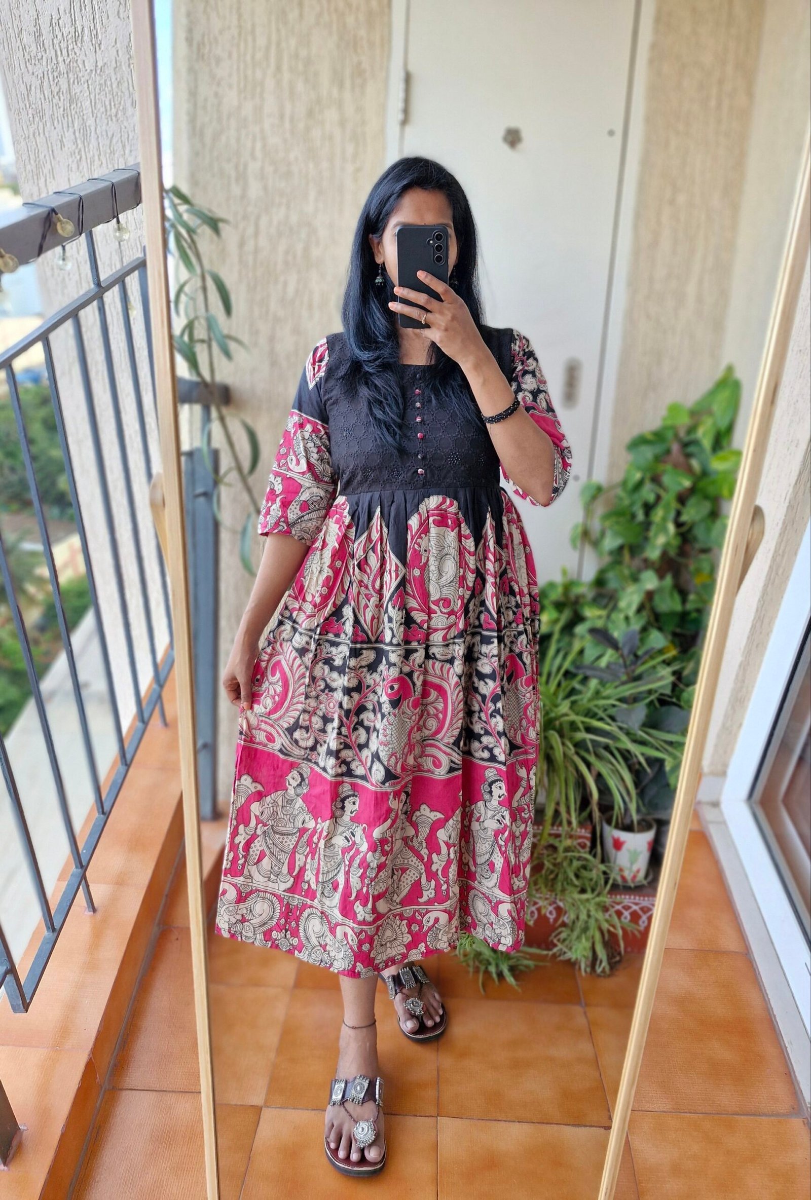 Beautiful kalamkaari hakoba dress comes with a back neck tieups with a length of 48 inches. Yoke part has lining.Runs exact to size. If you are exact 38 choose next size if you are less than 38 choose 38.
