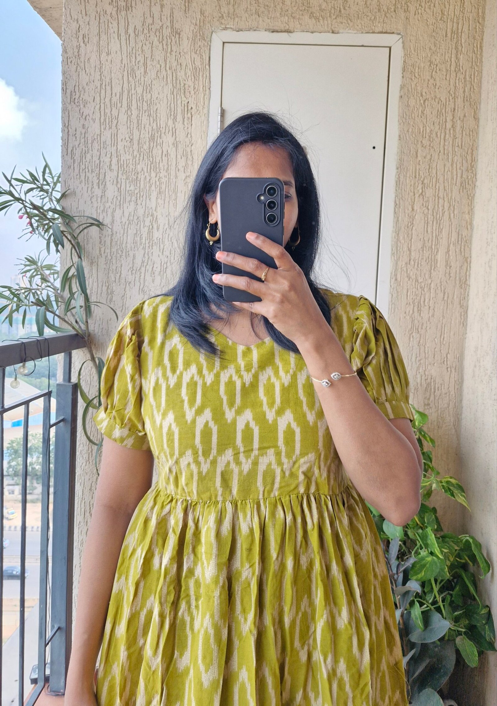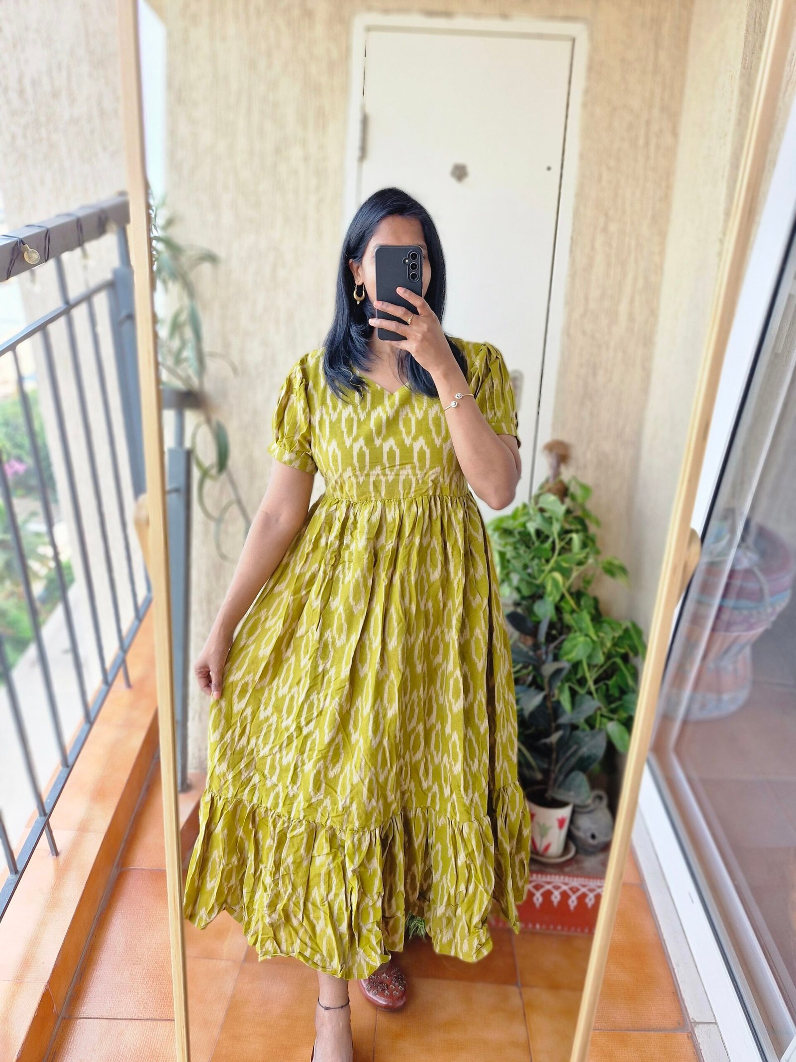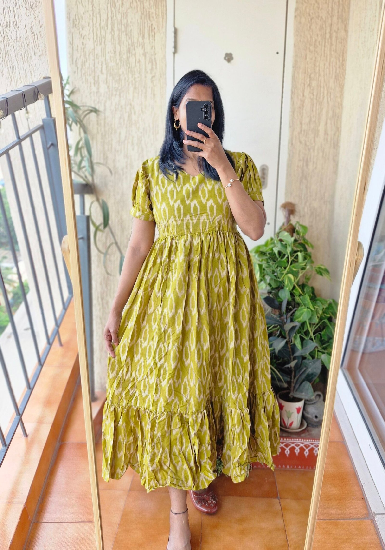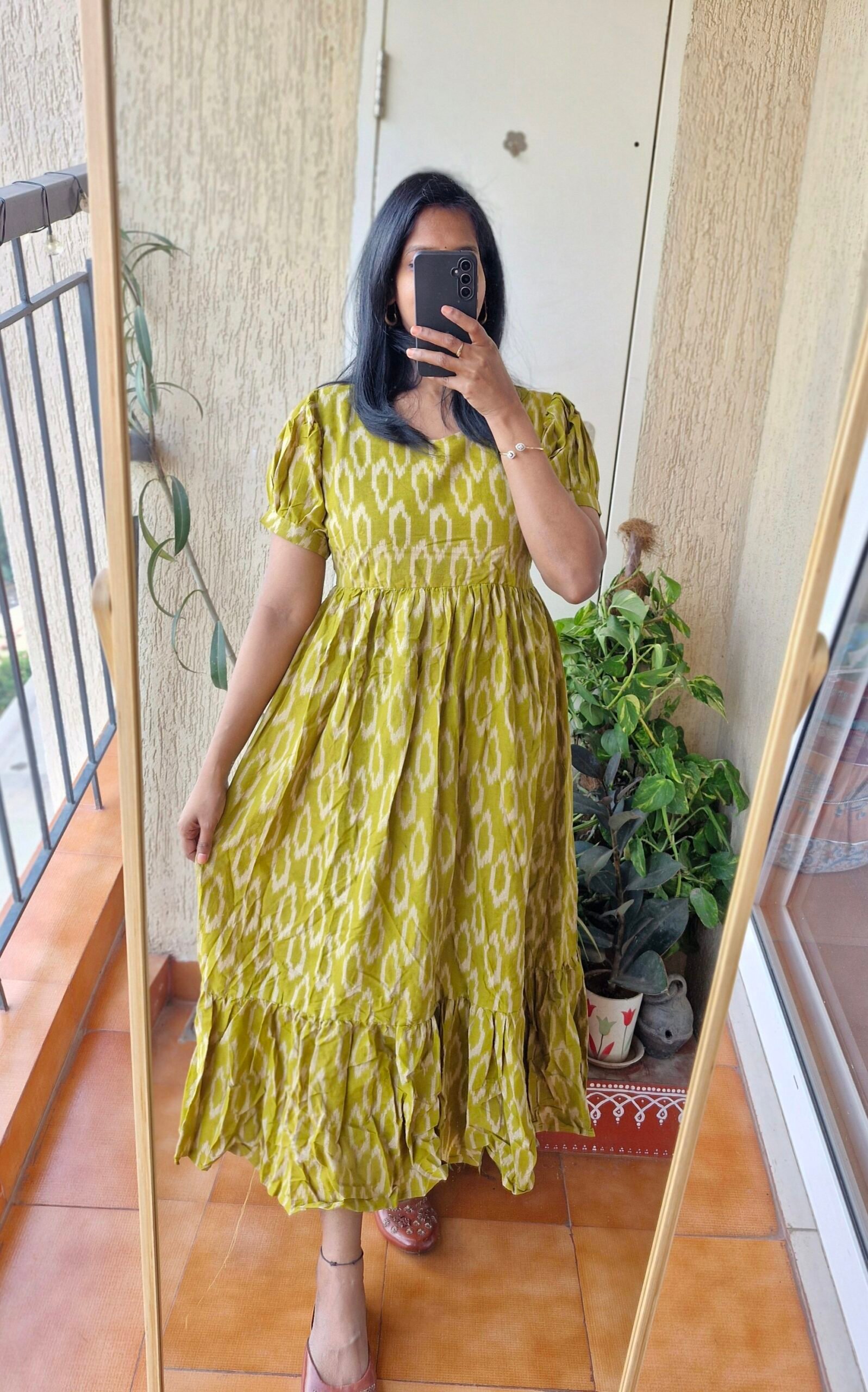 Beautiful kalamkaari methi green cotton dress with ikkath design on it has a beautiful flare.Yoke part has lining and comes with a back tieup.Length of the dress is 51 inches.Super comfortable for all day.