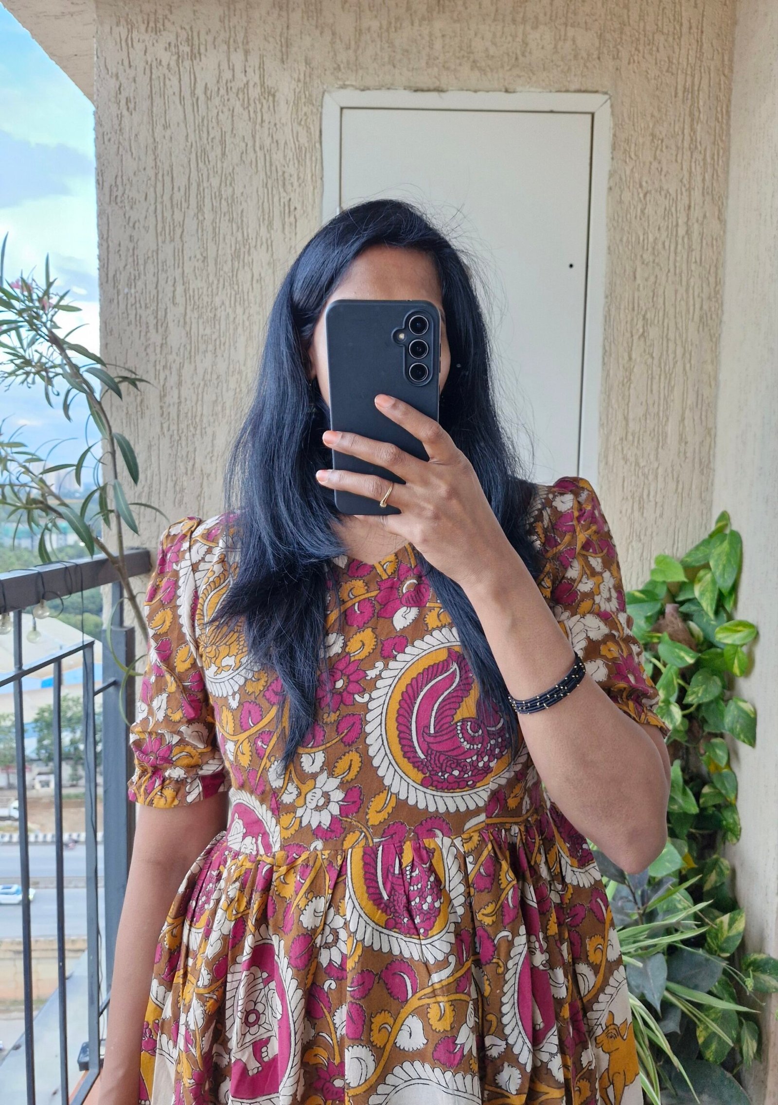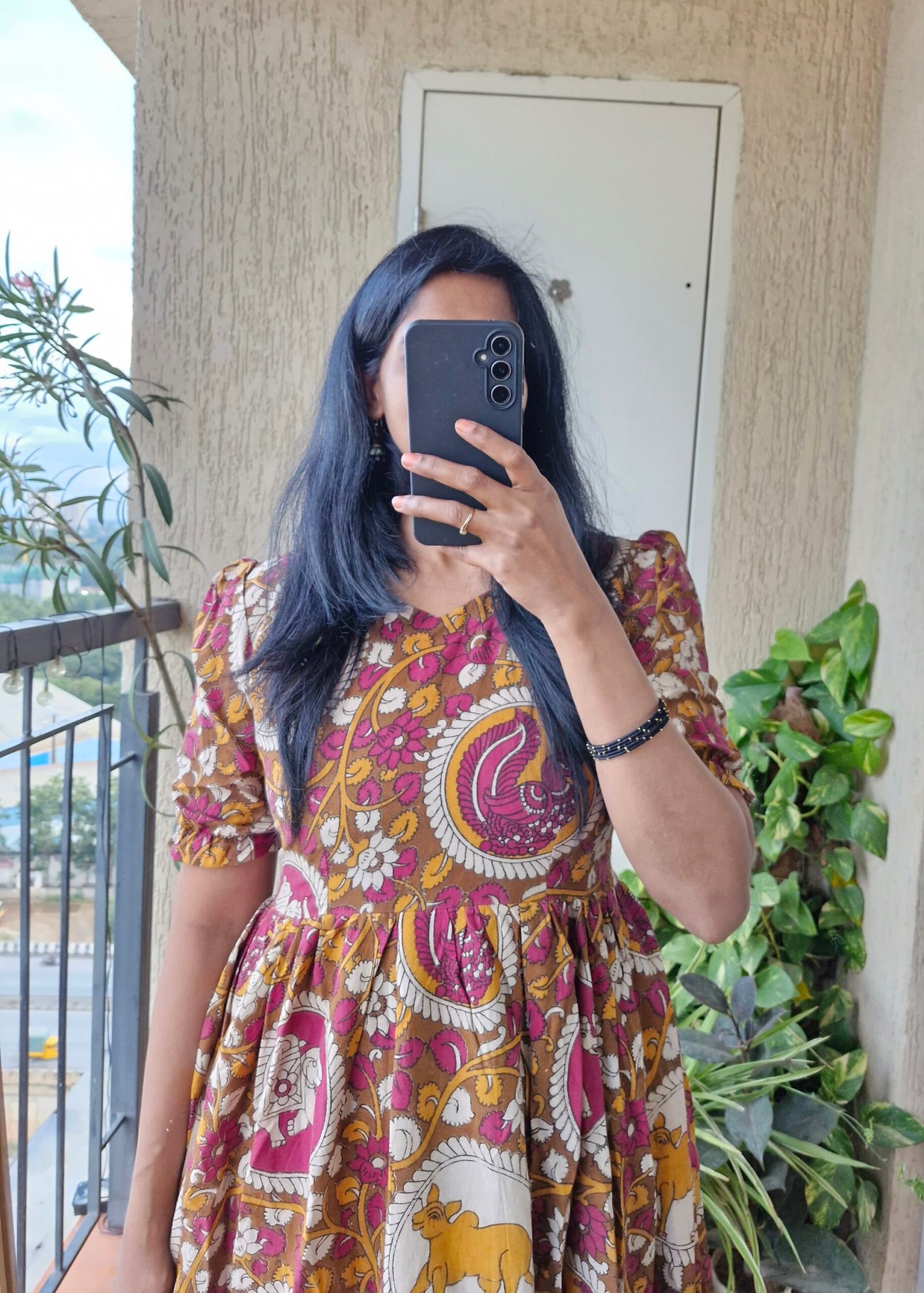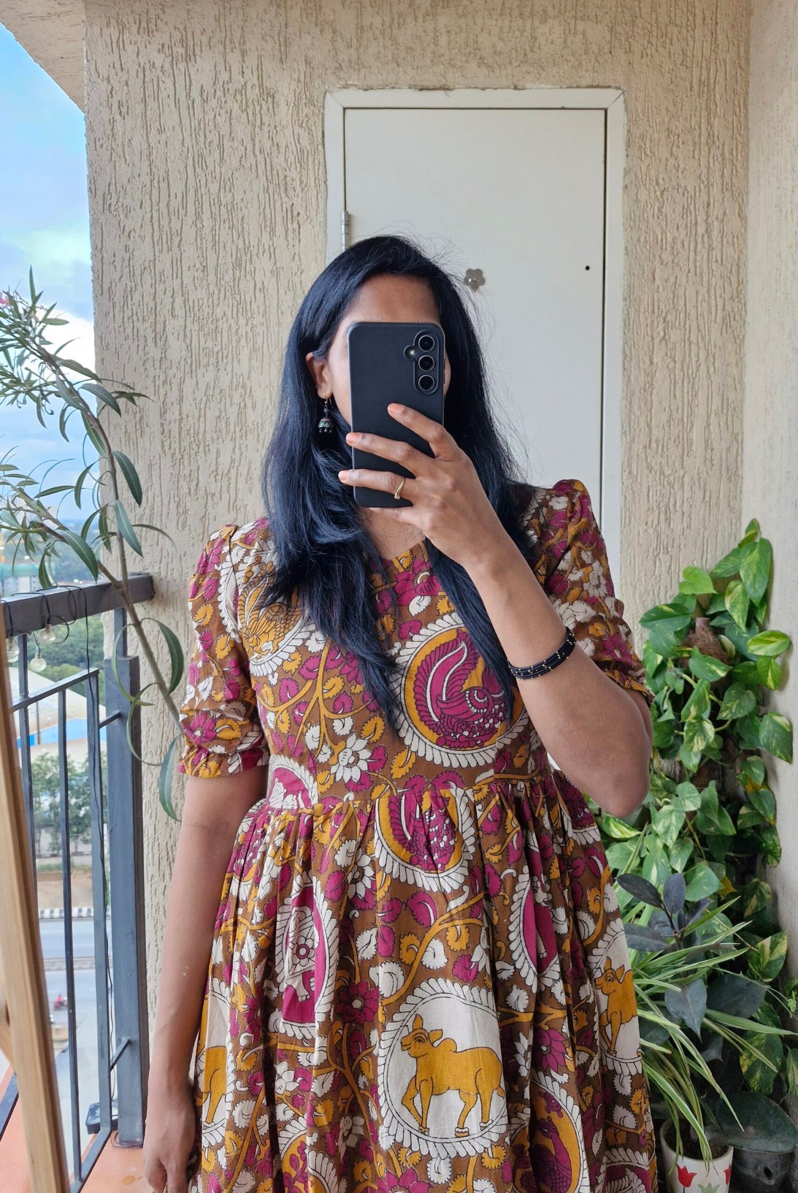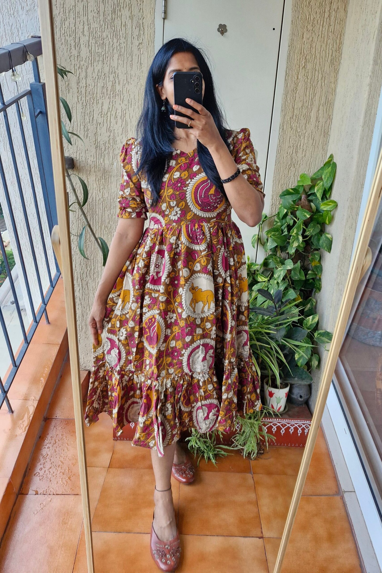 Beautiful kalamkaari orangr floral cotton dress comes with a elastic hands and has extra one inch margins. Length of the dress is 45 inches.