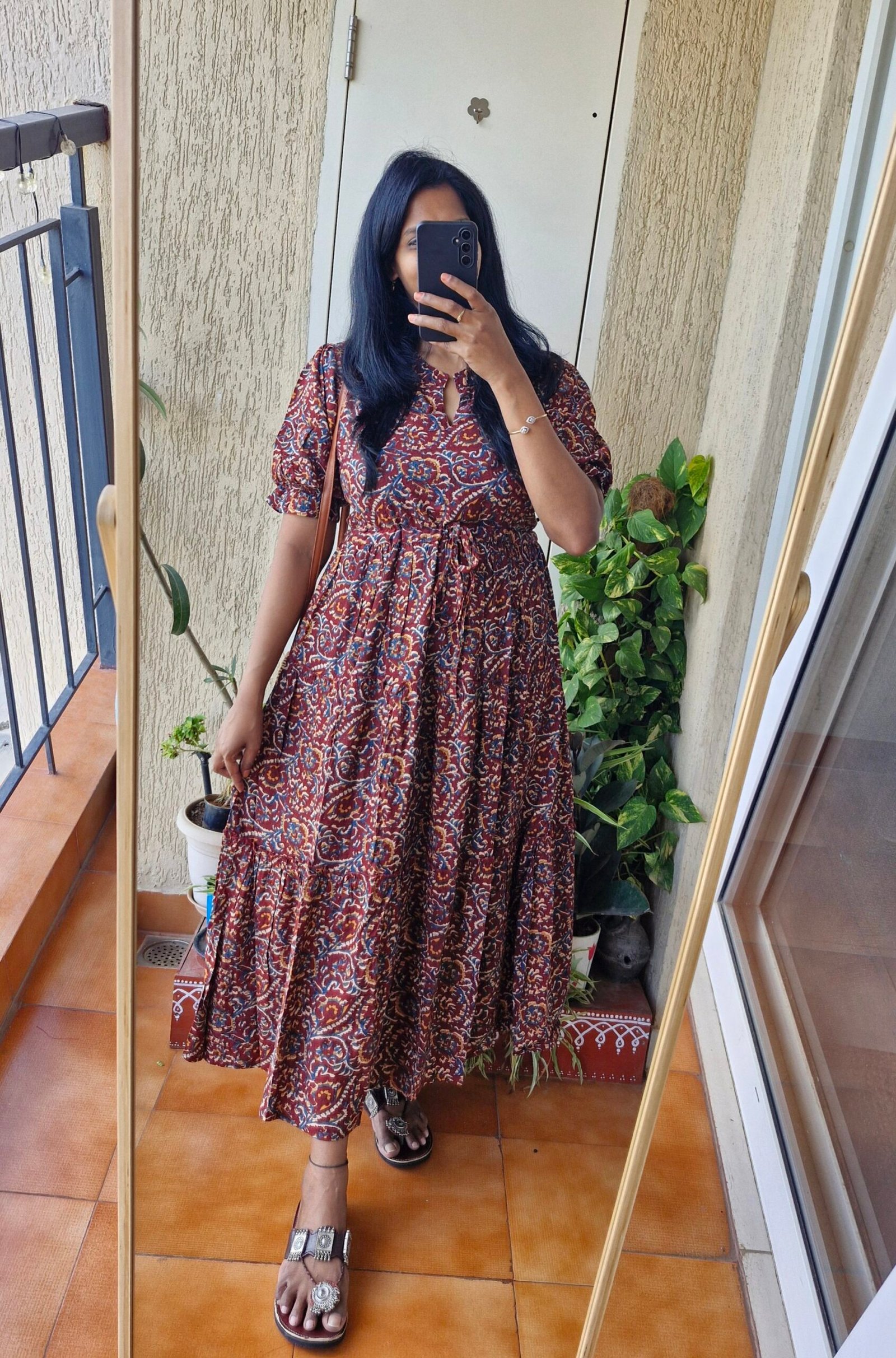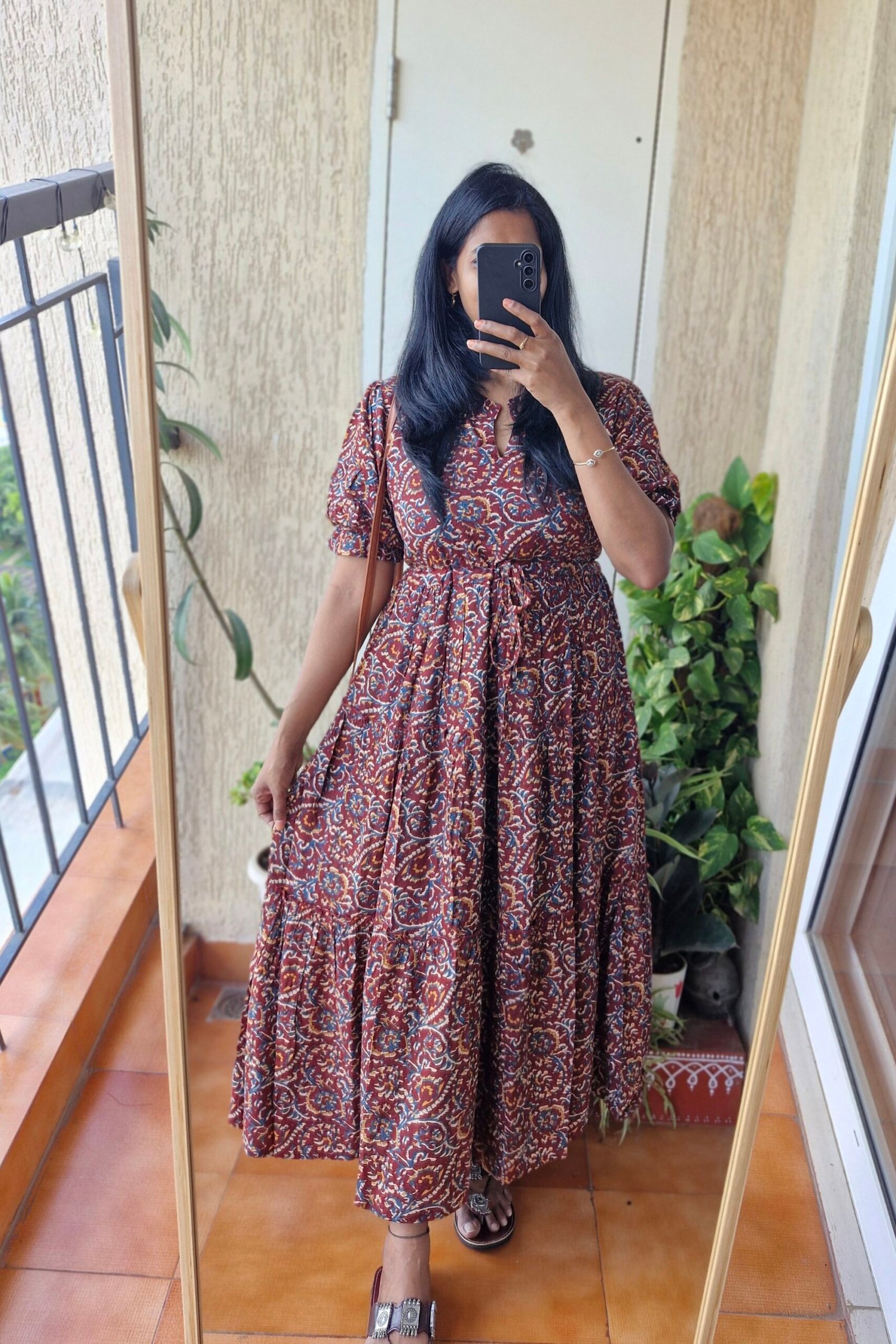 Solid Rayon Kalamkaari print adjustable maxi dress comes with a length of 53 inches perfect for casual outing and regular use.