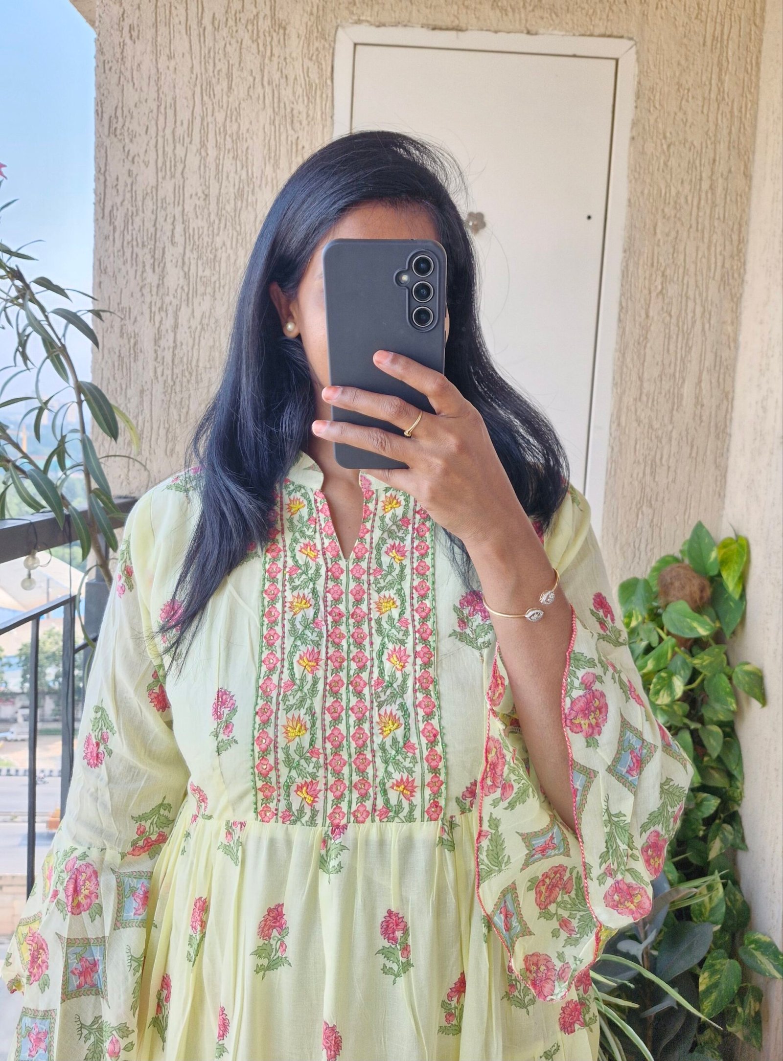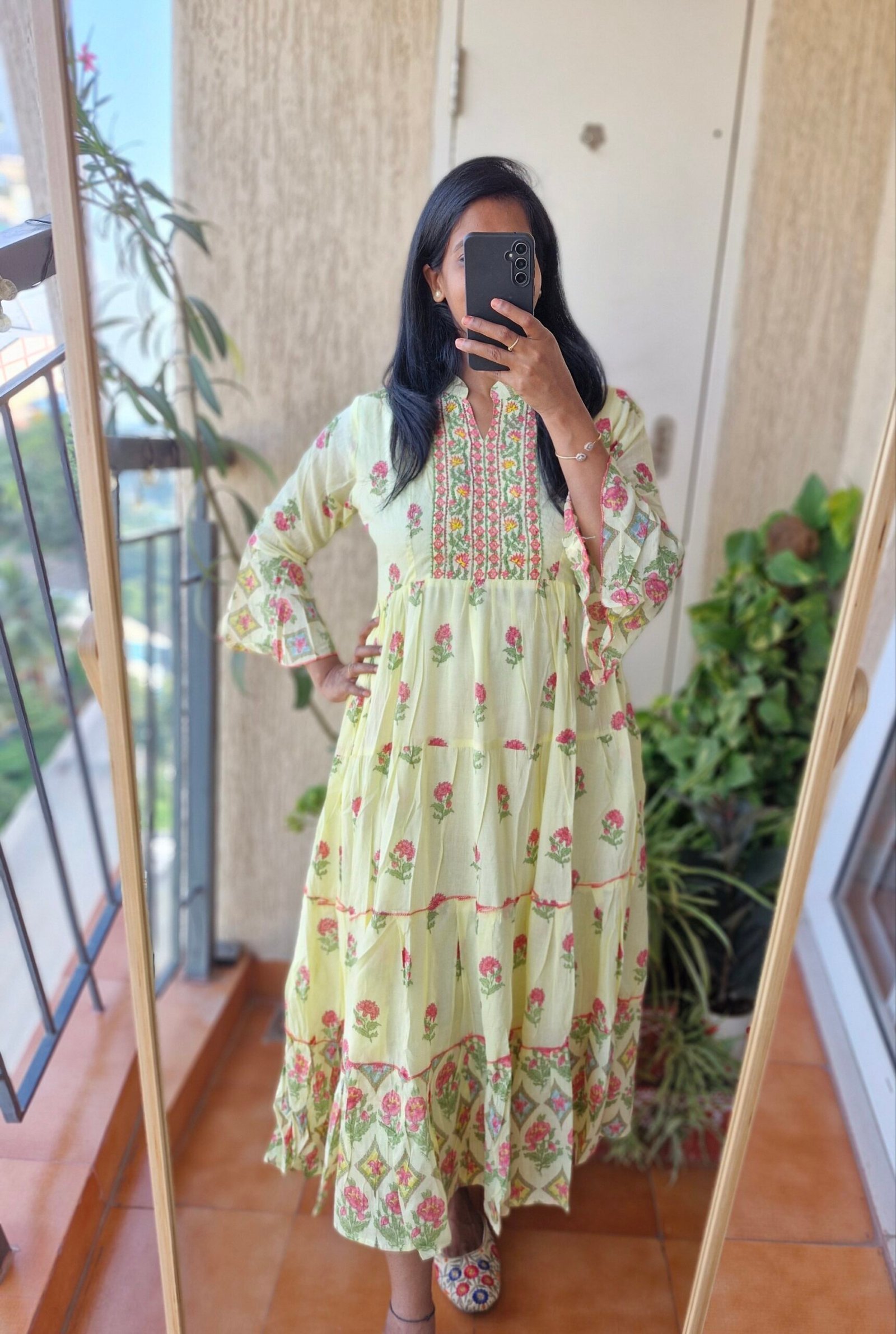 Lemon yellon mul cotton dress comes with a beautiful block print all over and a cute bell sleeves is an add on comes with a length of 46 inches.