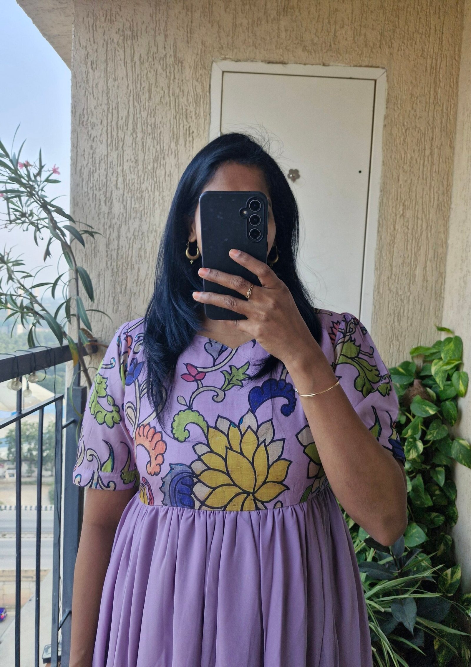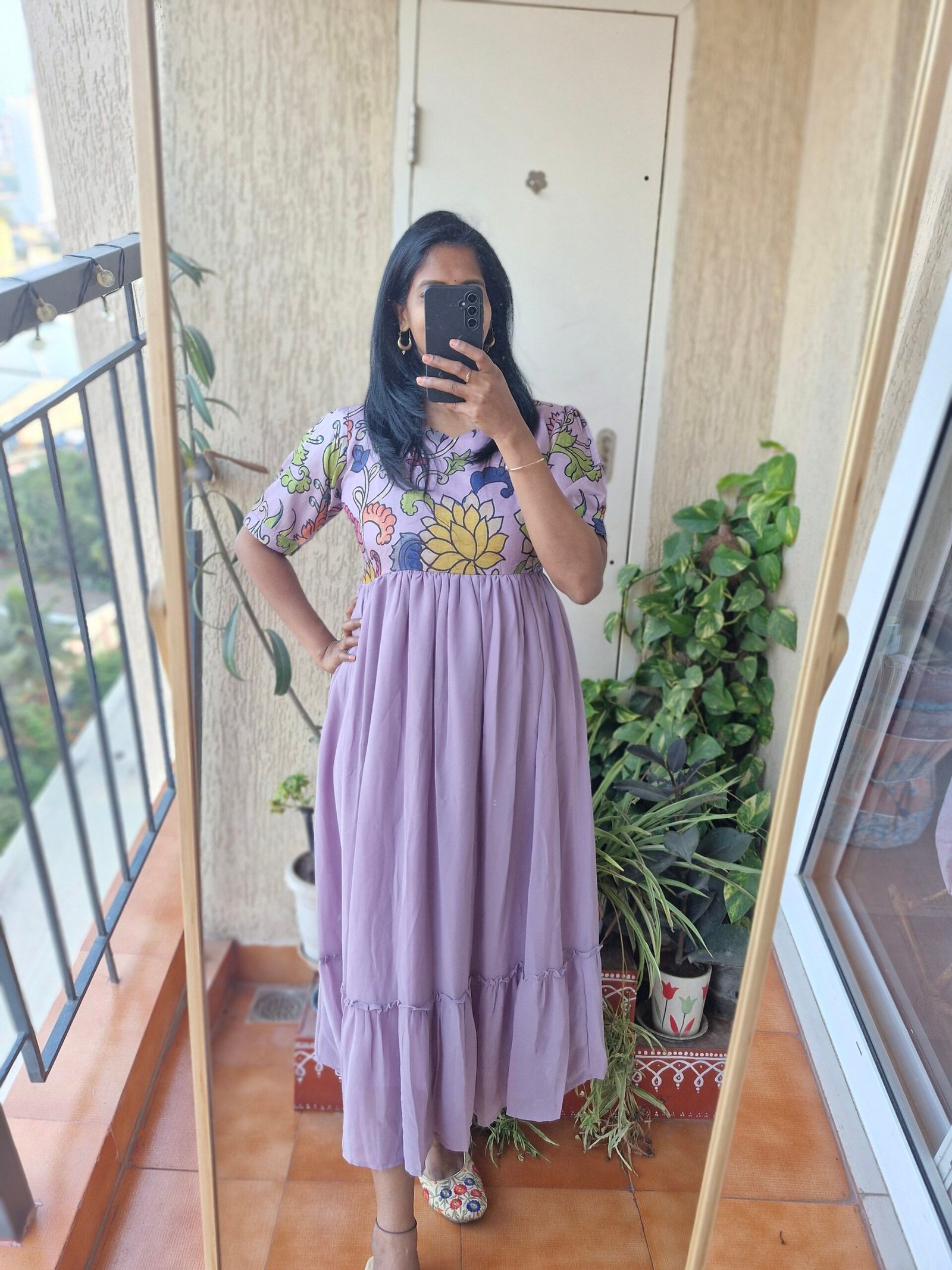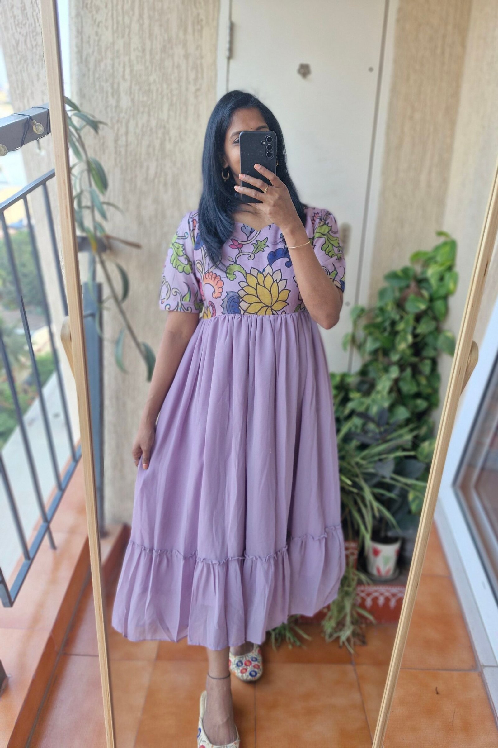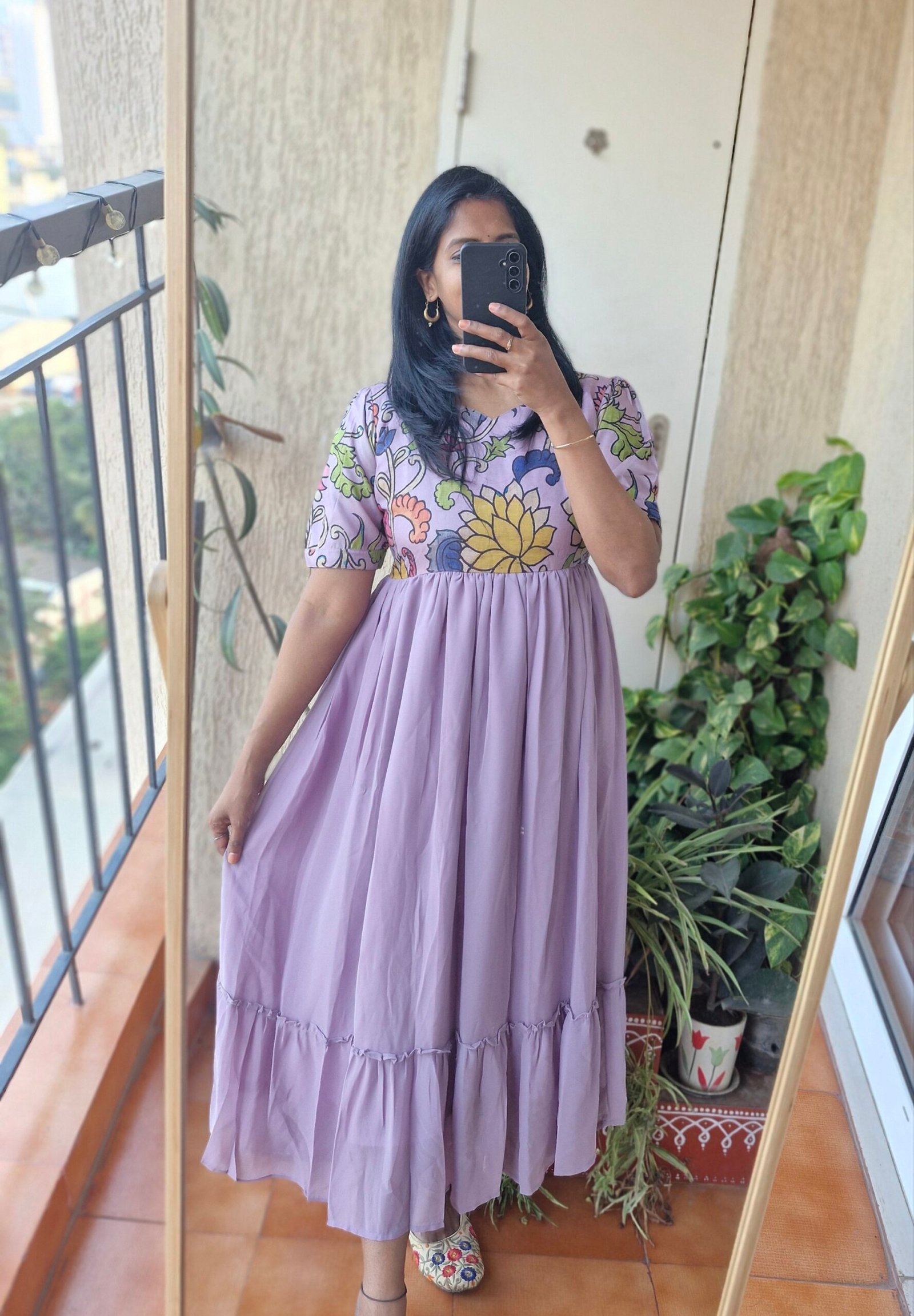 Georgeous Lilac floral georgette dress comes with a Tussar kalamkaari on yoke part giving a fusion touch to ethnic perfect for any kind of occasion comes with a full lining and with the length of 48 inches.This dress is true to size choose as per your bust size.