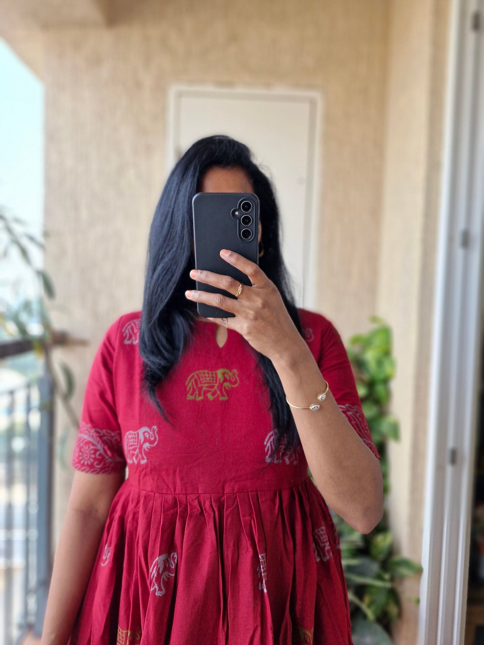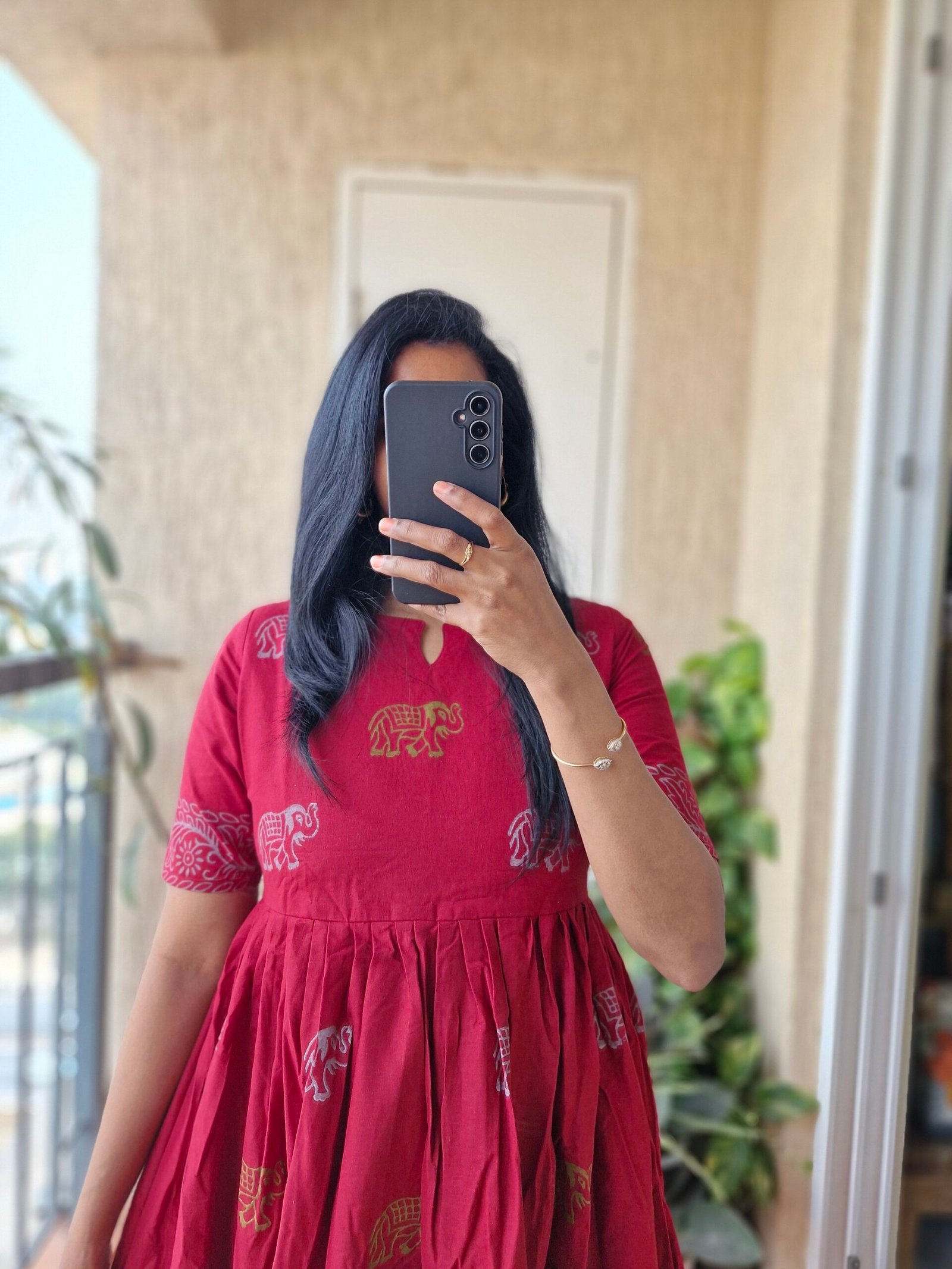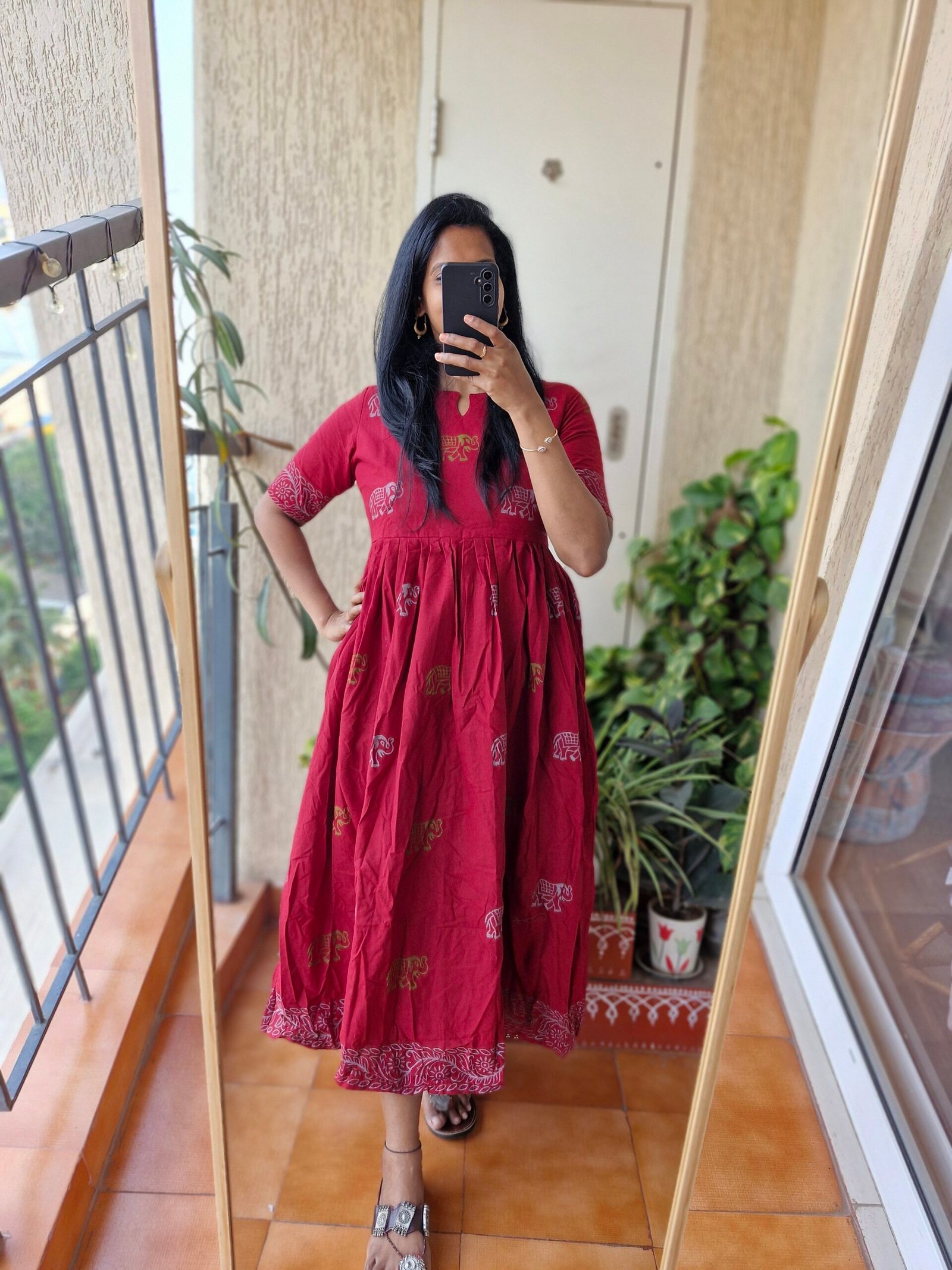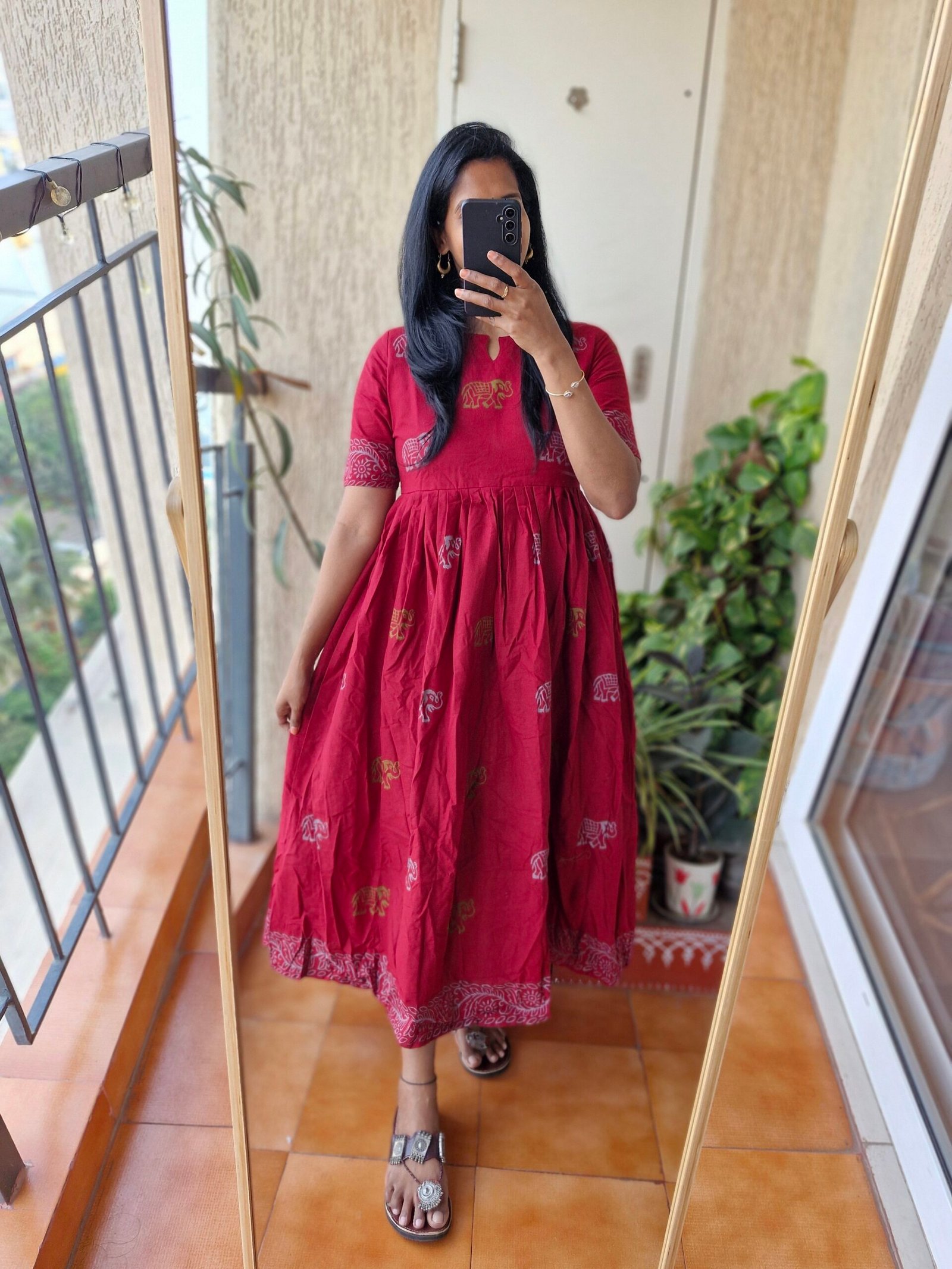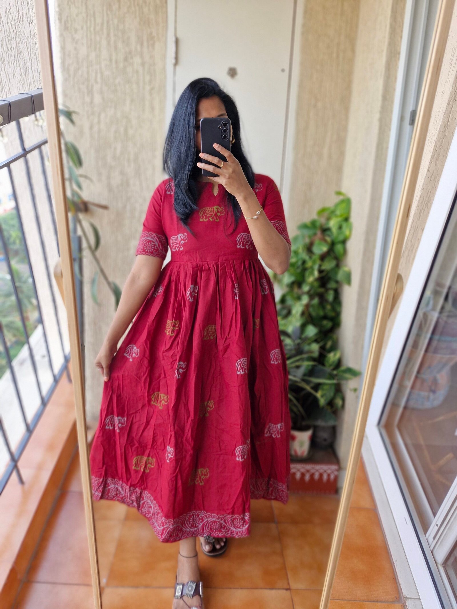 Beautiful Maroon Khaadi Handblock elephant dress with a beautiful block print borders all over the dress comes with a back tieup and with a length of 48 inches.Yoke part has lining.This dress runs little lower than actual size so please choose one size up than usual.If you are bust size is exact 38 go for next size if it is less than 38 go for 38 size.