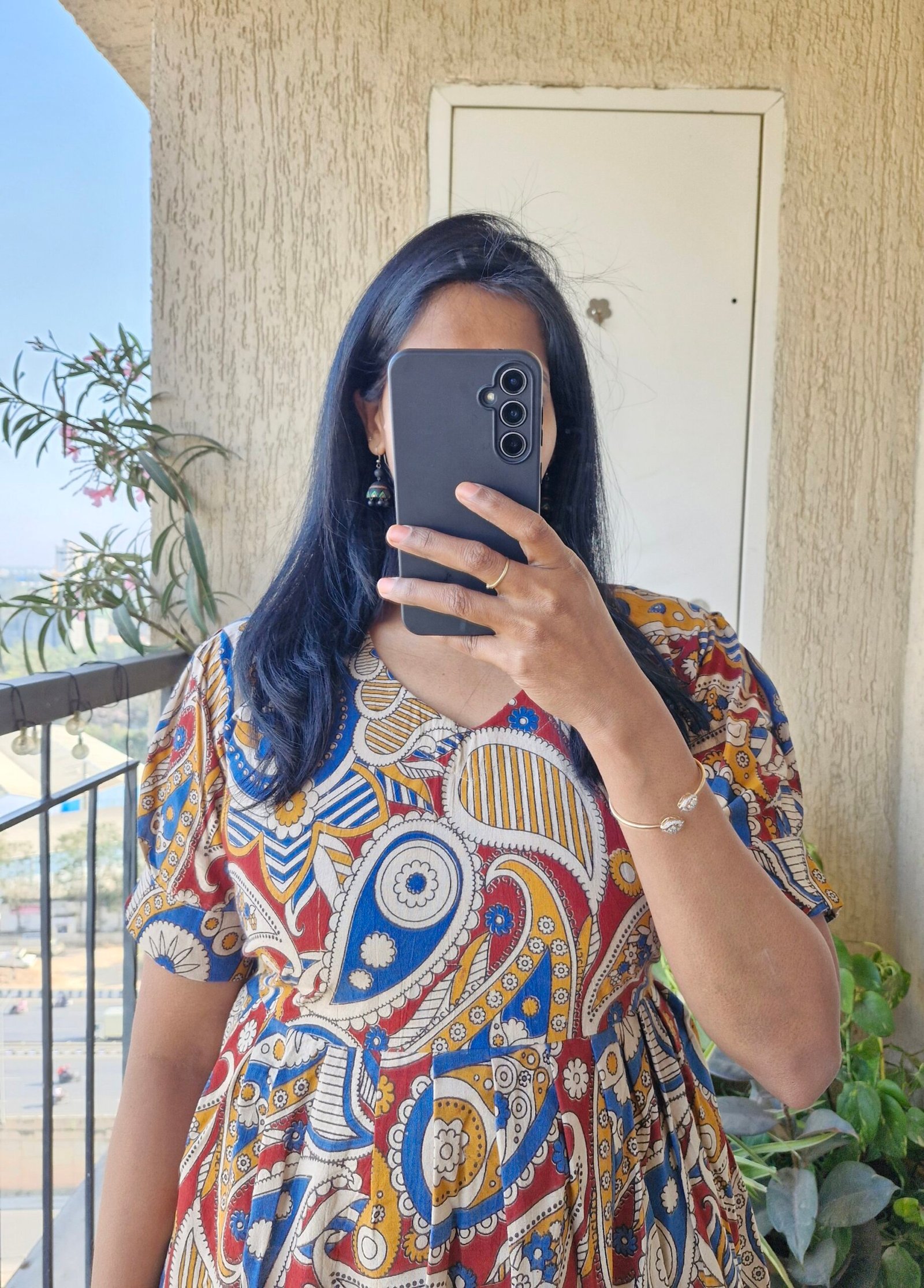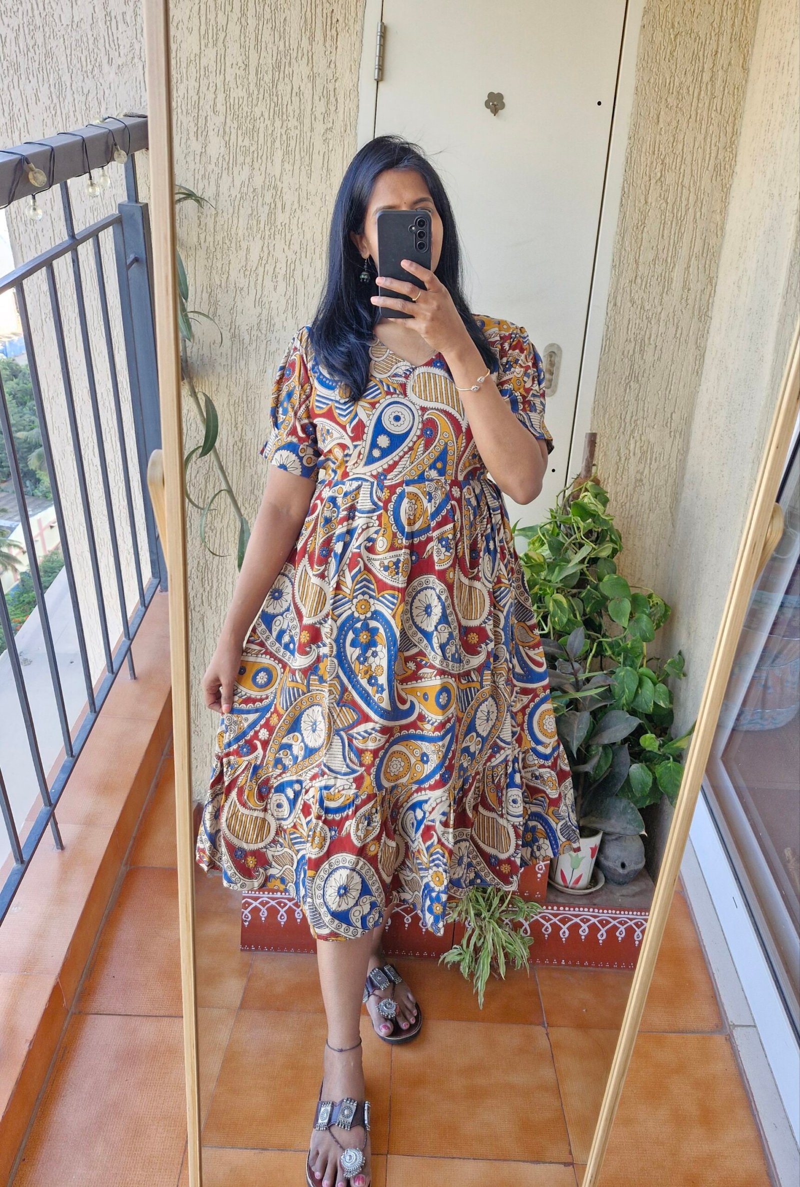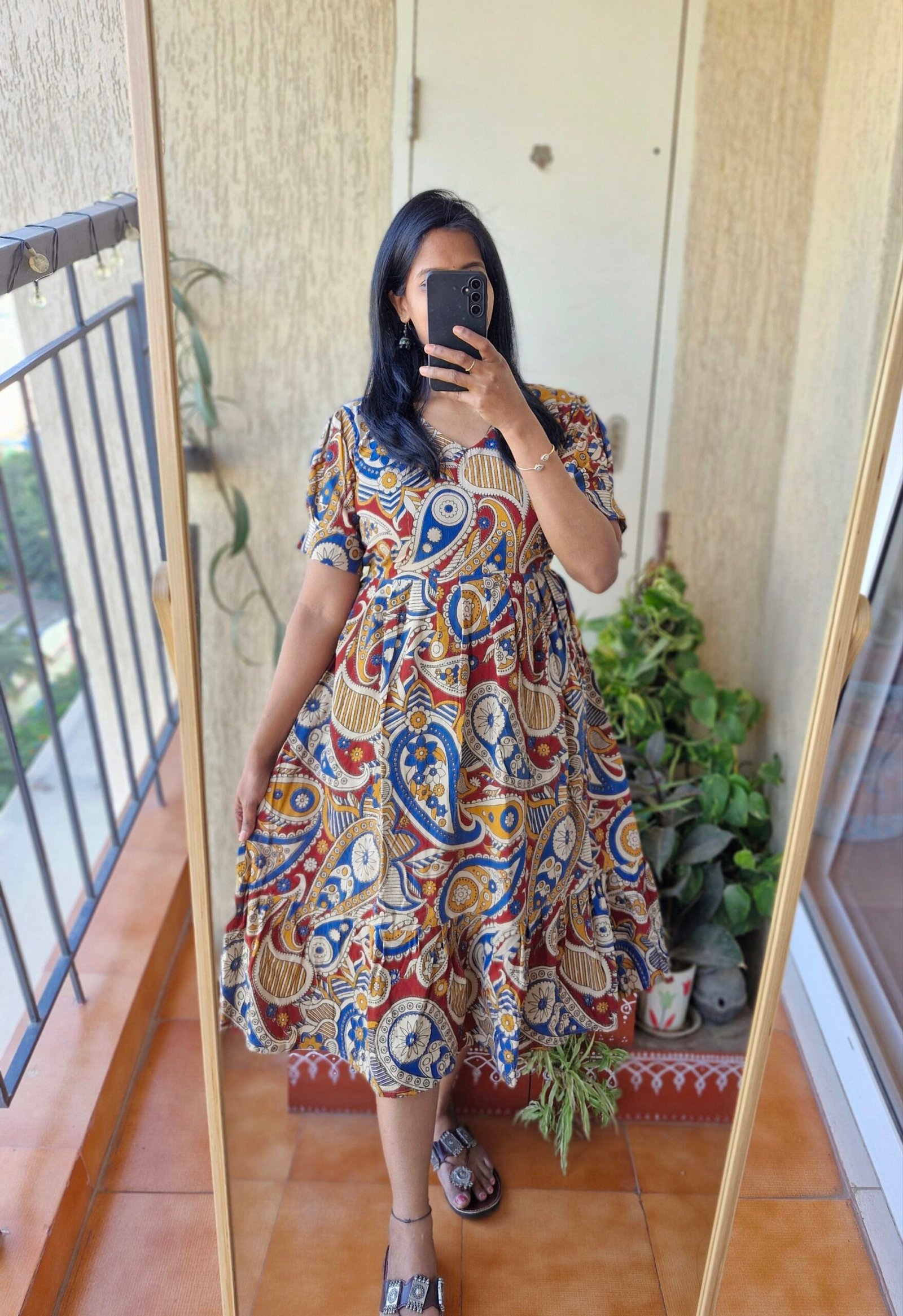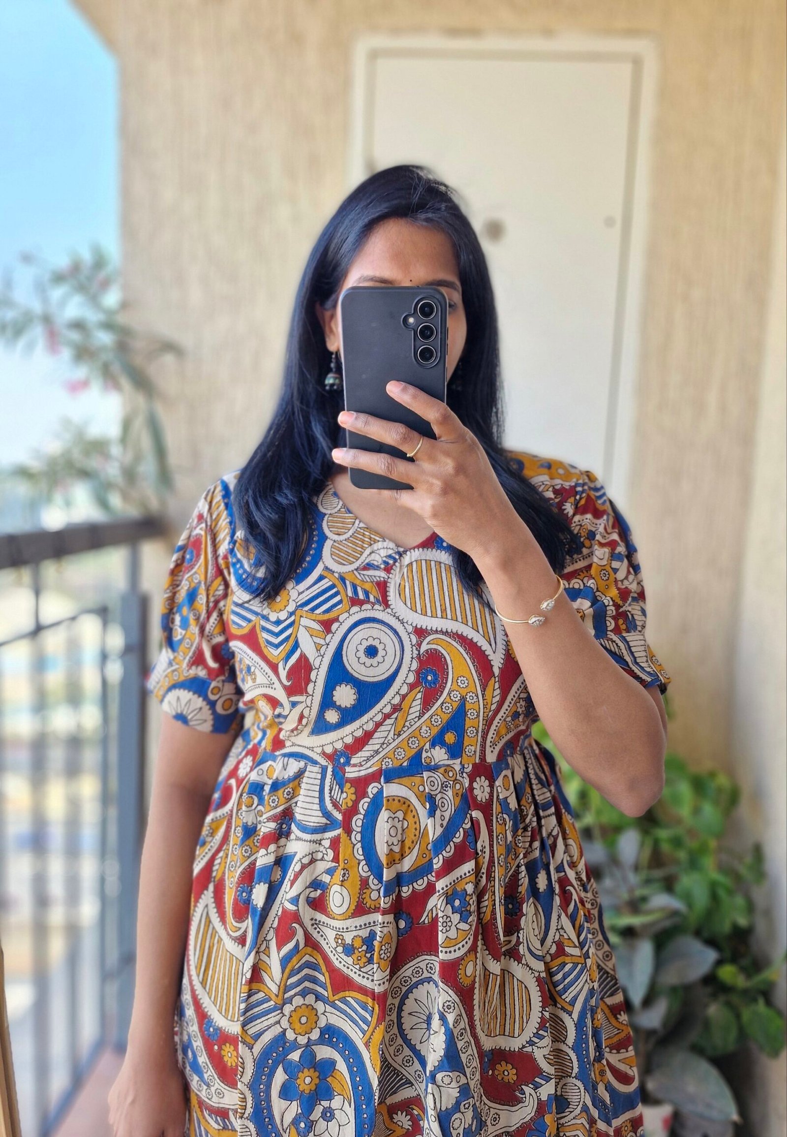 Cute Kalamkaari dress comes with a length of 44 inches has a back tieups .Can be styled as a frock or pair it with a jean or jegging to give a kurti look.This runs exact to size so if you are exact 38 choose one size up less than 38 go with 38 only.
