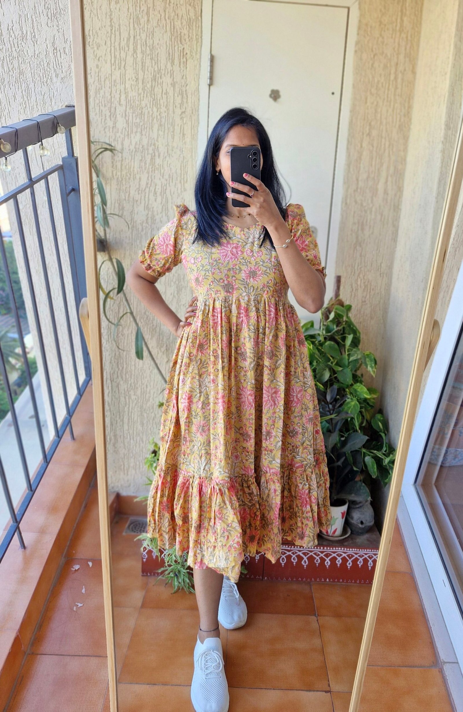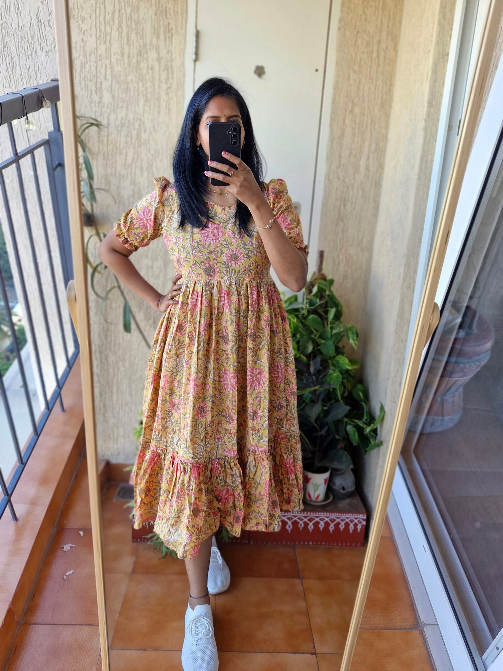 Mustard floral bagru blokprint cotton dress.Mustard floral bagru blokprint cotton dress.