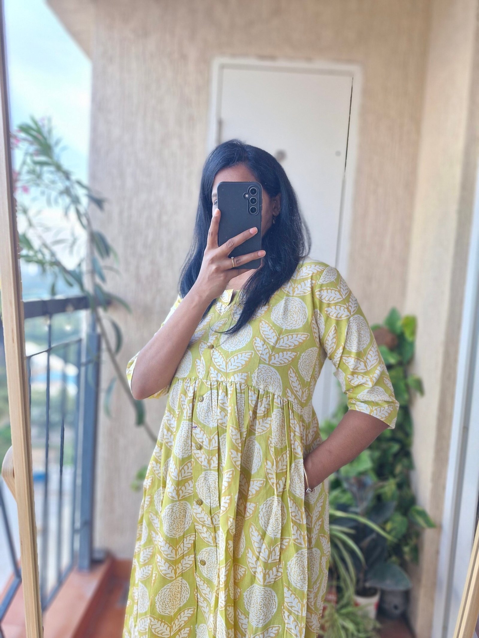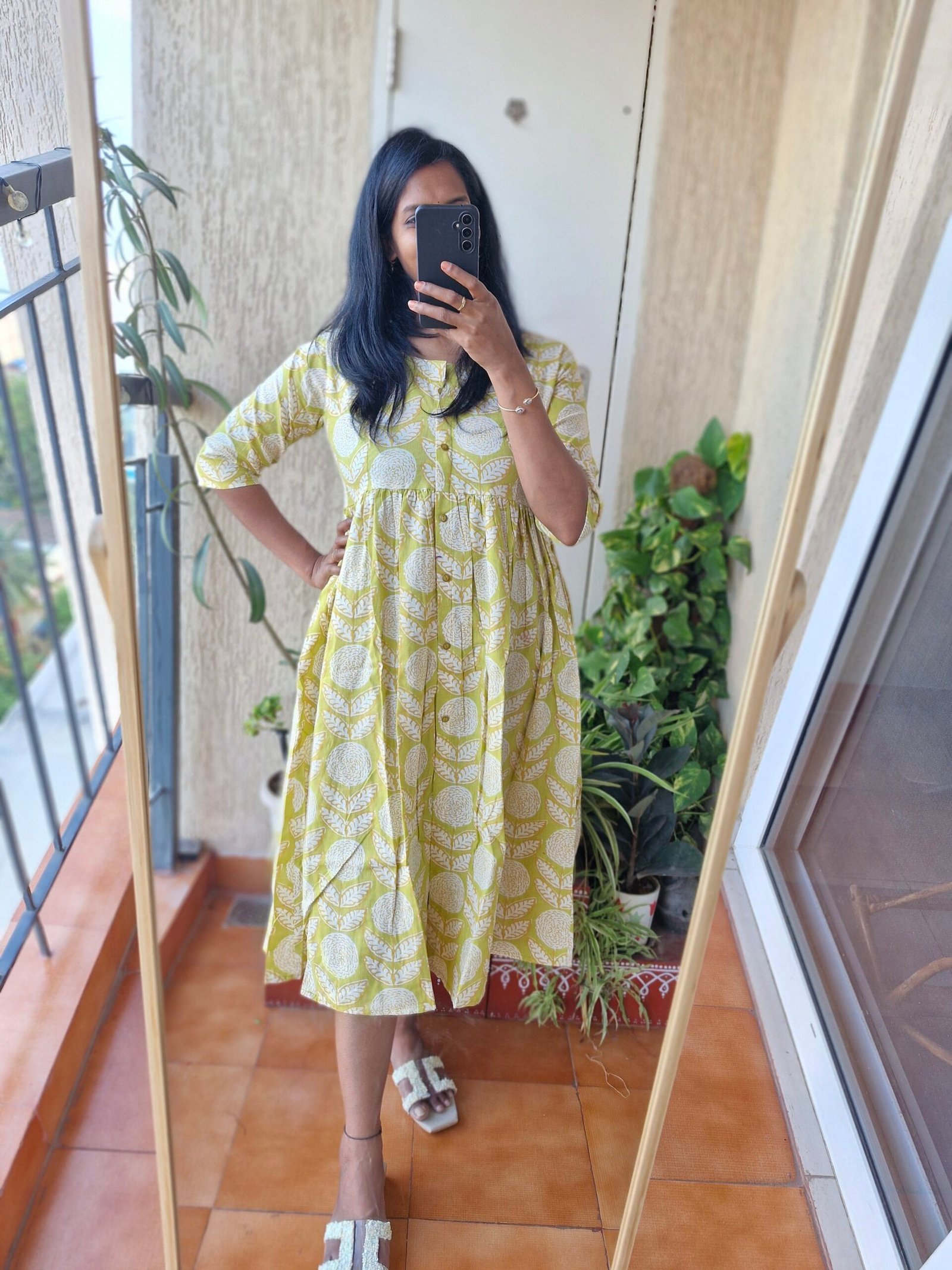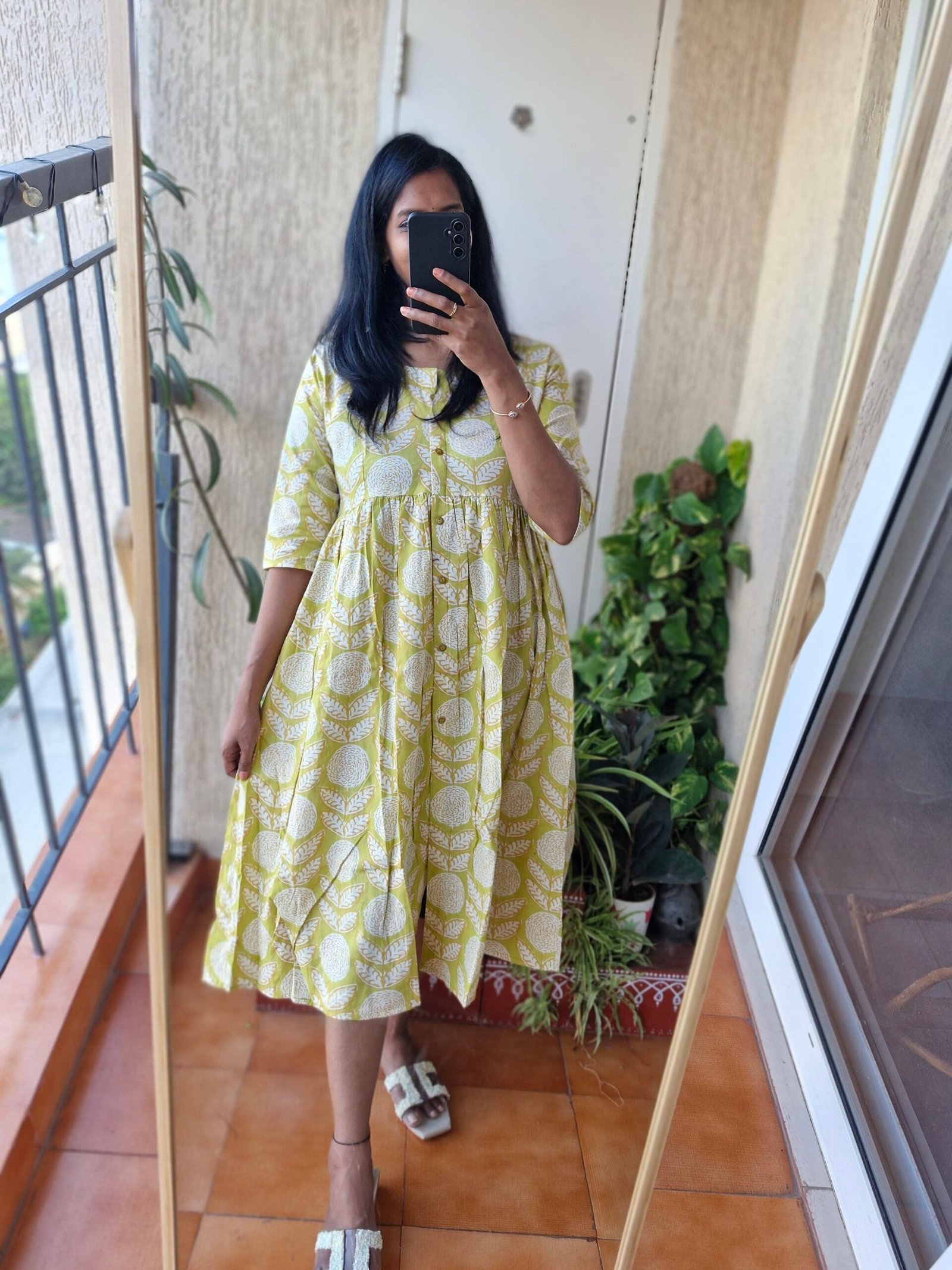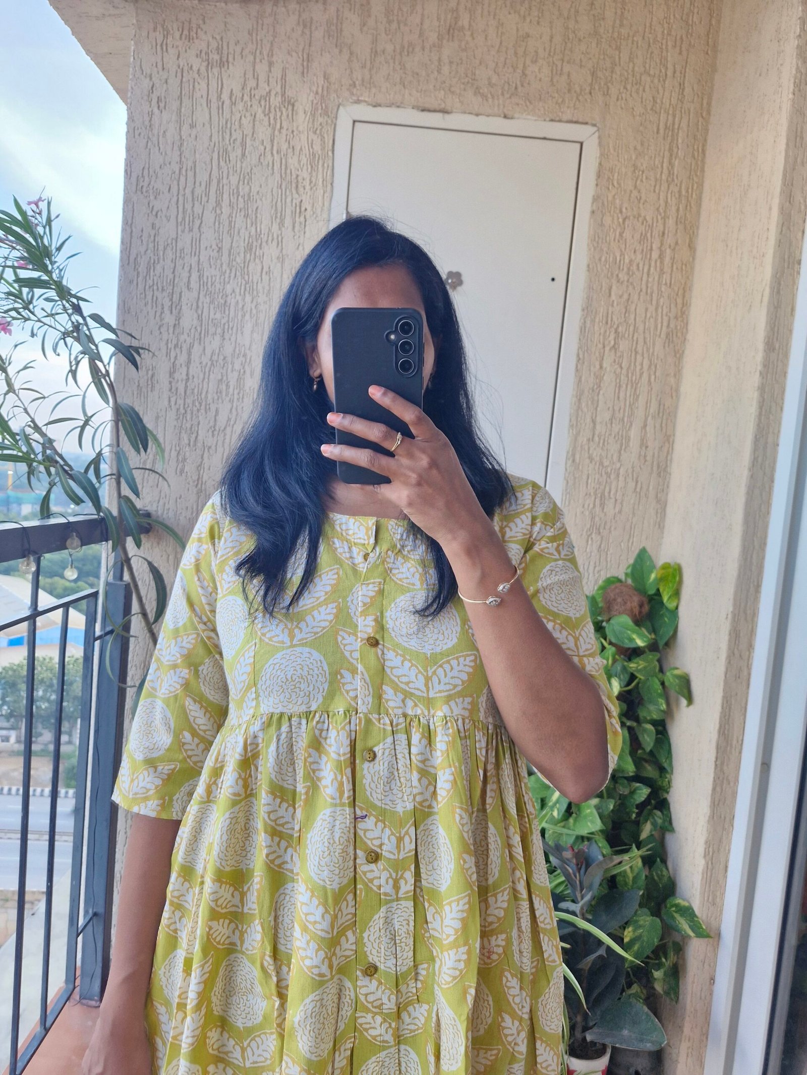 Beautiful mustard green kadi floral midi dress comes with a length of 44 inches and also with a pocket.