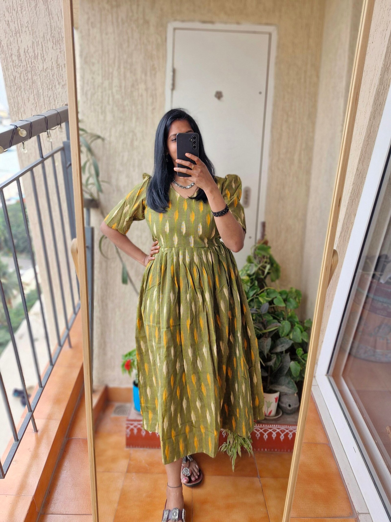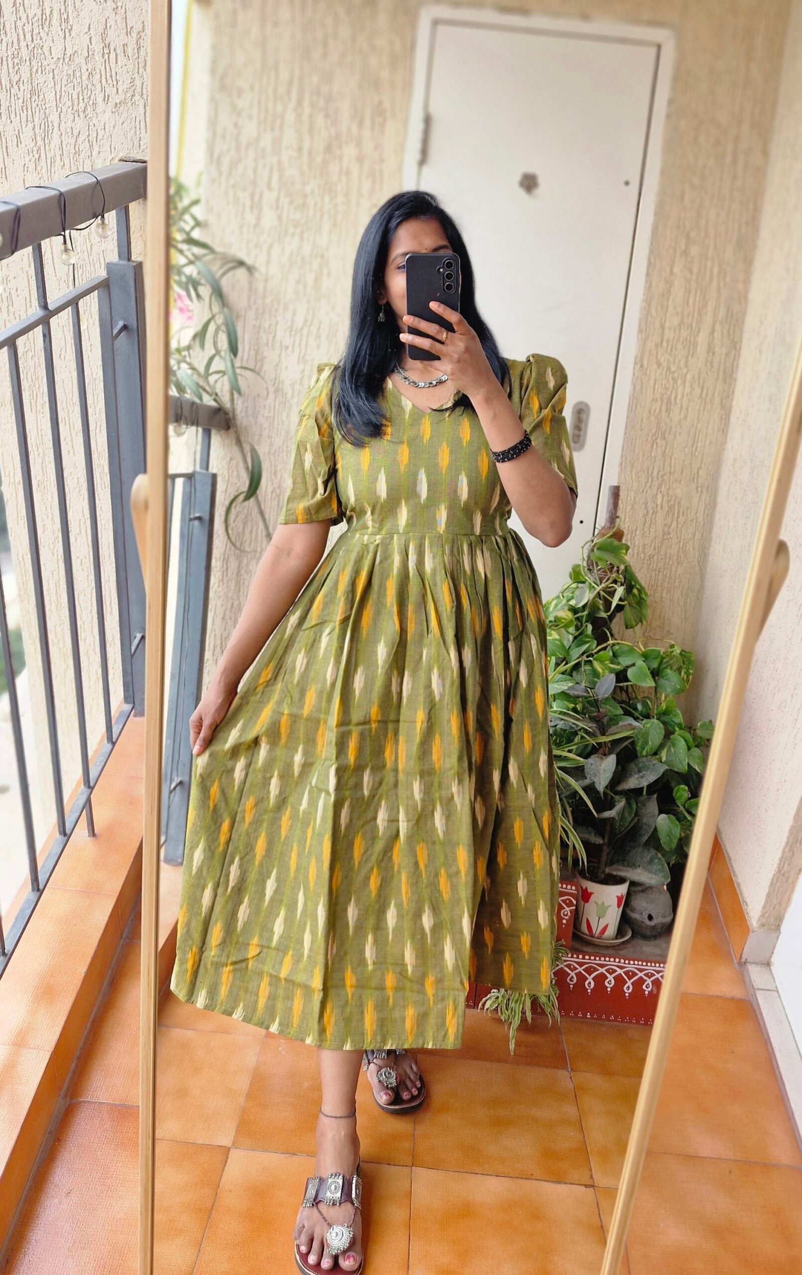 Beautiful Ikkath handloom dress comes with a unique tulip hands comes with yoke part lining with a length of 48 inches.Comes with a back tieup.Perfect dress for summer pair it with a oxidized jewellery to give a perfect fusion look.This dress runs little lower than actual size so we have made L as 38.So please choose as per your bust size and do not choose bigger size in this.