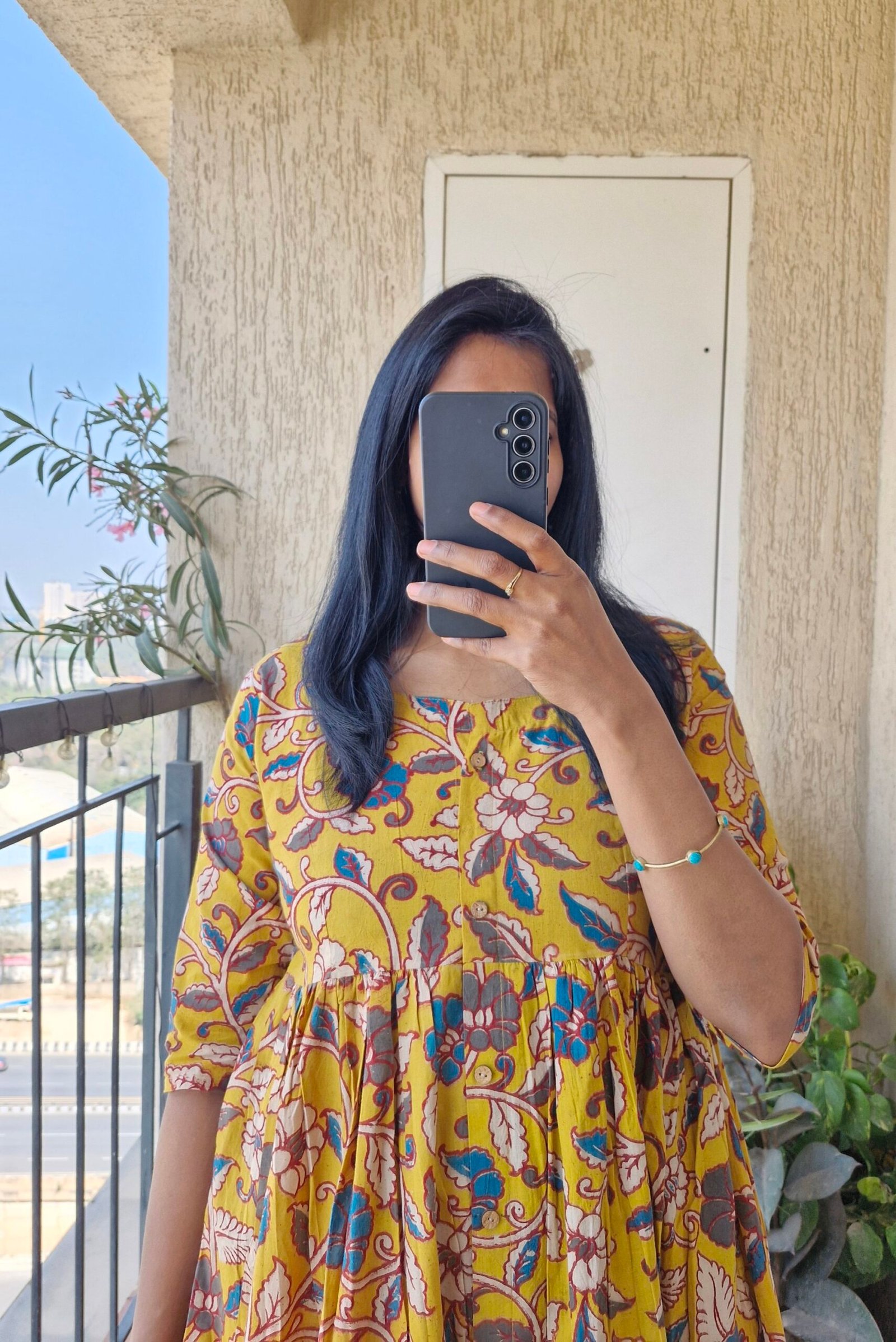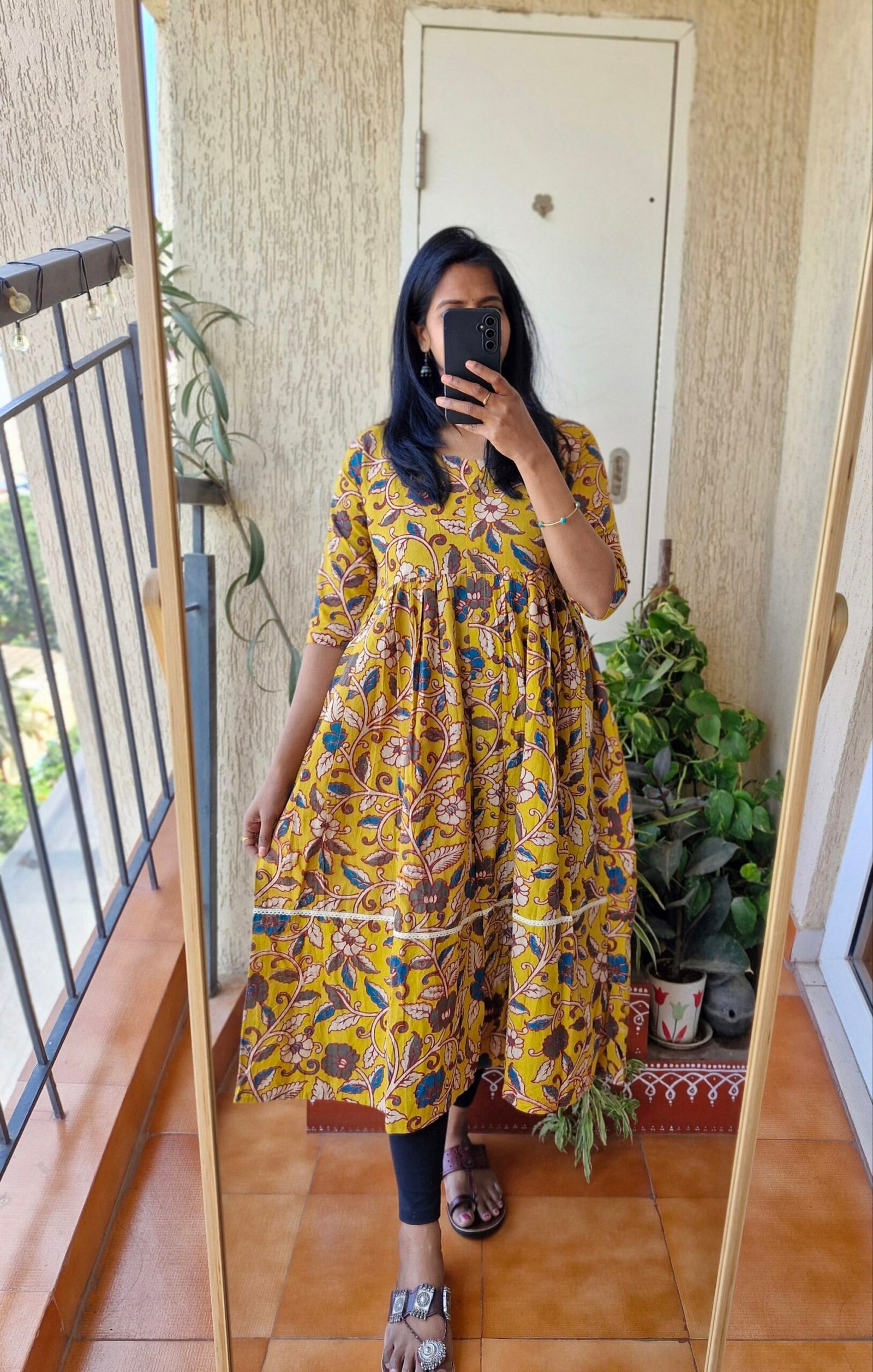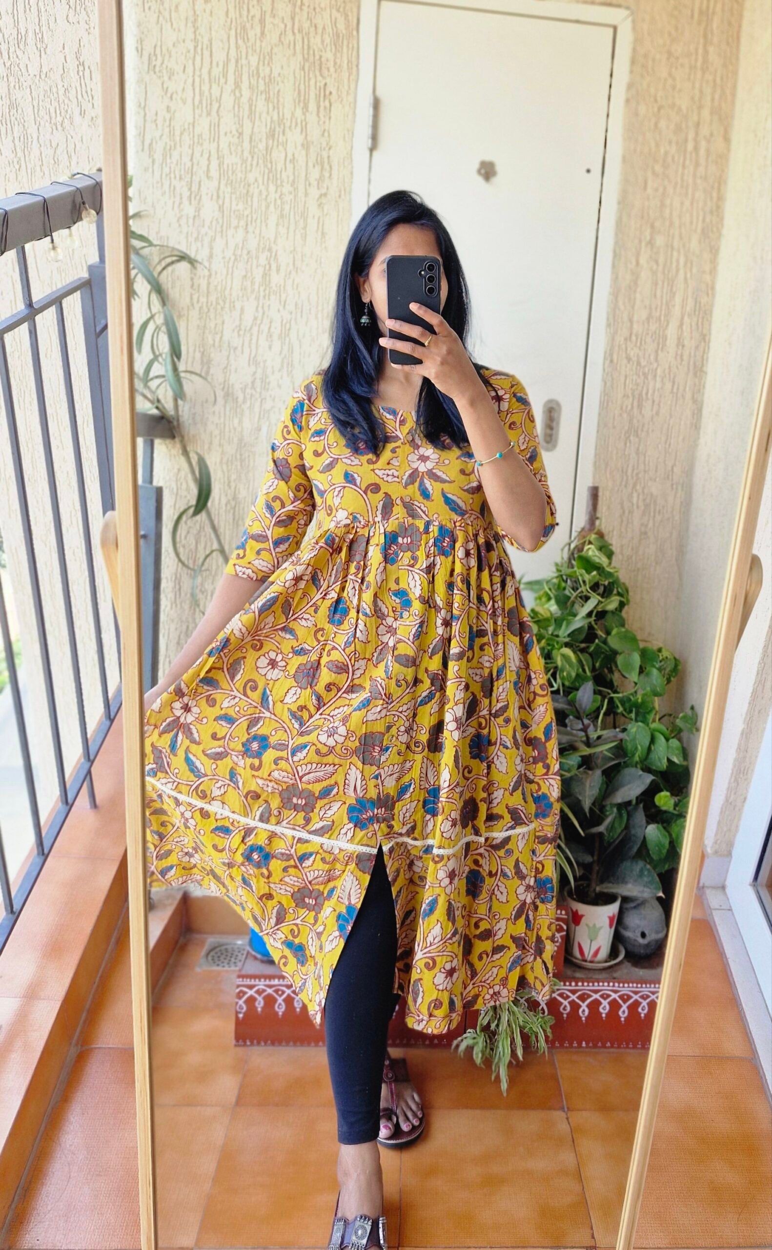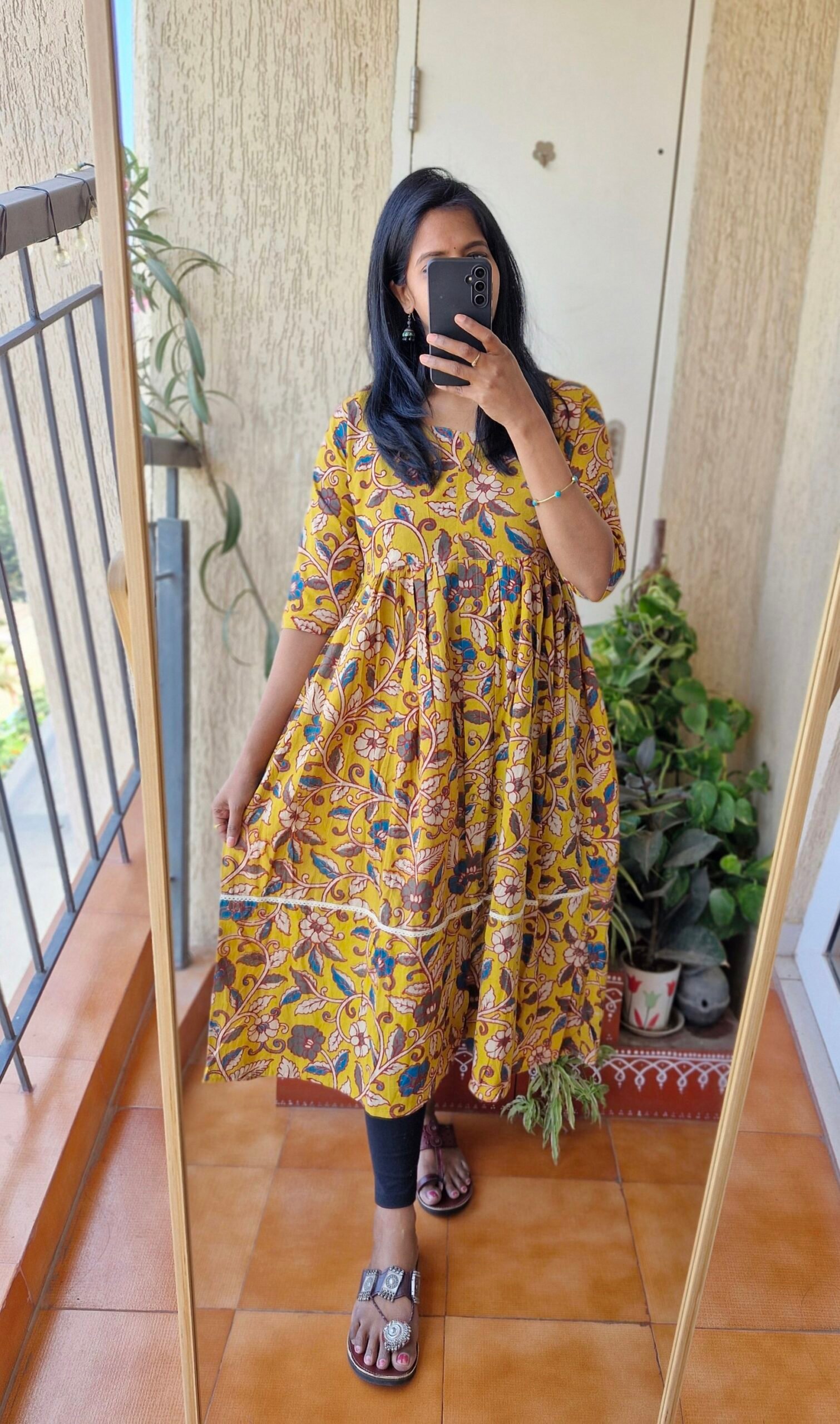 Beautiful Mustard yellow Kalamkaari Aline dress has a cute lace detailing with button down style and has a slit at bottom.These dresses are true to size choose as per your bust size.Length of the dress is 46 inches.