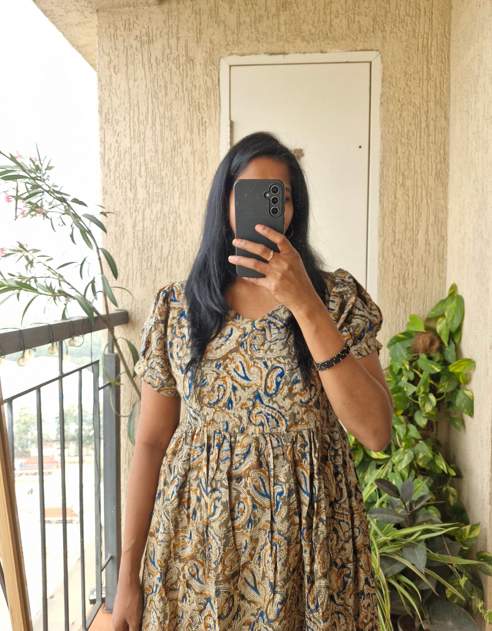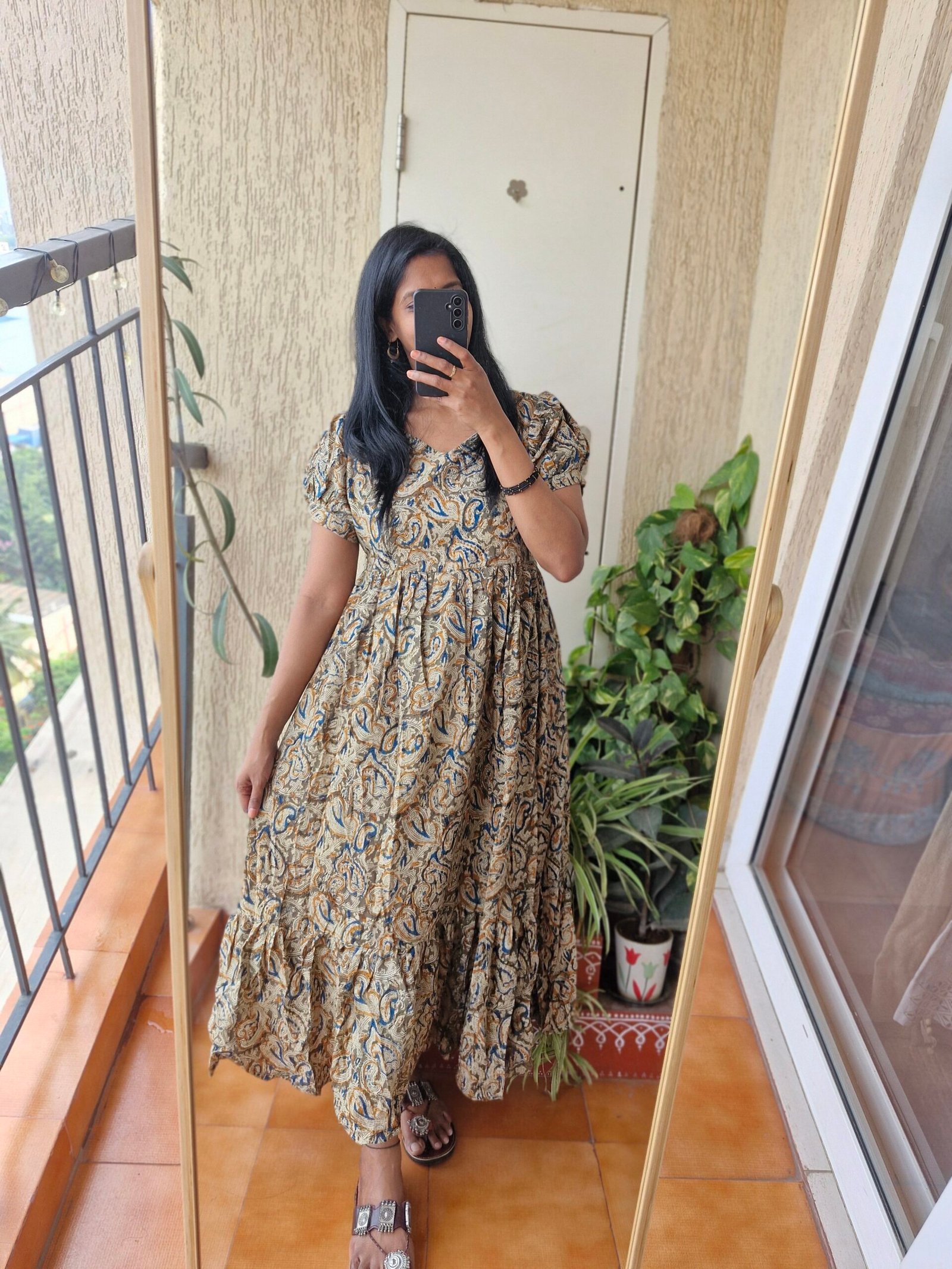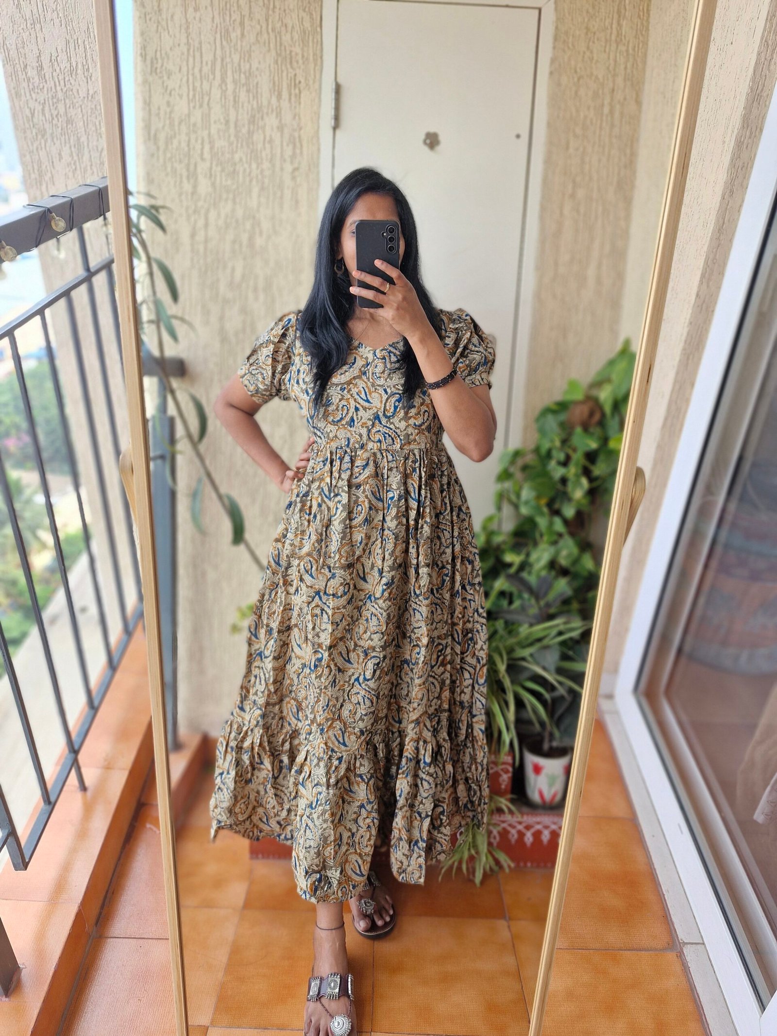 Beautiful kalamkaari olive green floral handloom cotton dress comes with a back tie up and the length of the dress is 50 inches.This dress runs little lower than actual size so we have made L(40) as M(38). Please choose as per your bust size and do not choose bigger size as we have already adusted to right size with enough margin!