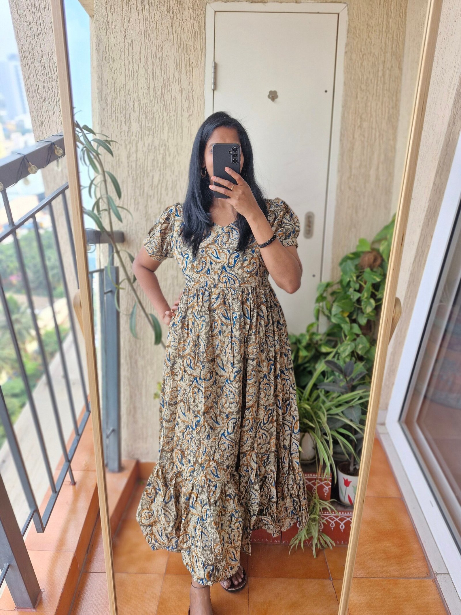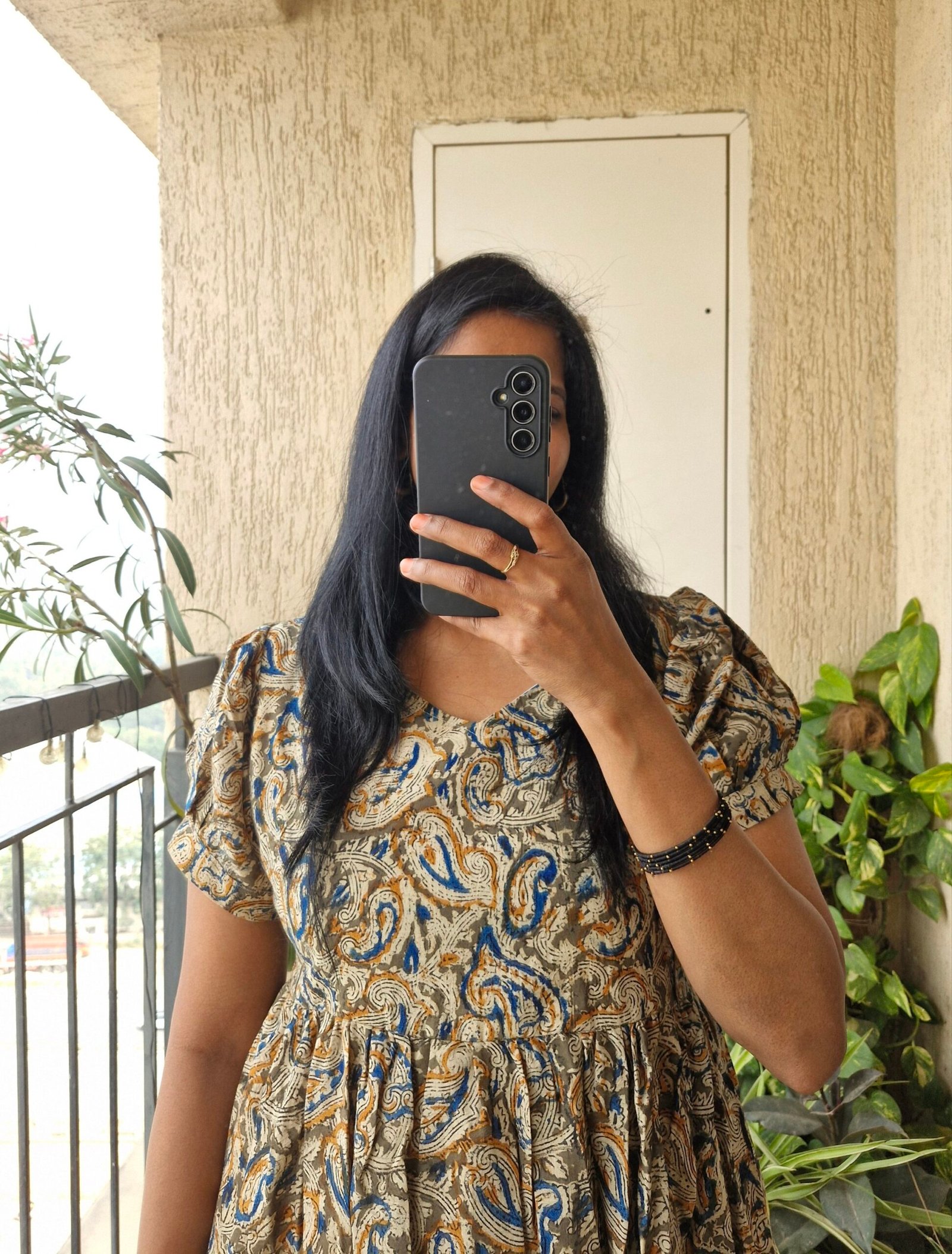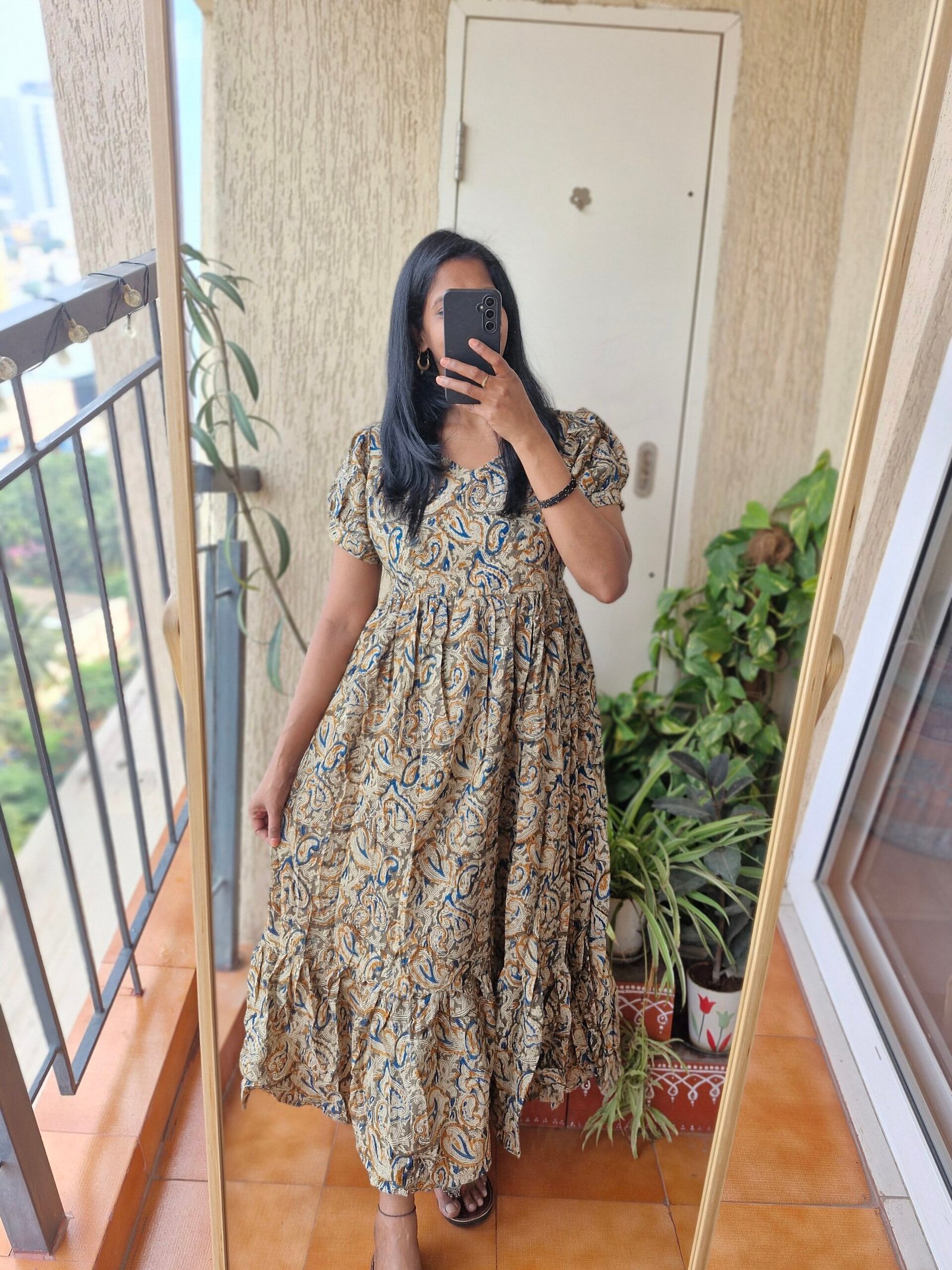 Beautiful kalamkaari olive green floral handloom cotton dress comes with a back tie up and the length of the dress is 50 inches.This dress runs little lower than actual size so we have made L(40) as M(38). Please choose as per your bust size and do not choose bigger size as we have already adusted to right size with enough margin!