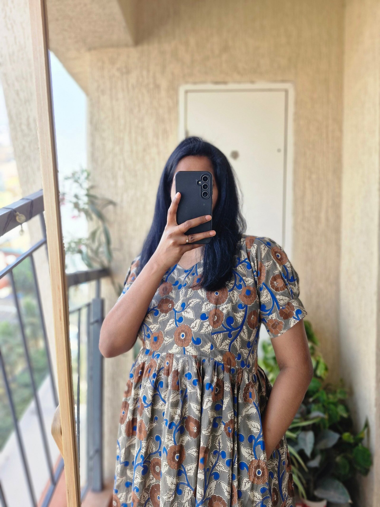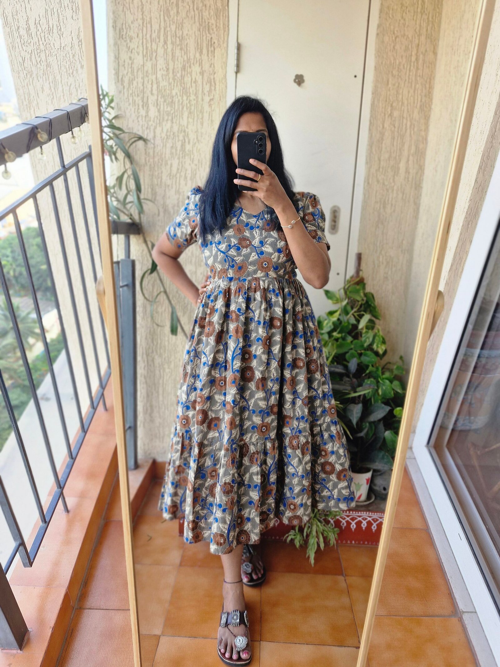 Beautiful Olive green kalamkaari dress comes with full lining inside with a one side pocket. Length of the dress is 47 inches.True to size please choose as per your bust size and it has extra margins too.