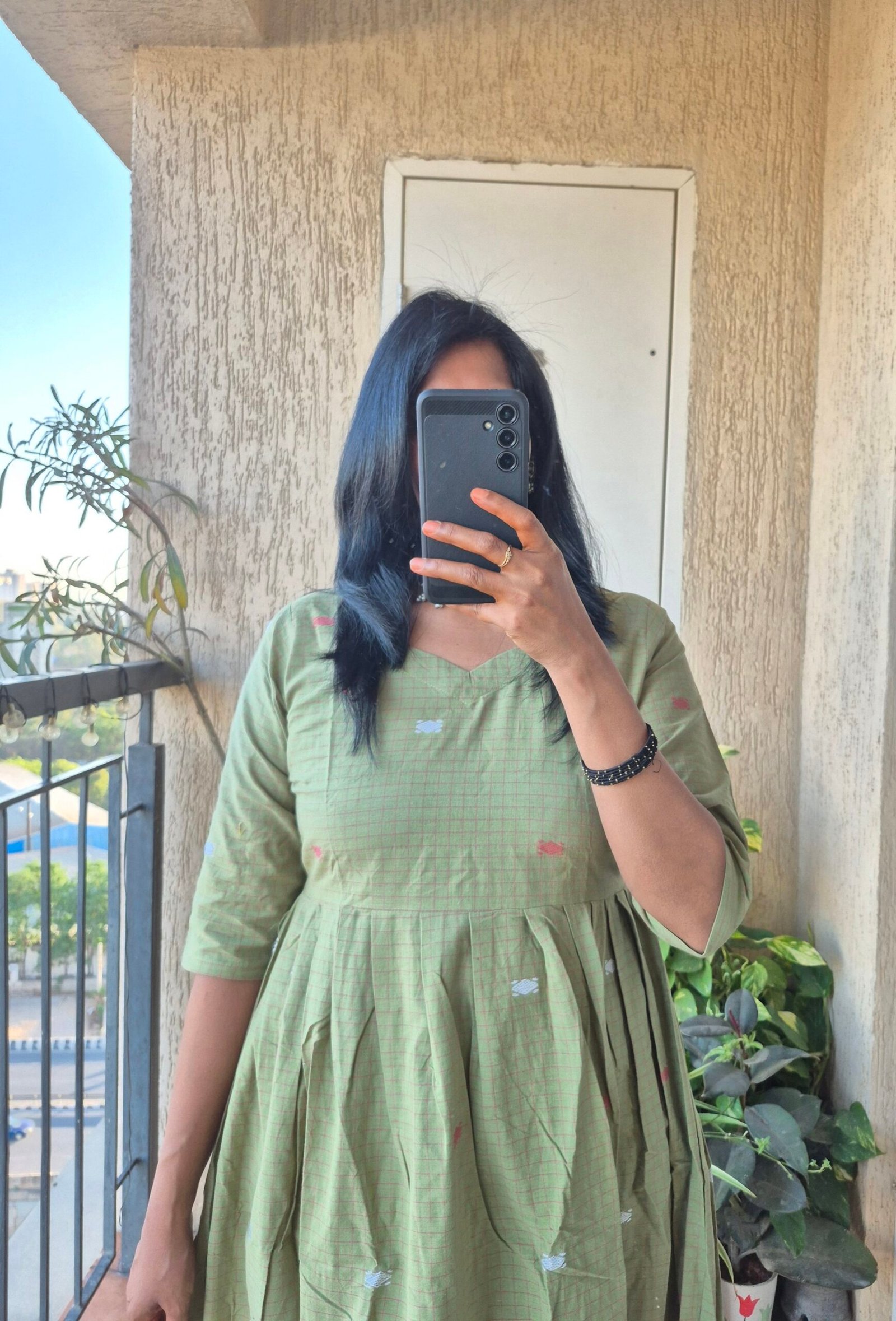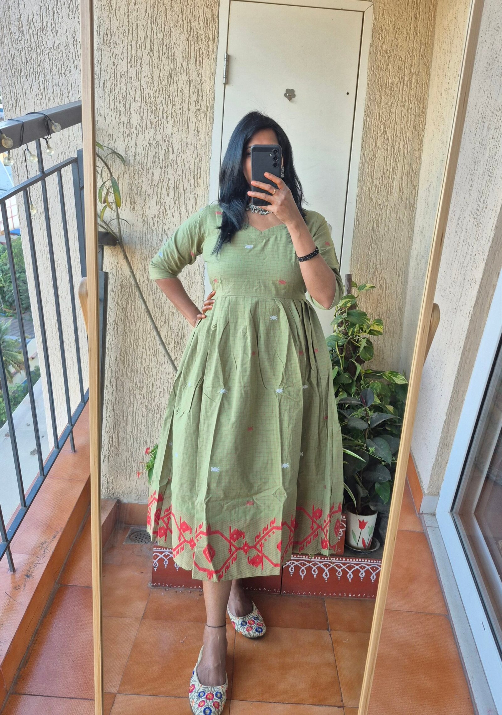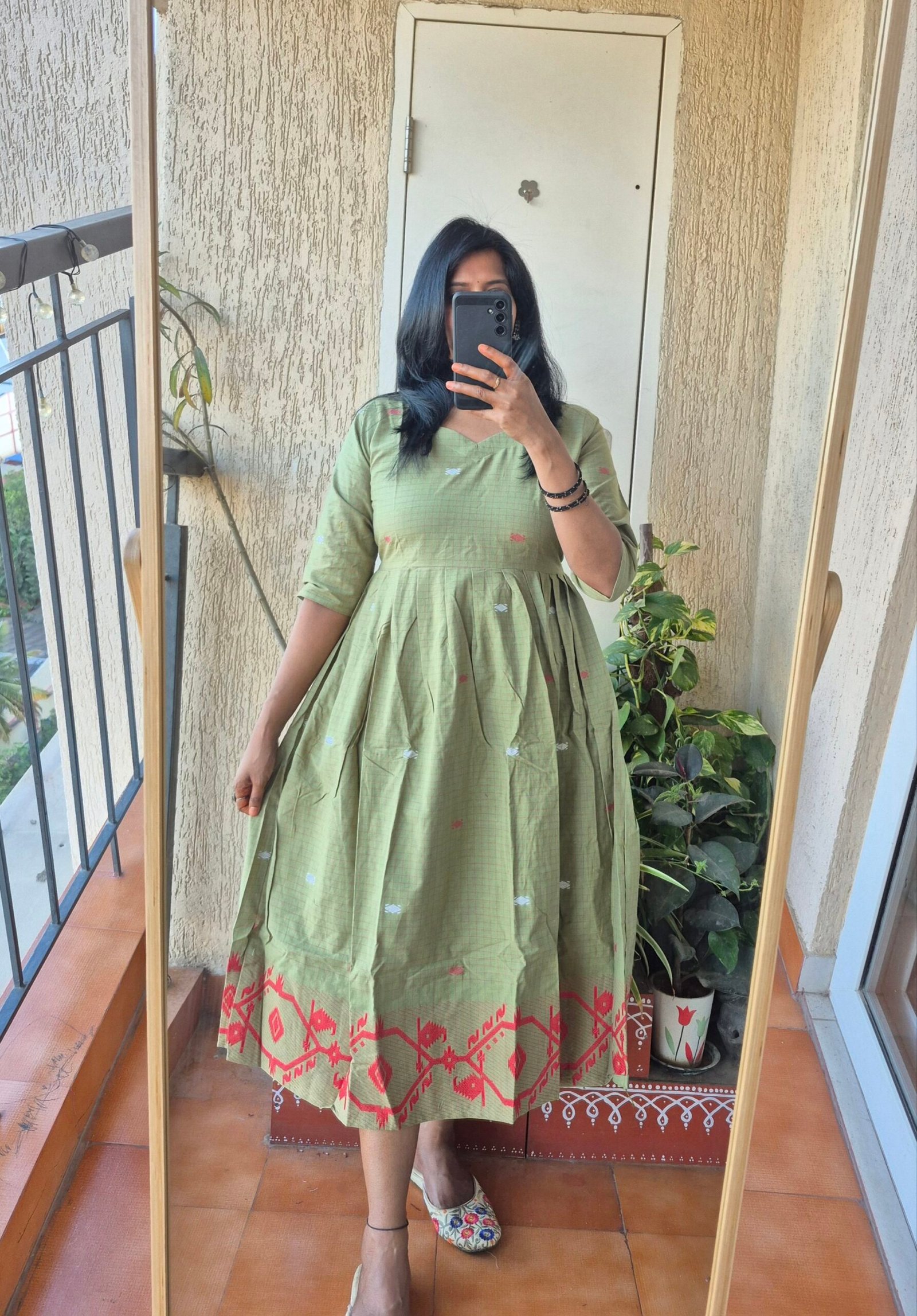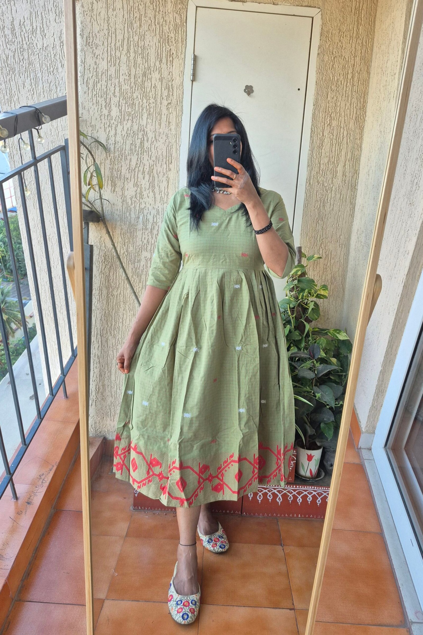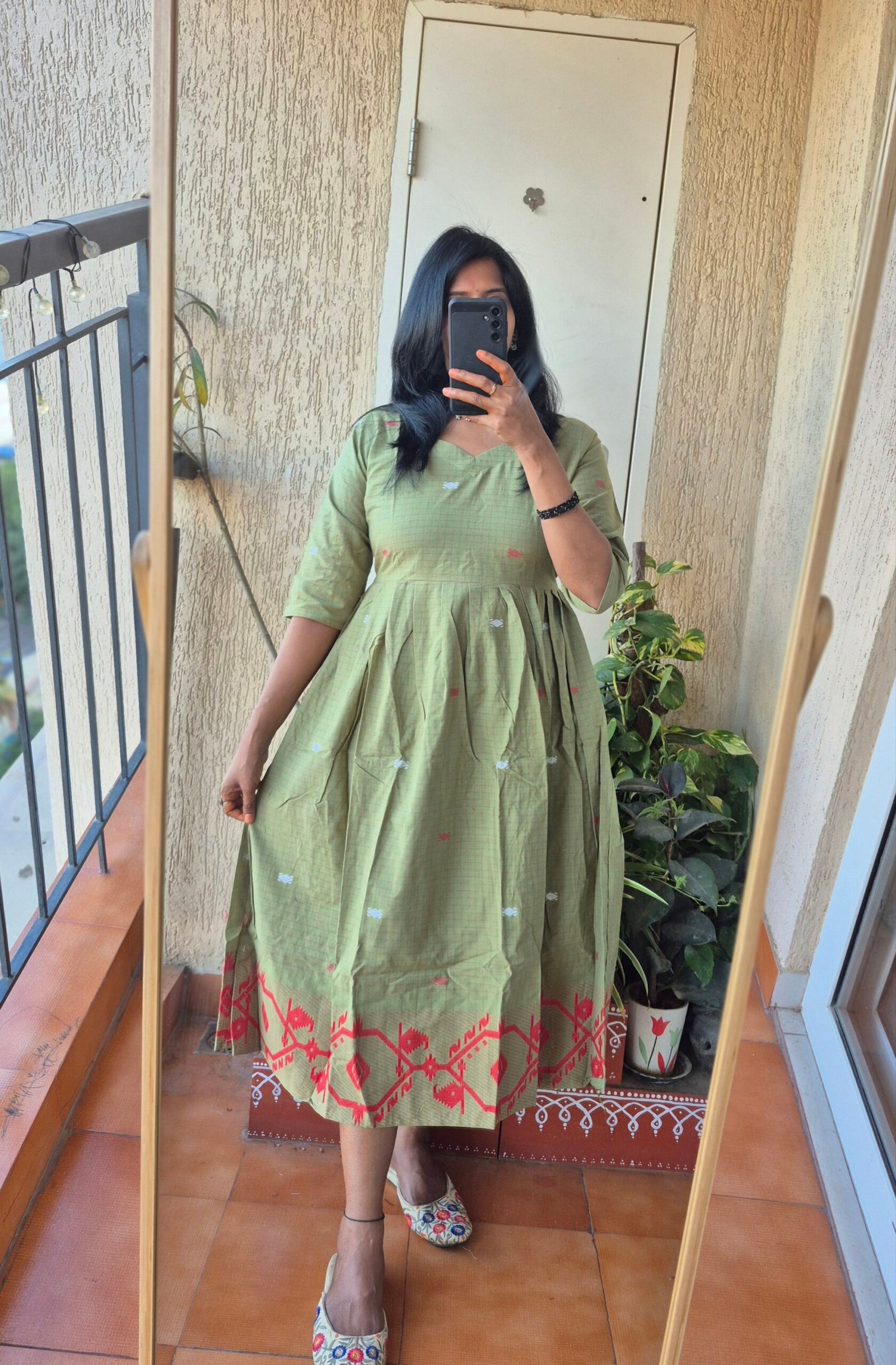 Beautiful pista green checks Jamdhaani dress comes with all over buttis and the highlight of the dress having beautiful Jamdhani weaving at the bottom which gives stunnig look for the dress.Length of the dress is 46 inches .Can be styled multiple ways pair it with a palazzo or a legging or just wesr as it is.