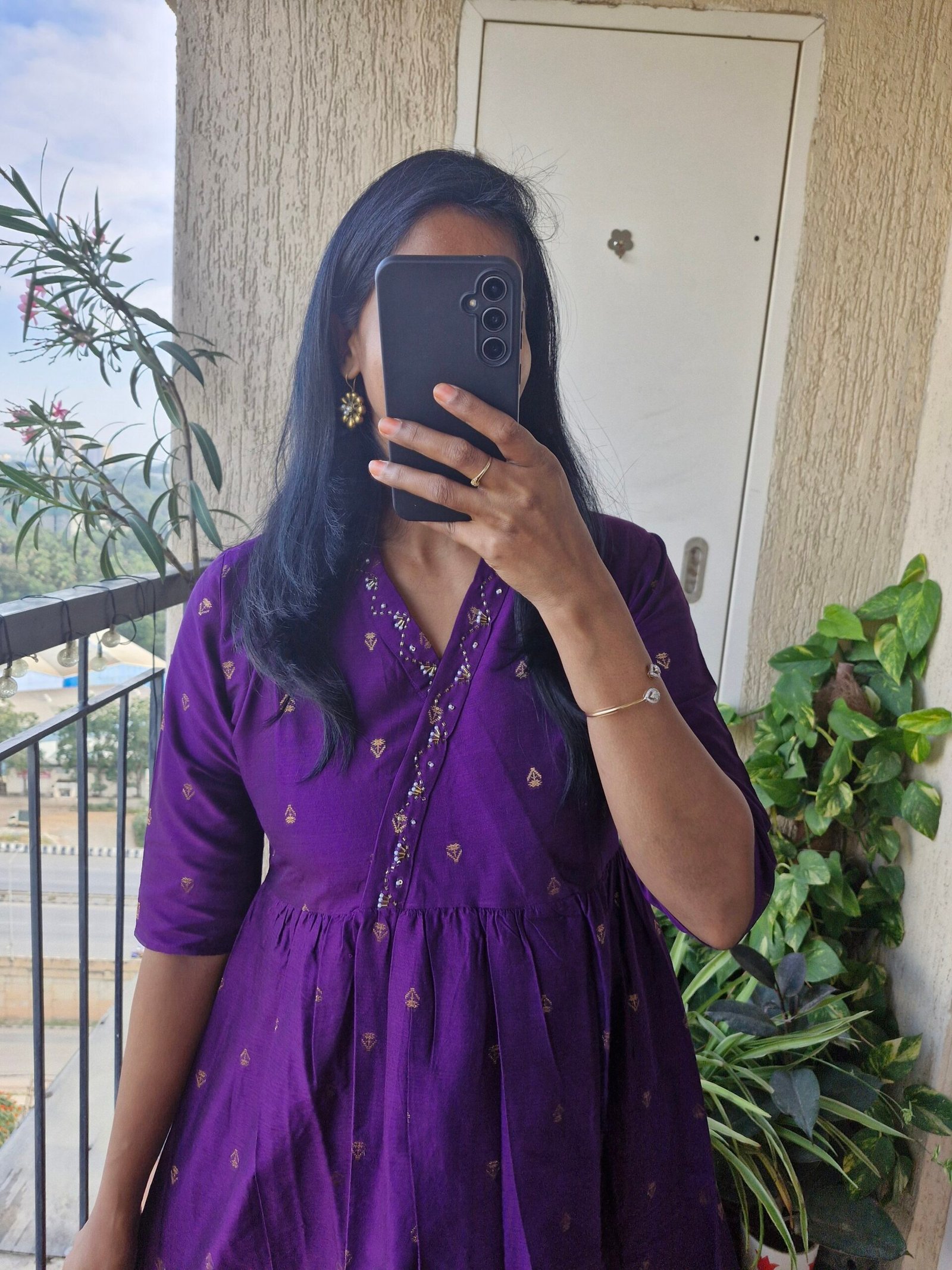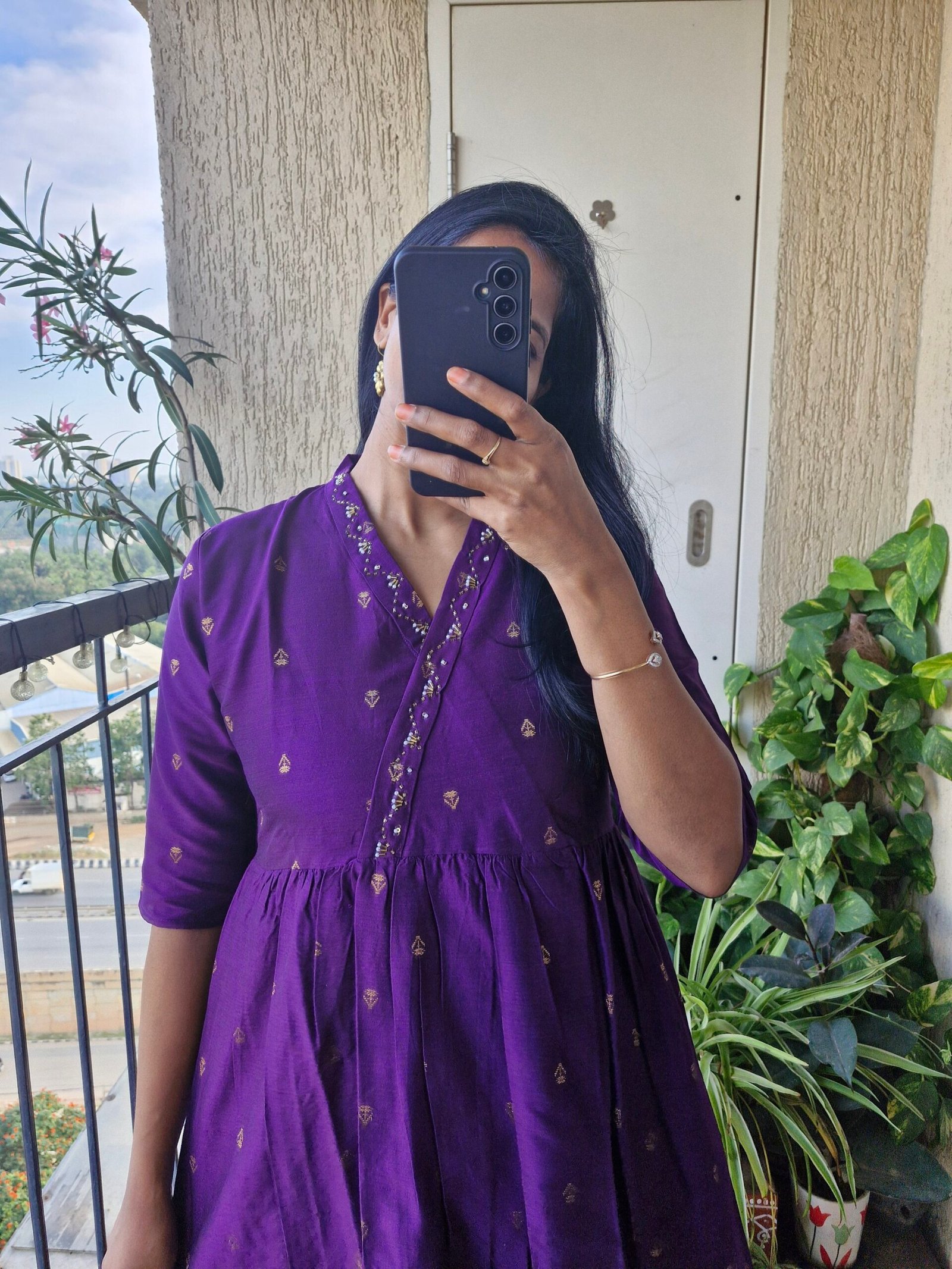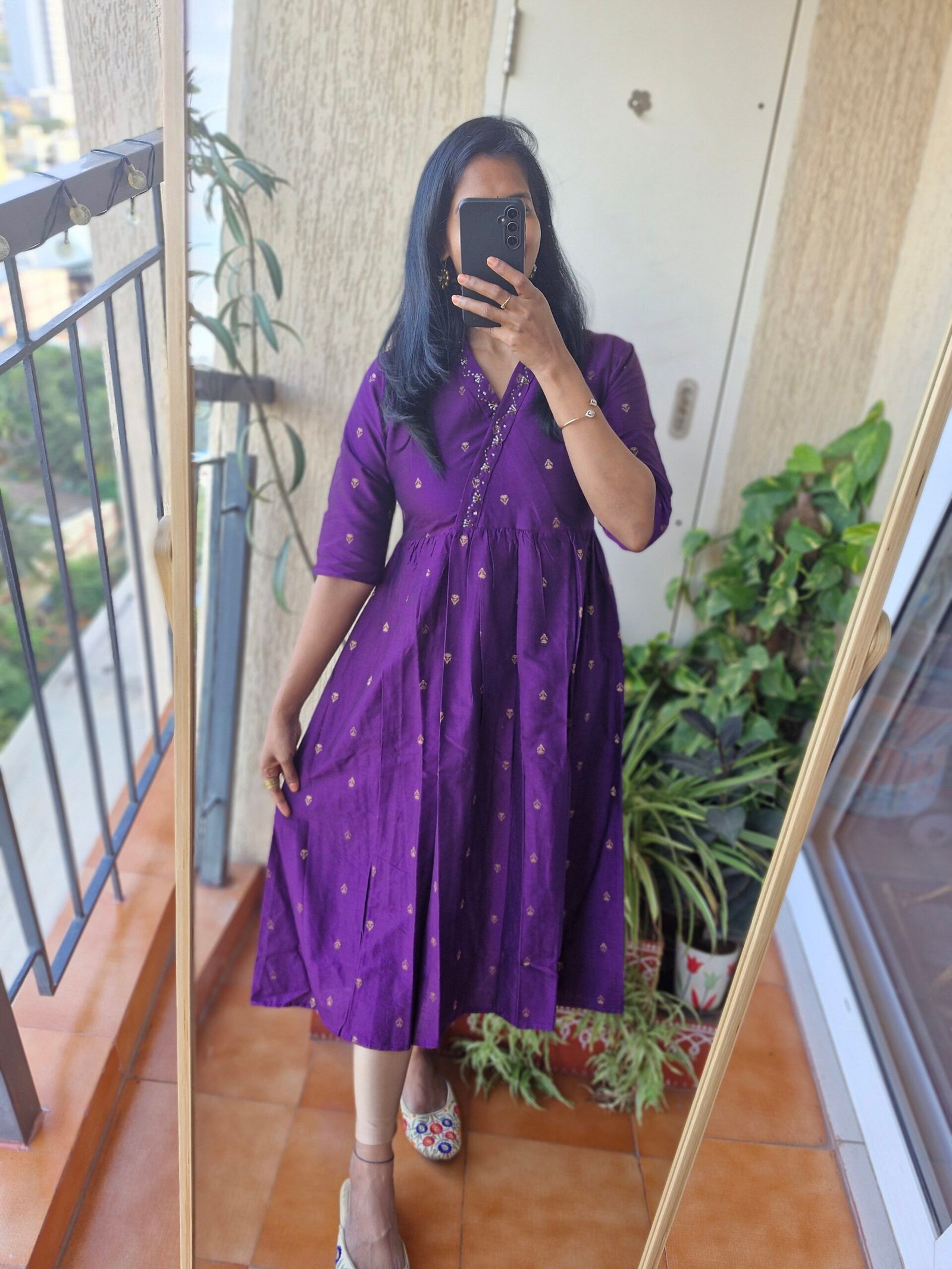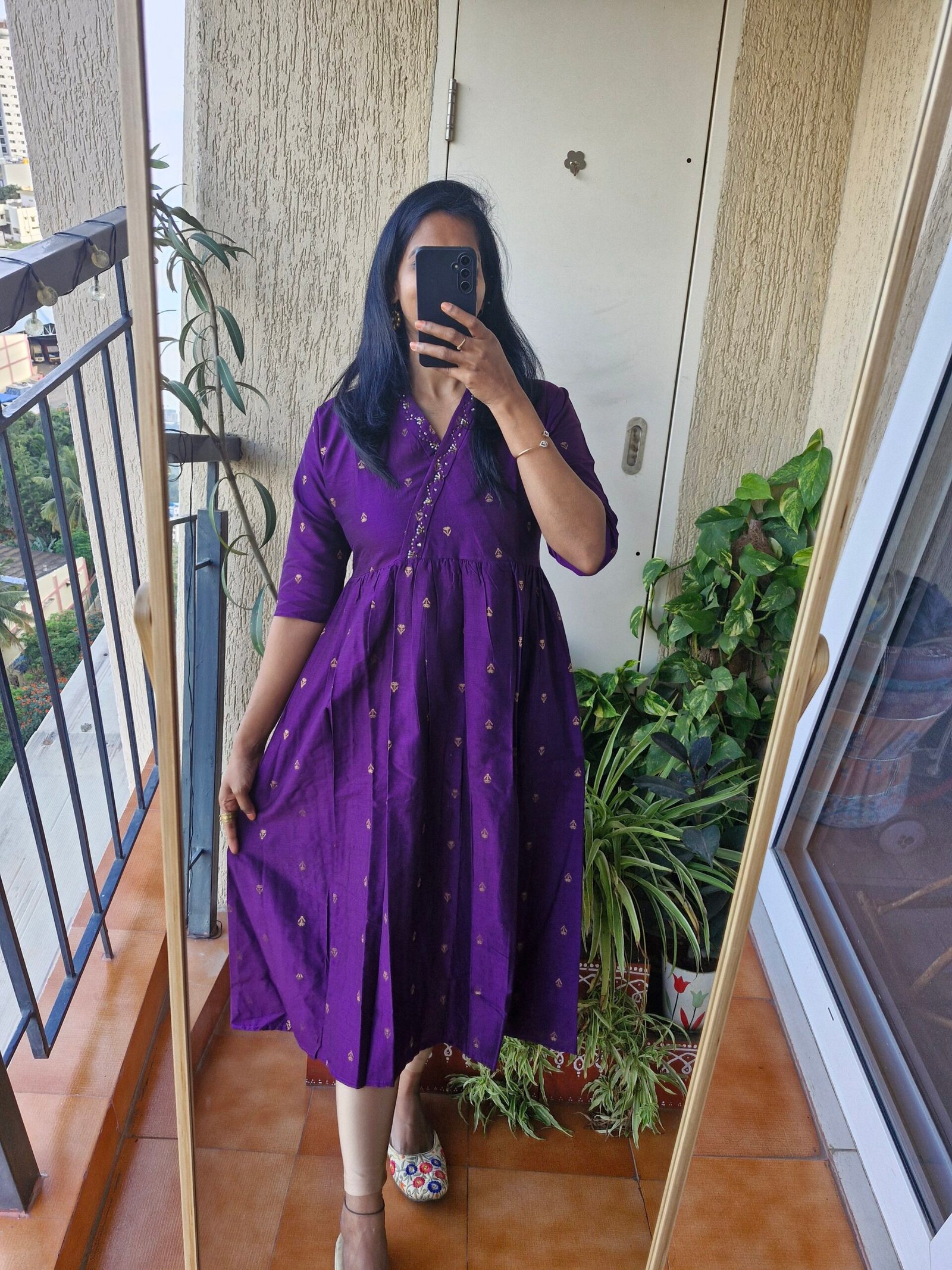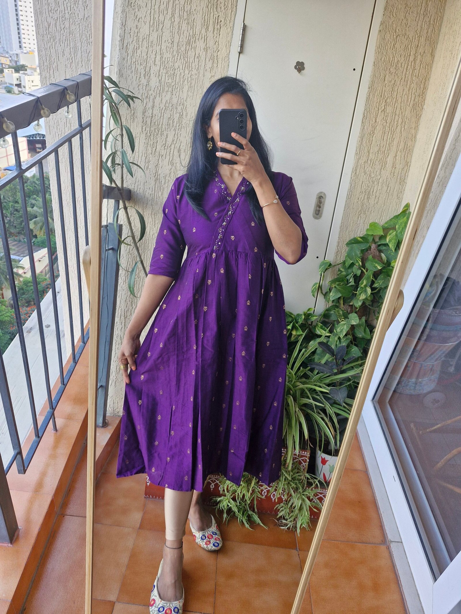 Stunning Raw silk kurta A line dress comes with a beautiful pearl work on yoke part with stylish neck detailing and the length of the dress is 45 inches comes with a pocket. This dress runs little lower than actual size so we have made size L to M (38). So please choose as per your bust size and dont choose big size as we have already adjusted with extra inches.