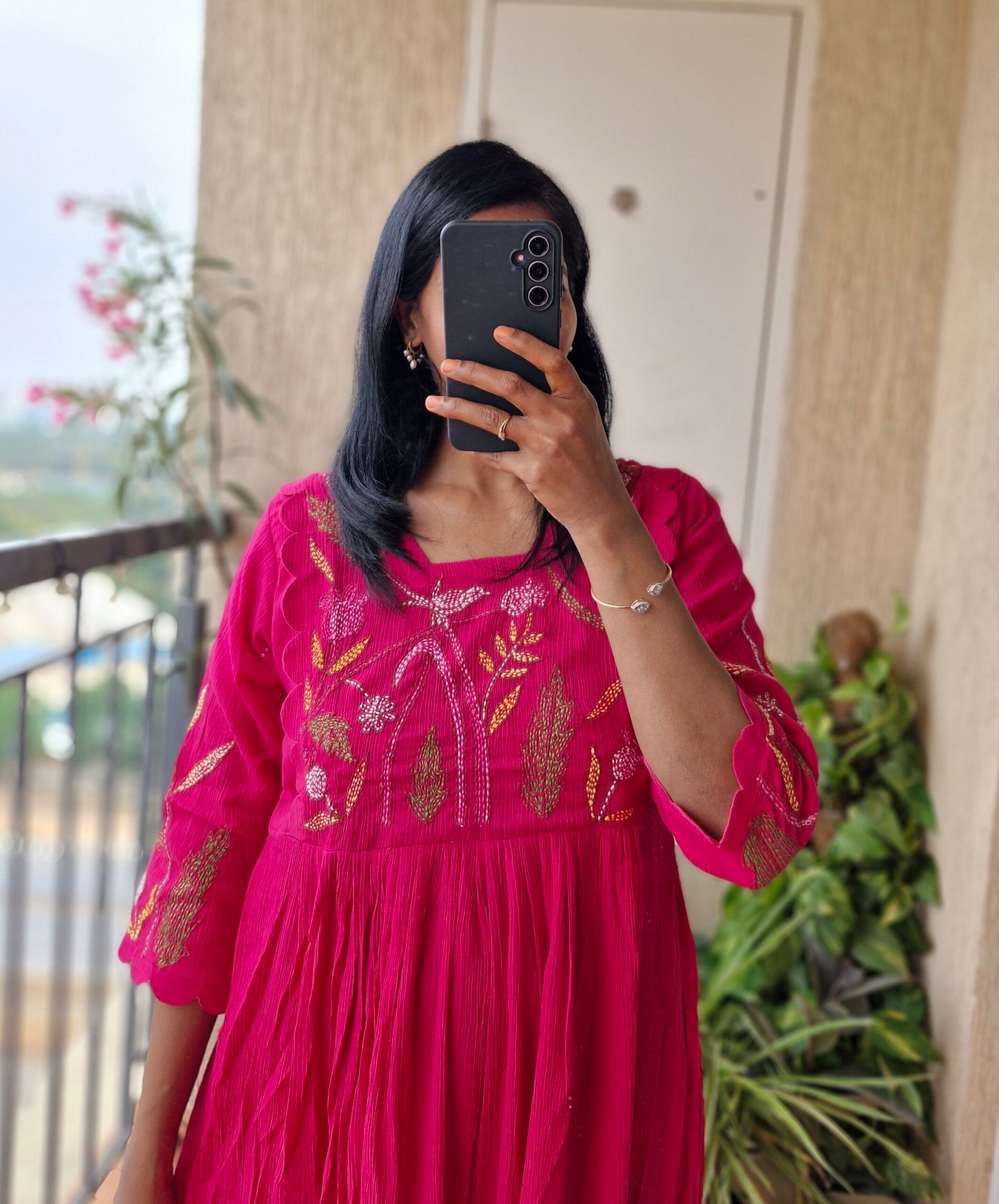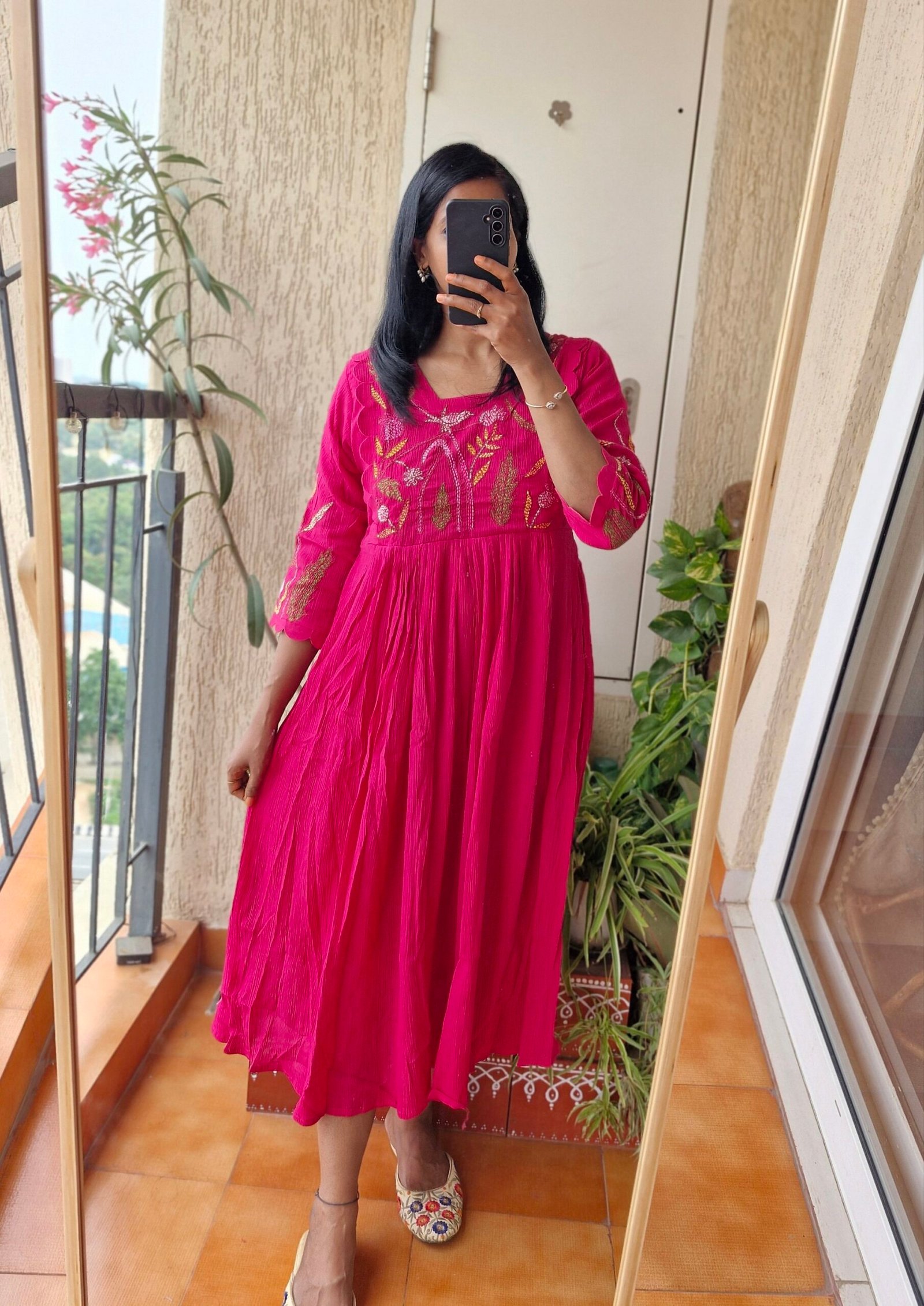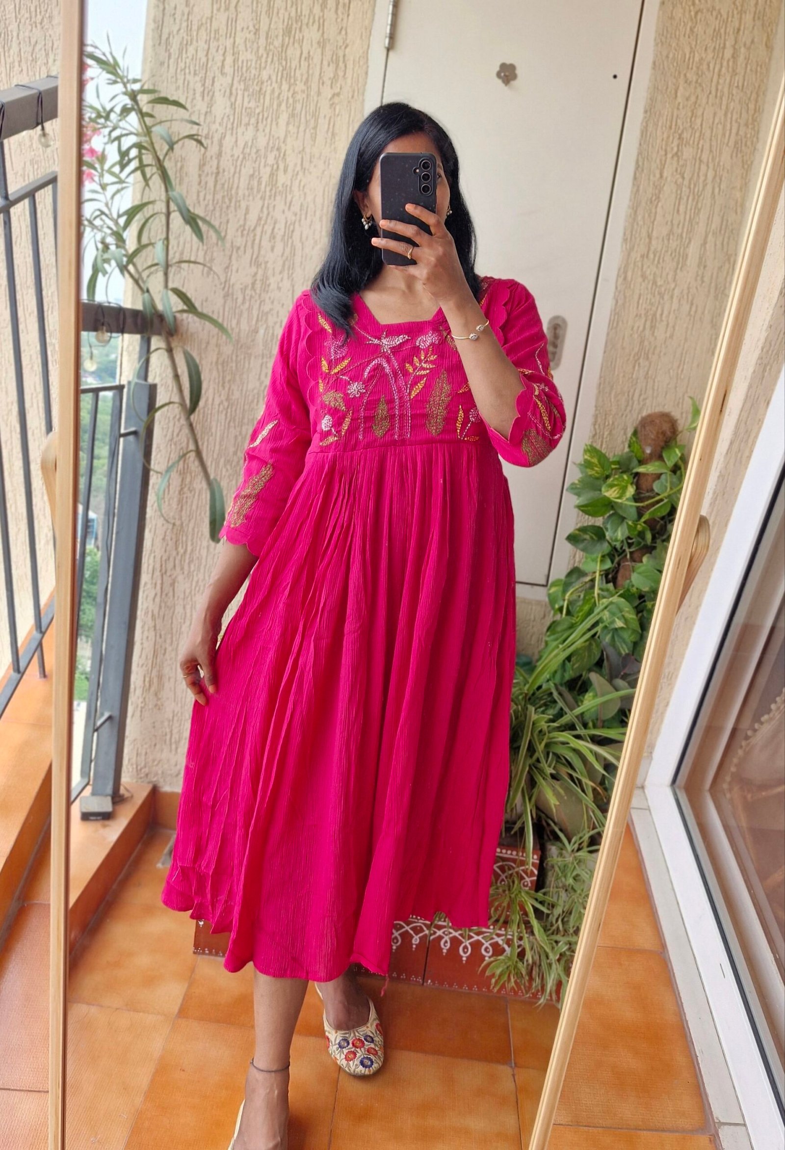 Beautiful Rani pink crushed Mul cotton dress comes witha. abeuatiful kantha work on yoke and sleeves part and the length of the dress is 46 inches.