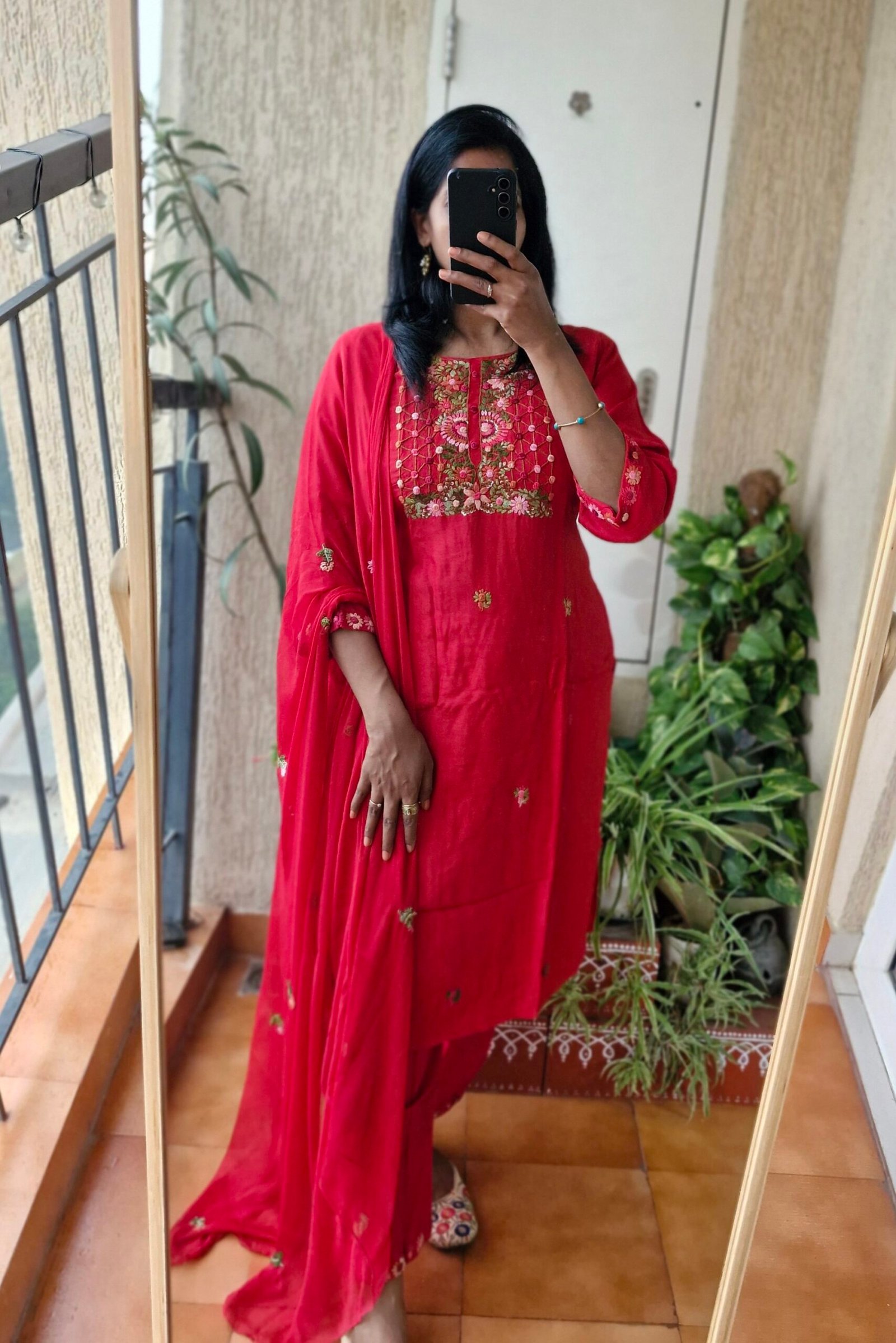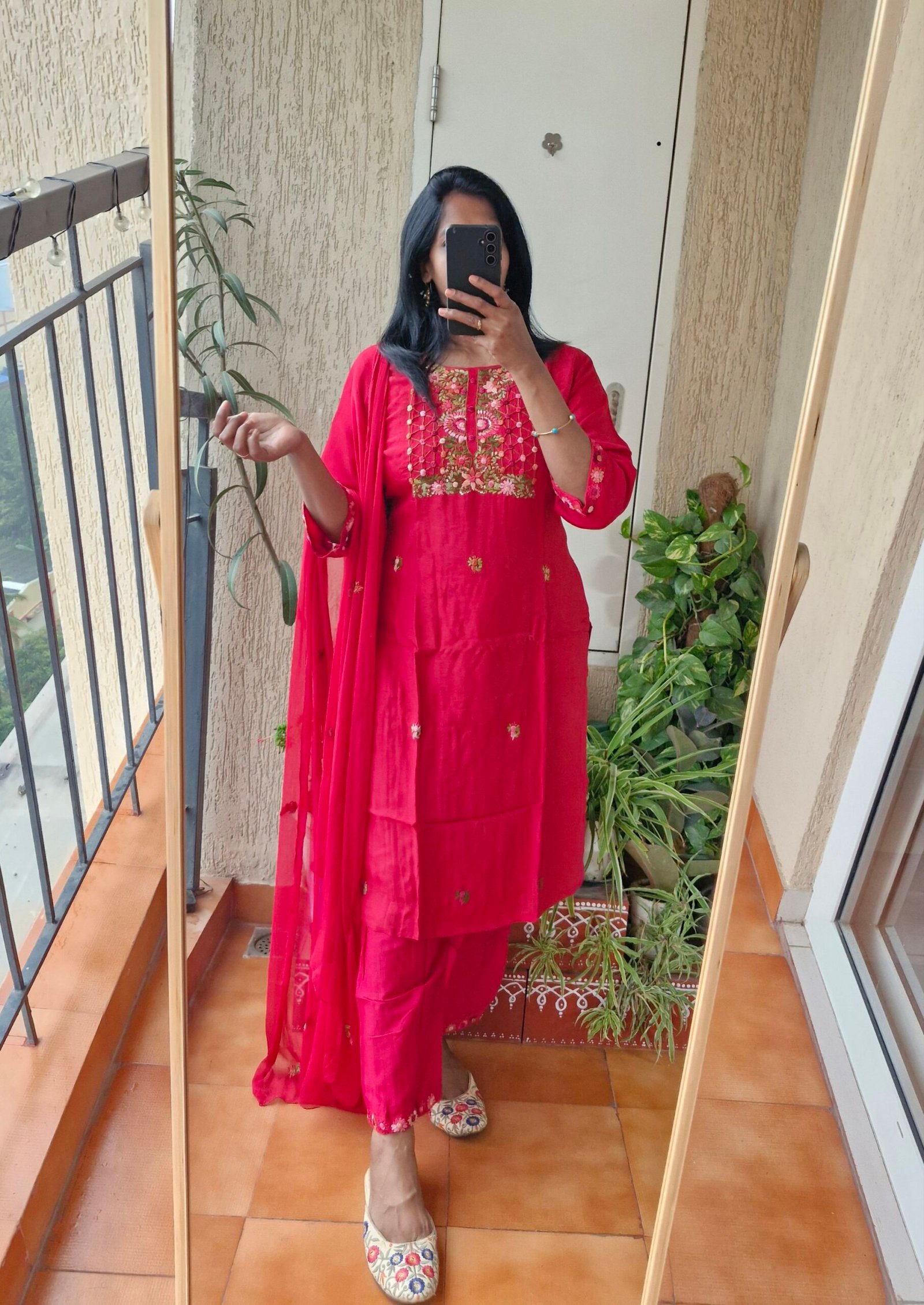 Premium Red chinon kurta set with beautiful embroidery on yoke part comes with a chiffon dhupatta.Length of the dress is