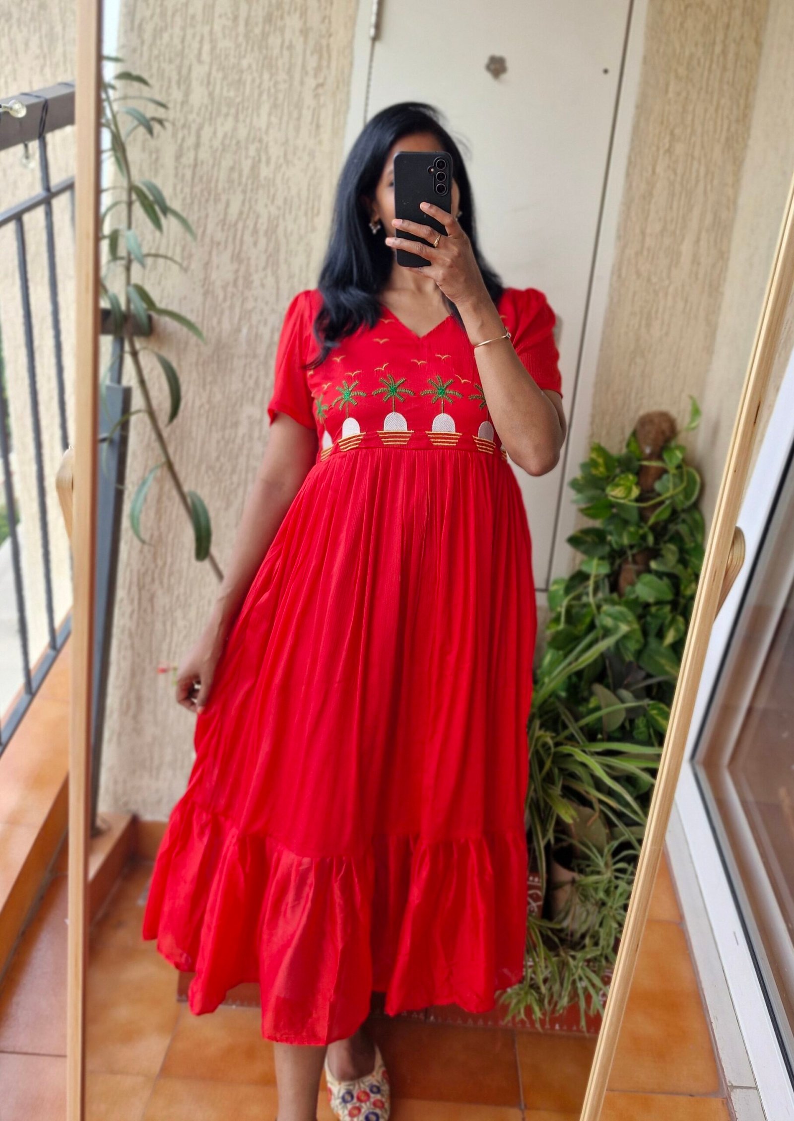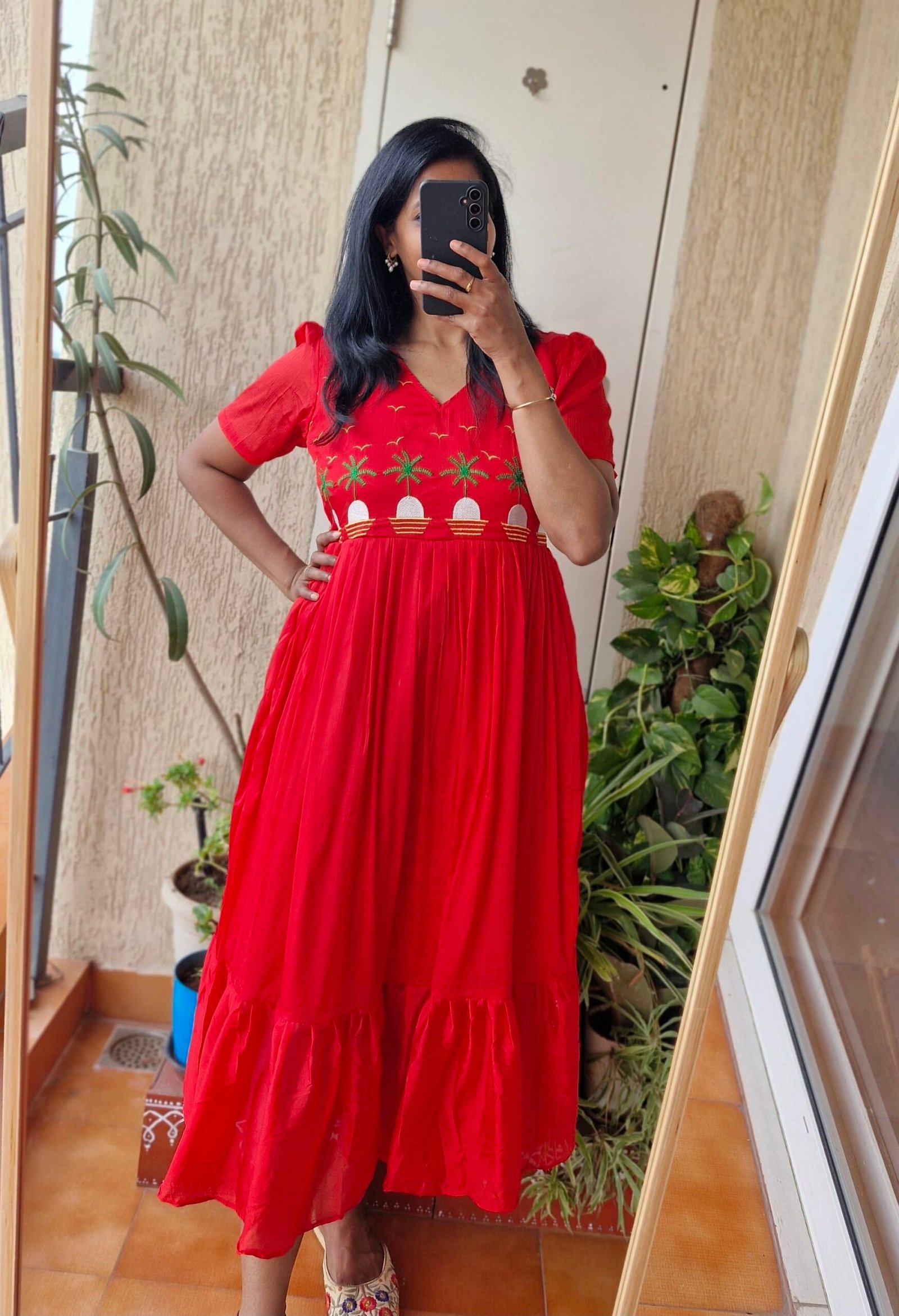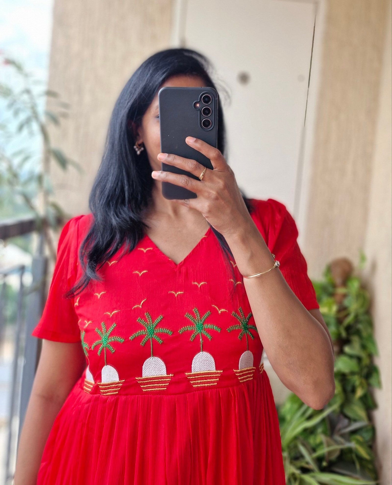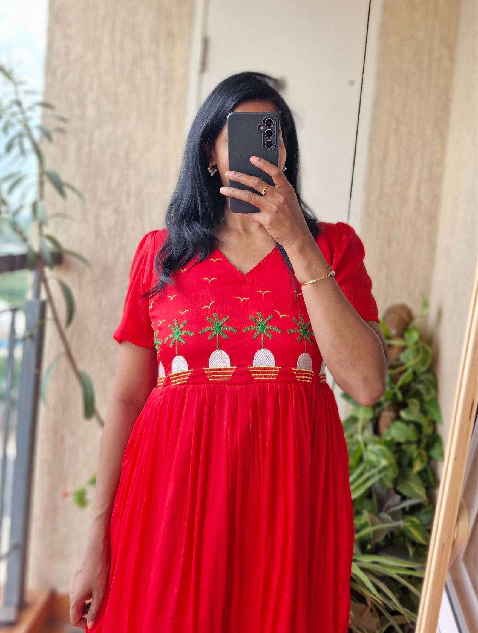 Red costal Chinon frock comes with a full lining super lightweight and travel friendly.Length of the dress is 47 inches.