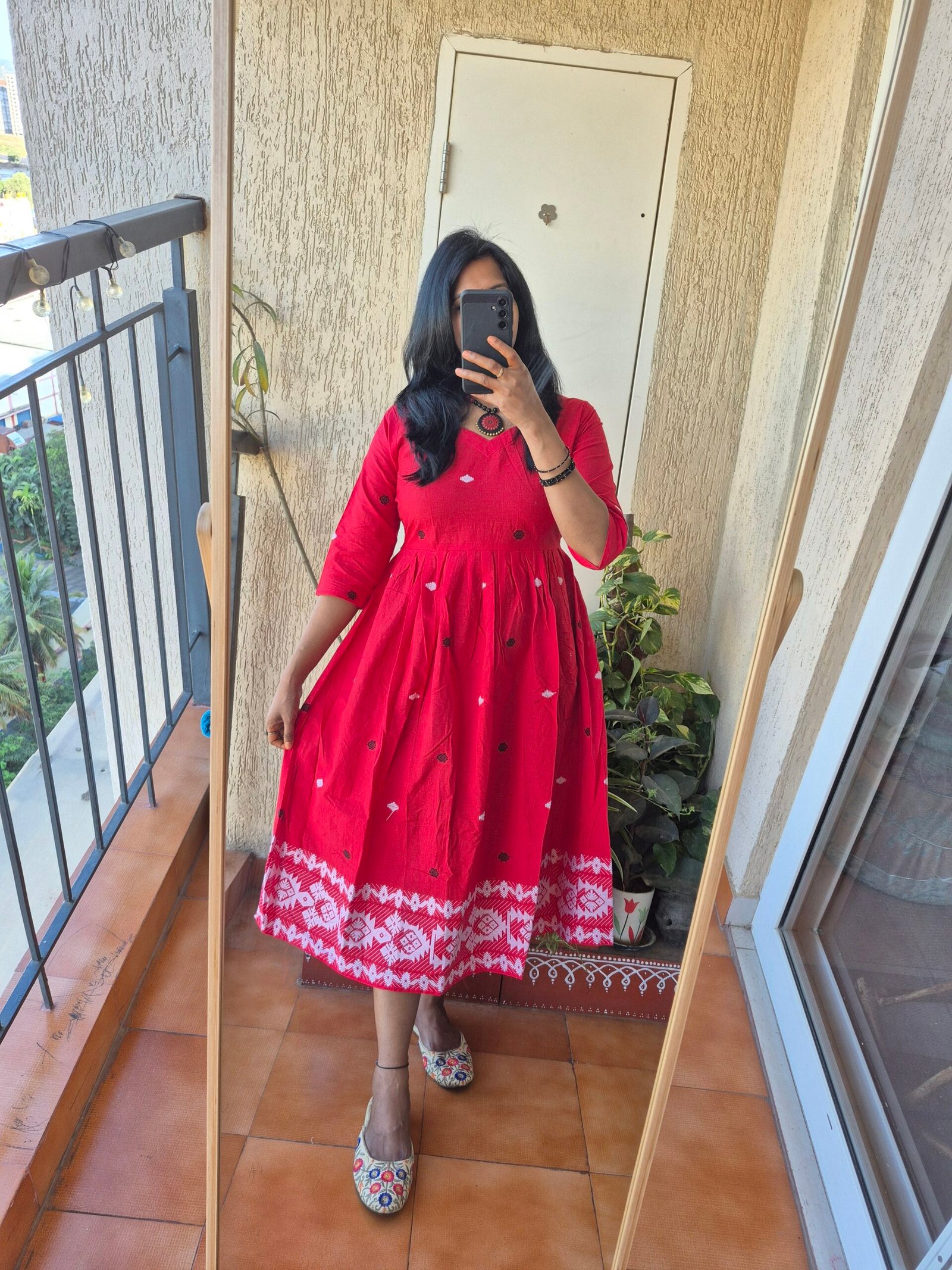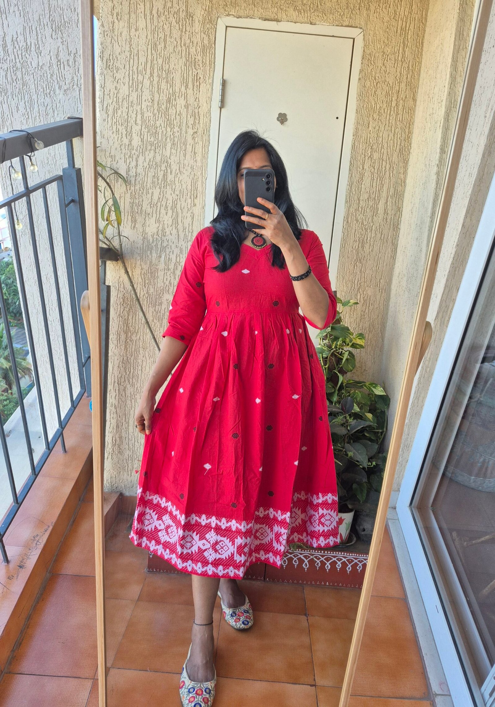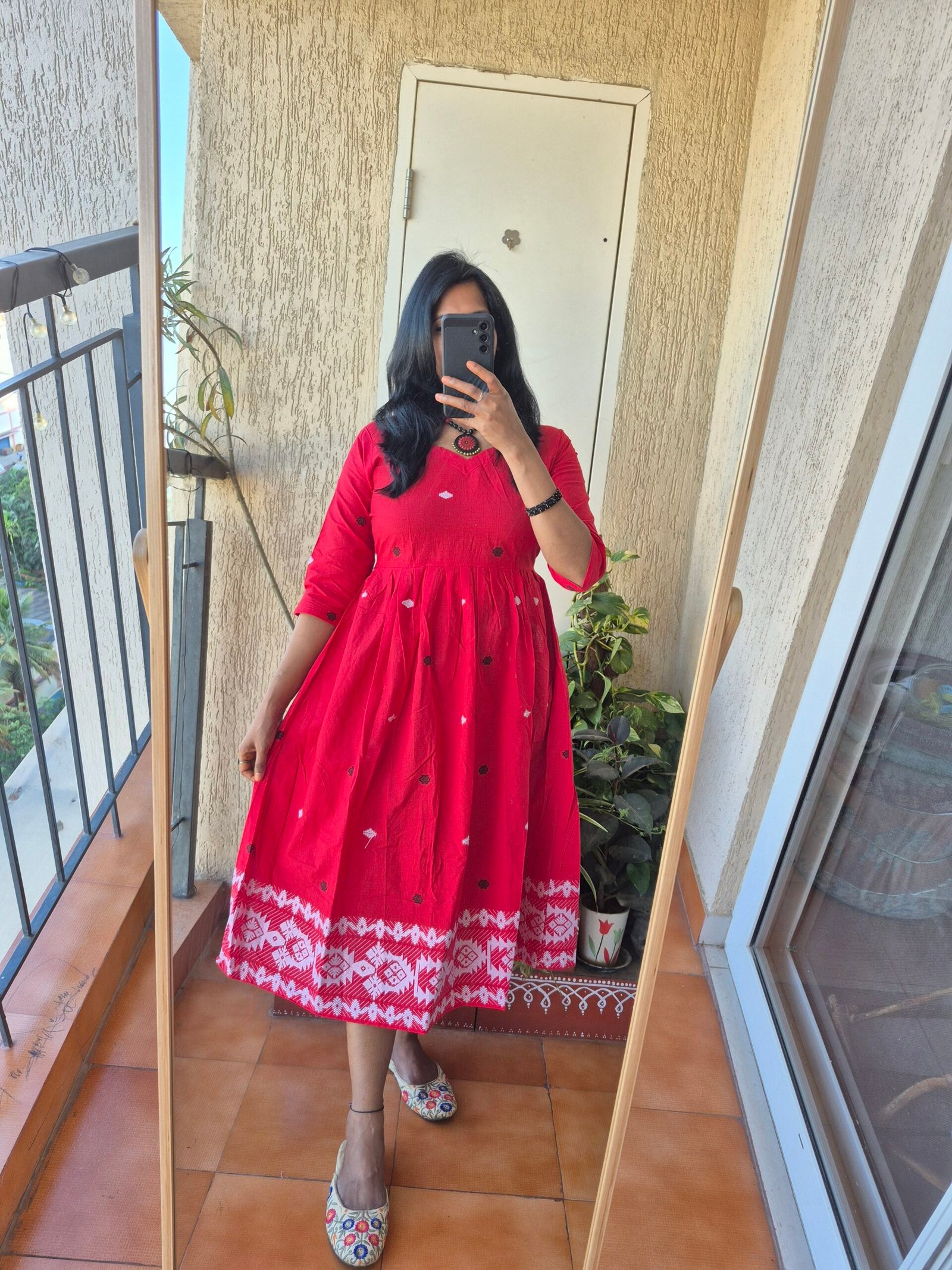Beautiful Red checks Jamdhaani dress comes with all over buttis and the highlight of the dress having beautiful Jamdhani weaving at the bottom which gives stunnig look for the dress.Length of the dress is 46 inches .Can be styled multiple ways pair it with a palazzo or a legging or just wesr as it is.