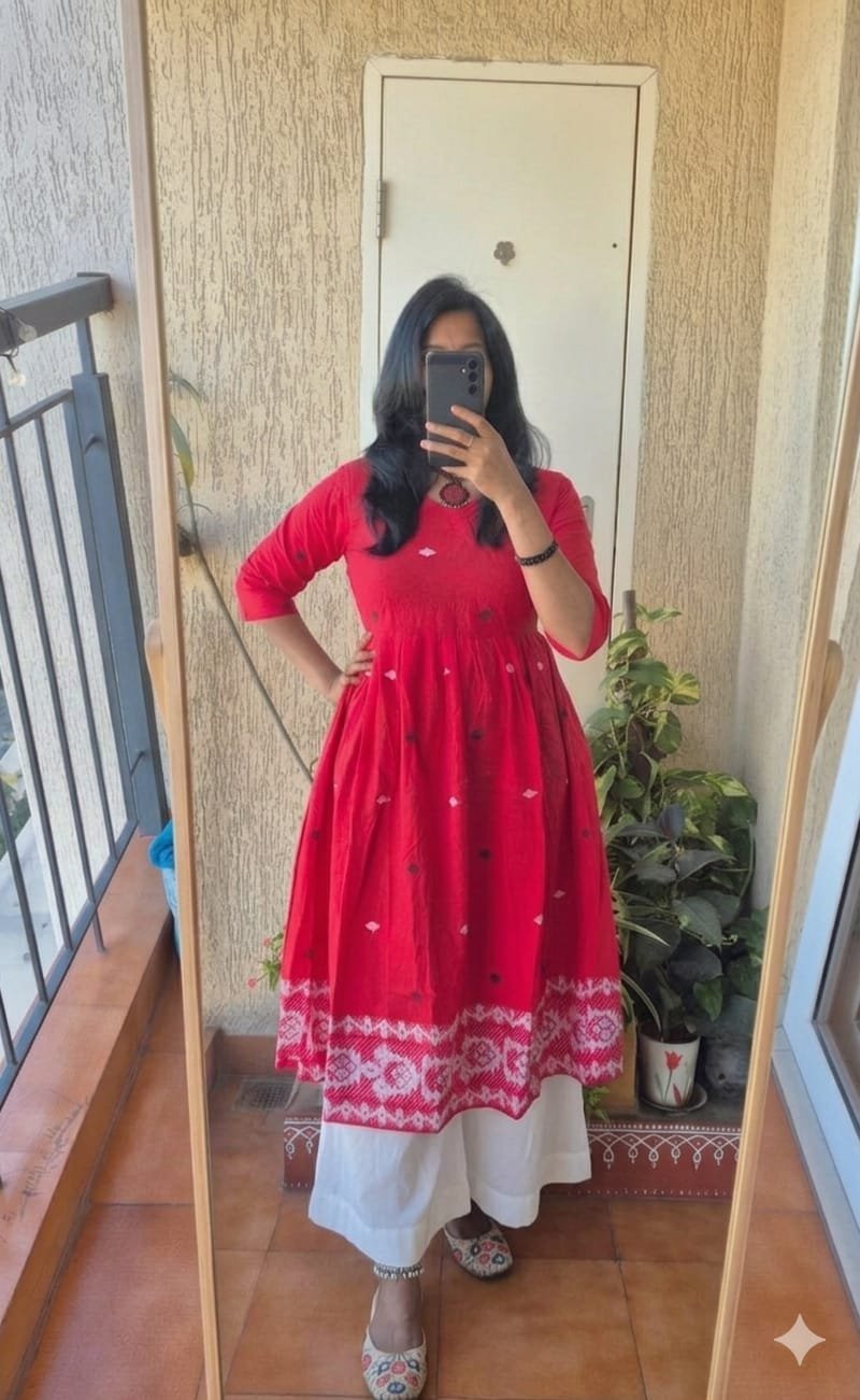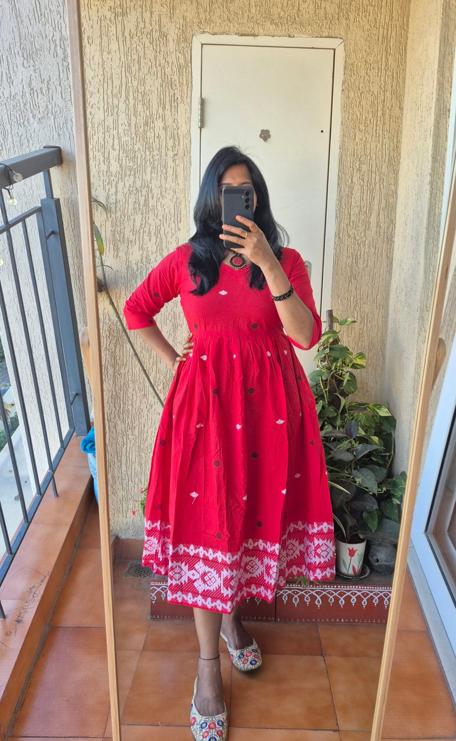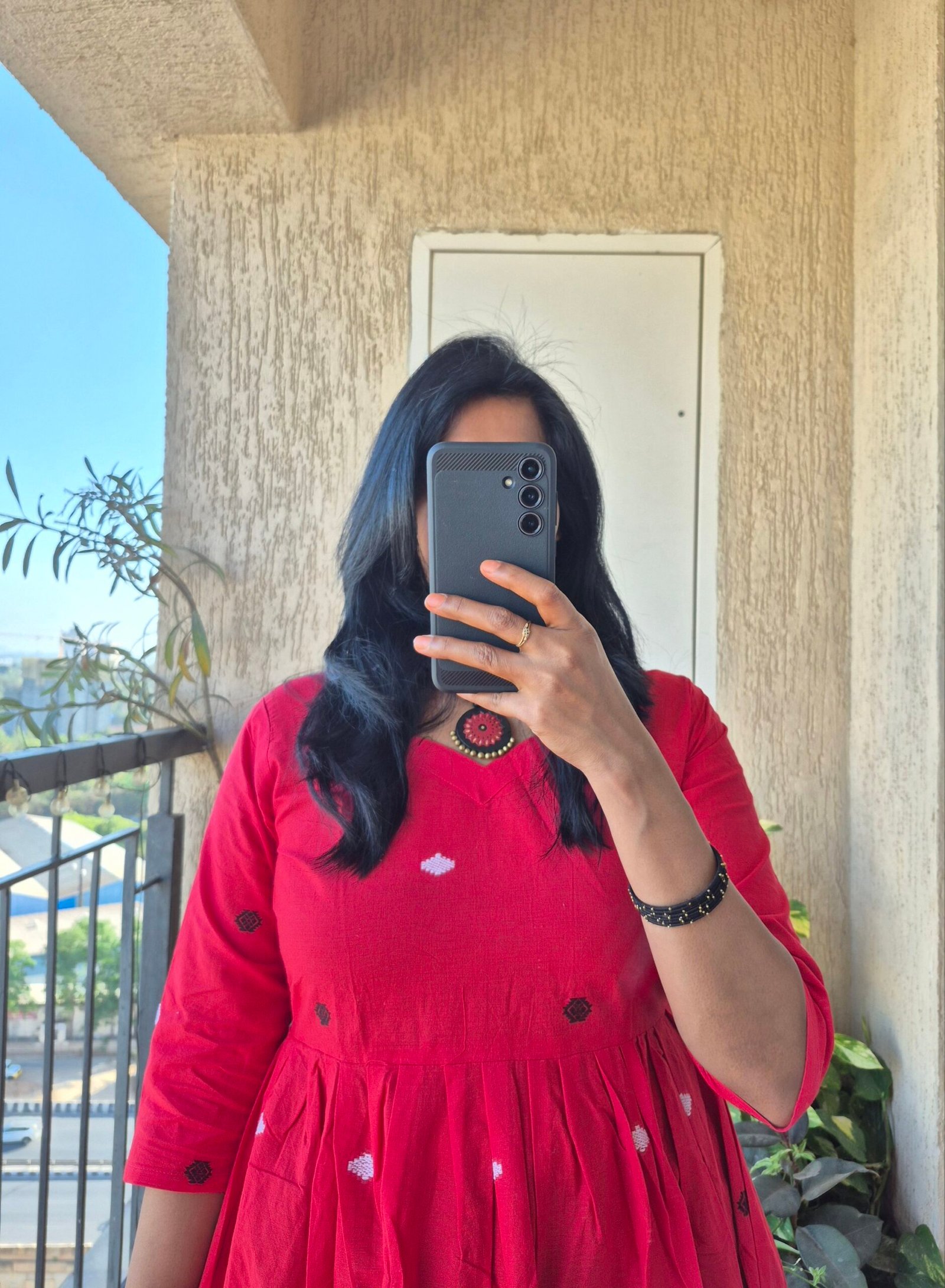 Beautiful Red checks Jamdhaani dress comes with all over buttis and the highlight of the dress having beautiful Jamdhani weaving at the bottom which gives stunnig look for the dress.Length of the dress is 46 inches .Can be styled multiple ways pair it with a palazzo or a legging or just wesr as it is.