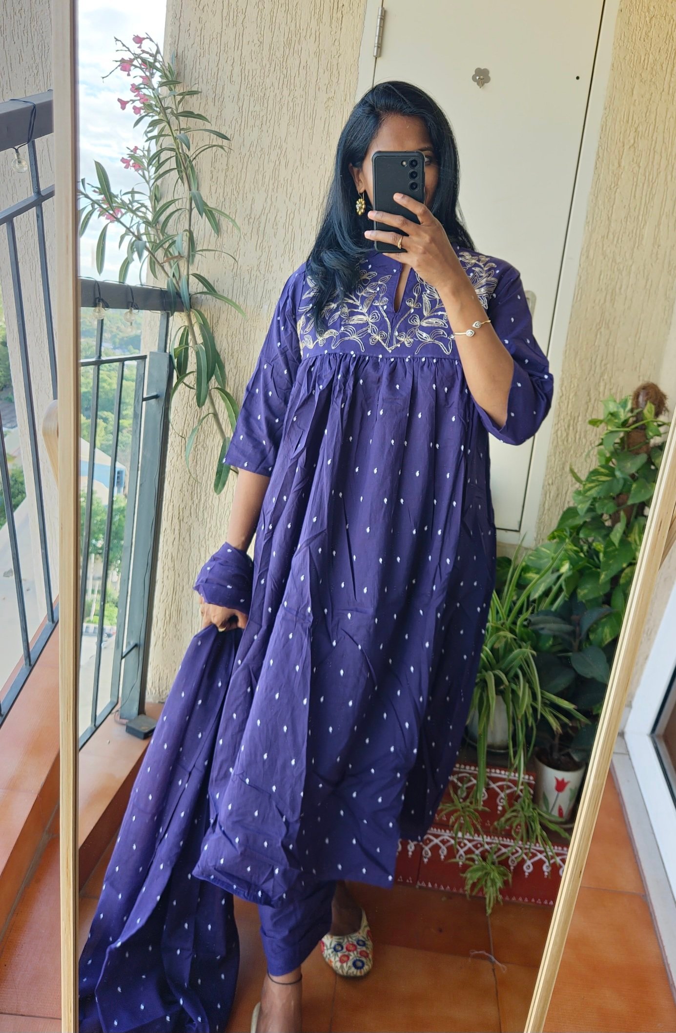 Violet cotton kurta set with thread work on yoke part and bandhini print all over.Length 46 inches.