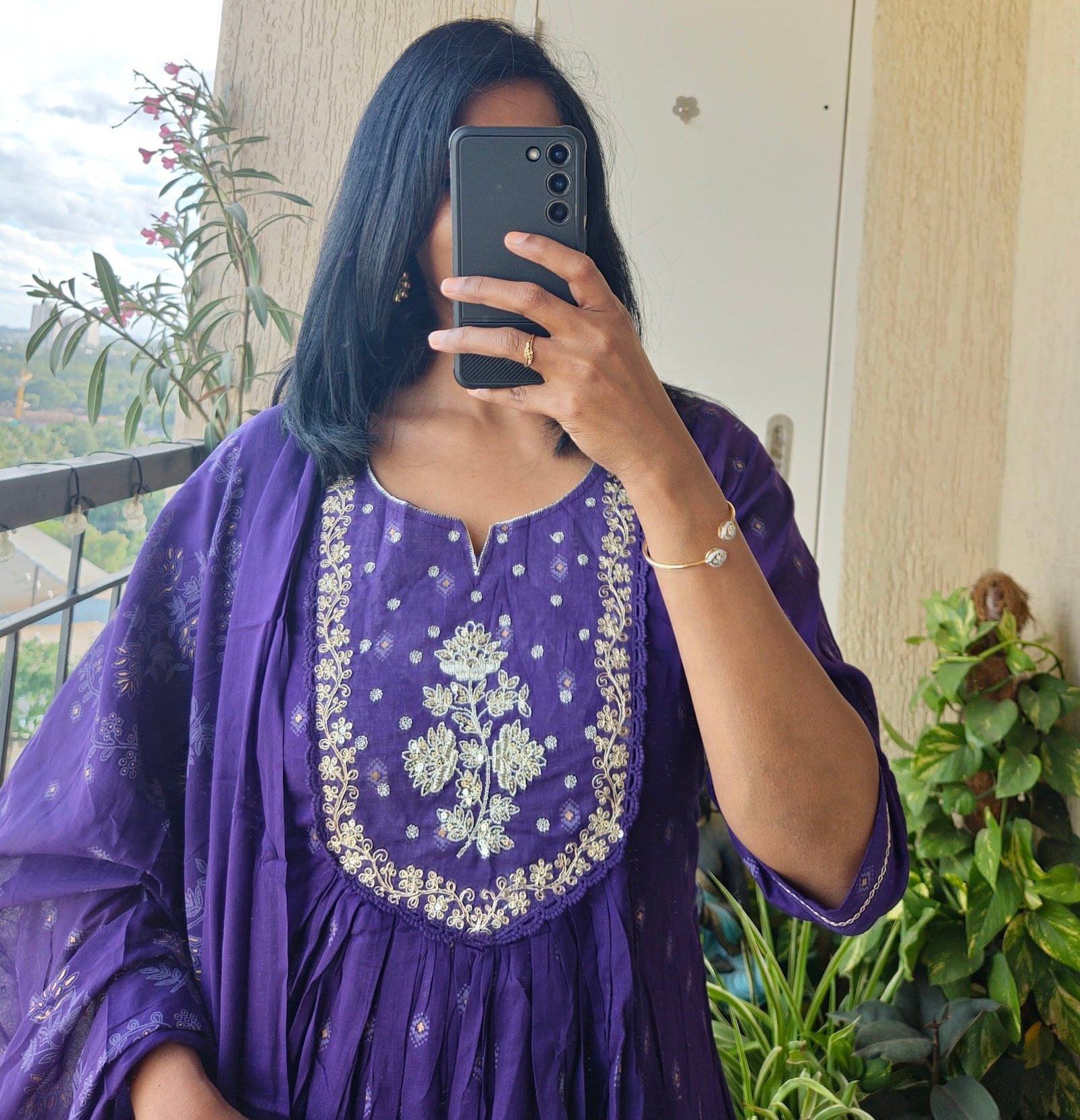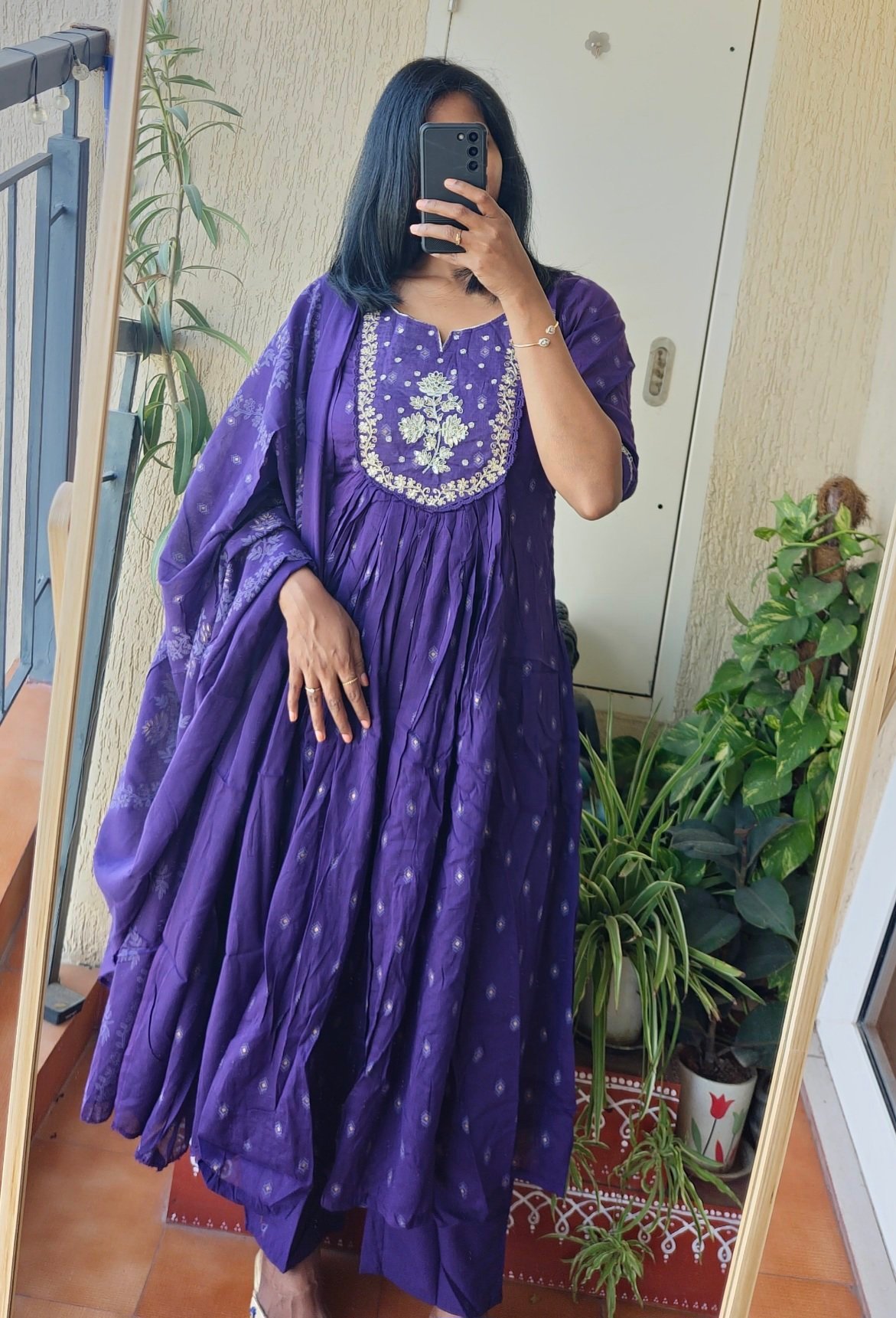 Purple Mul chanderi cotton kurta set with a beuatiful sequin work on yoke part and butti print all over.Length of the dress 48 inches.