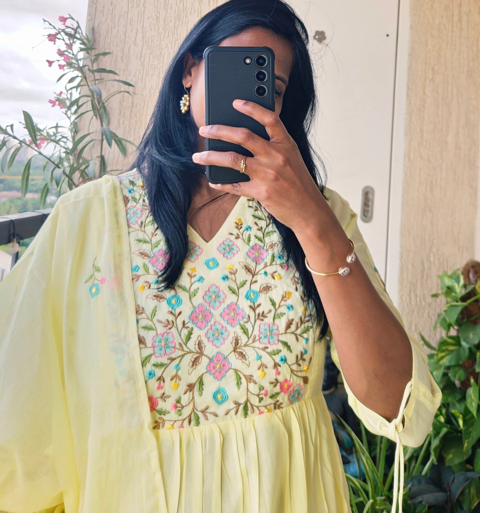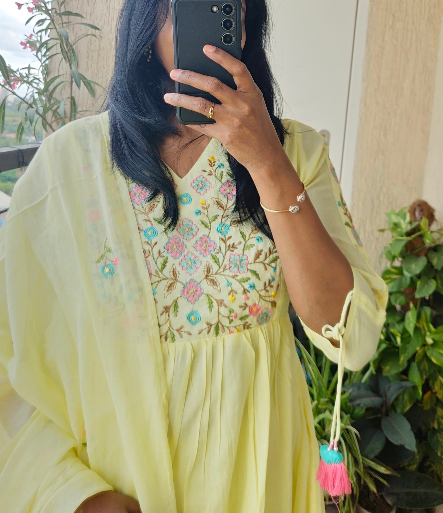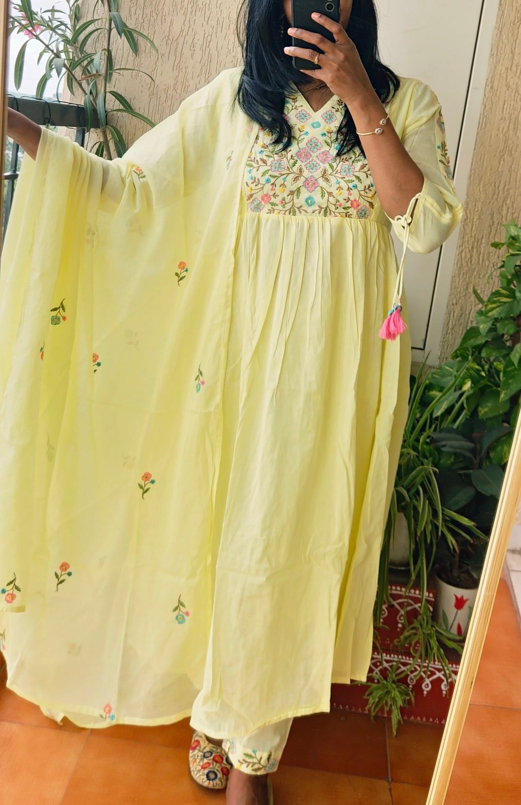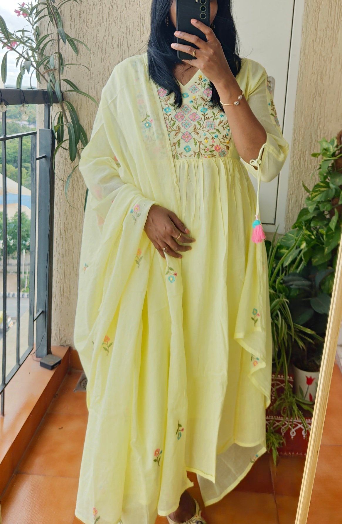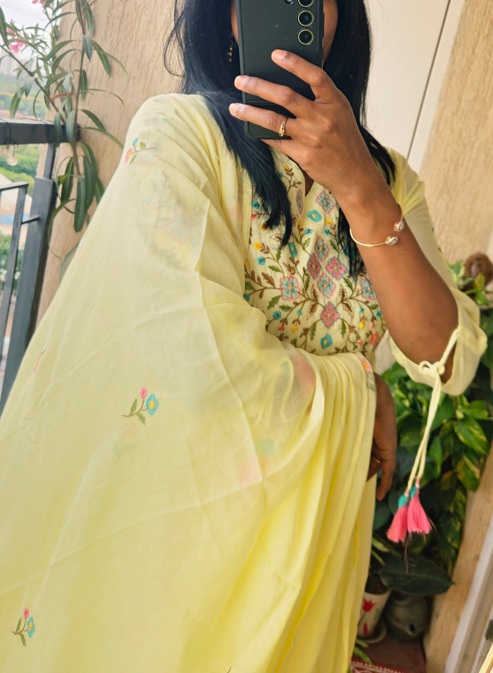 Lemon yellow mul cotton kurta set comes with a beautiful multi thread embroidery on yoke sleeves and bottom and cute buttis on dhupatta. Length 47 inches.