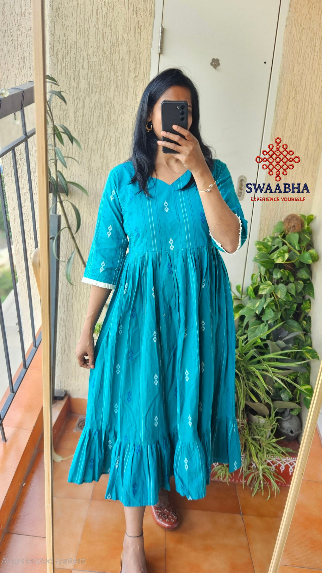Beautiful Peacock blue Jamdhani dress comes with a length of 48 inches.