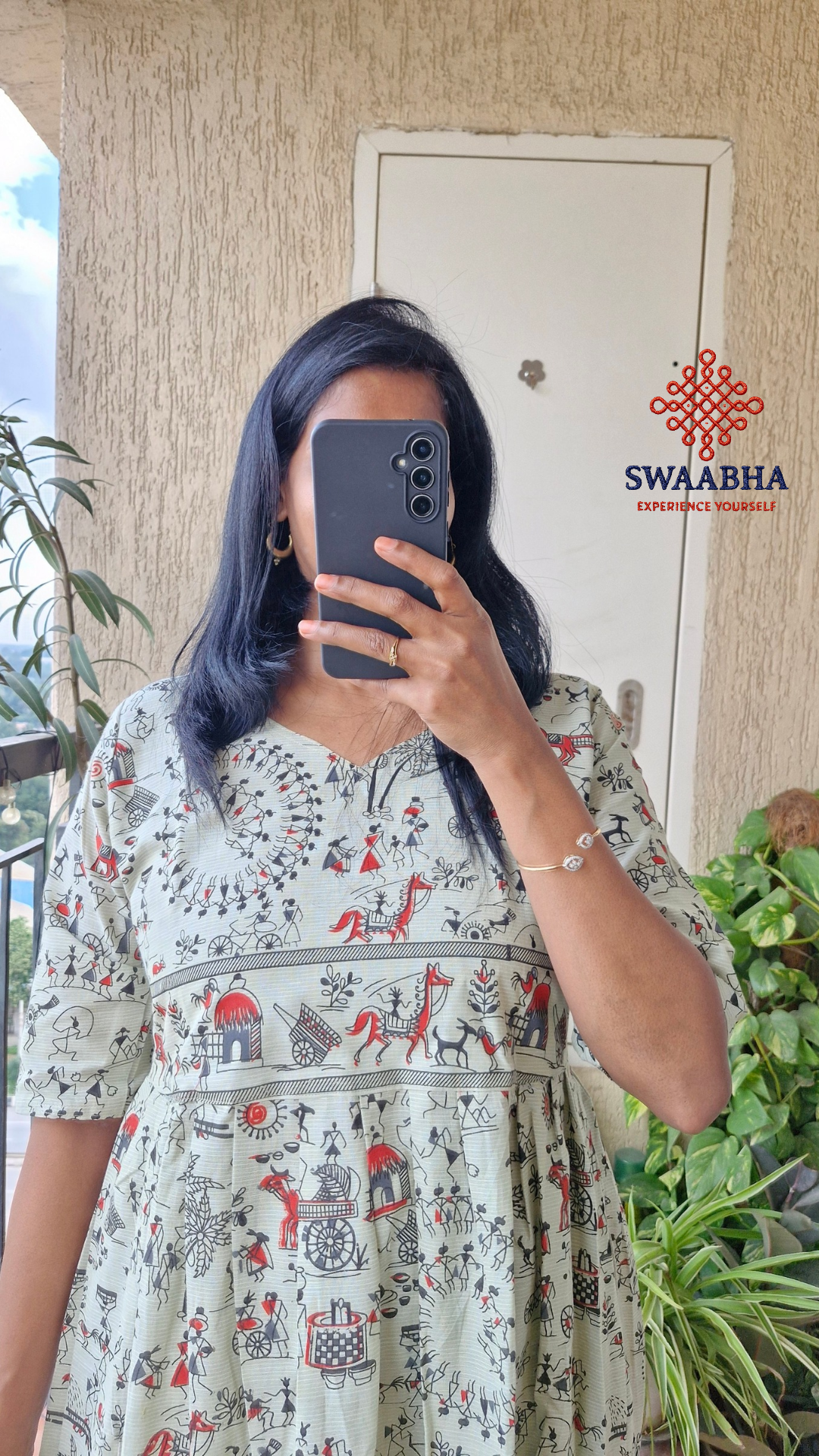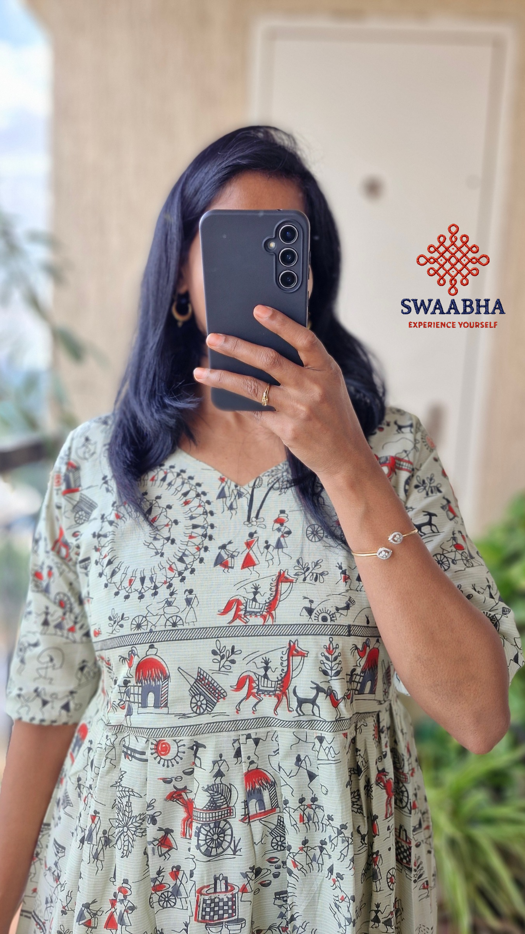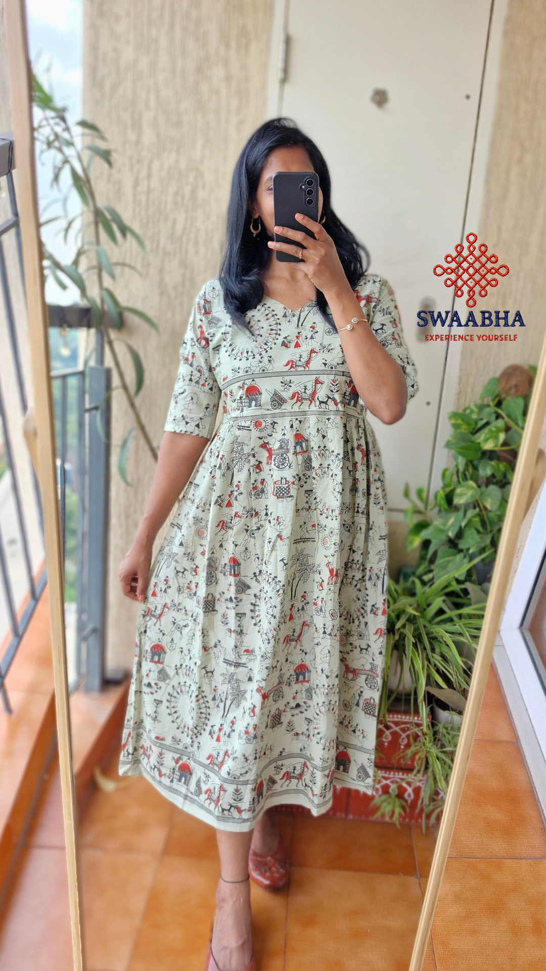 Beautiful varli design handloom cotton dress comes with a length 47 inches.Yoke part had lining.