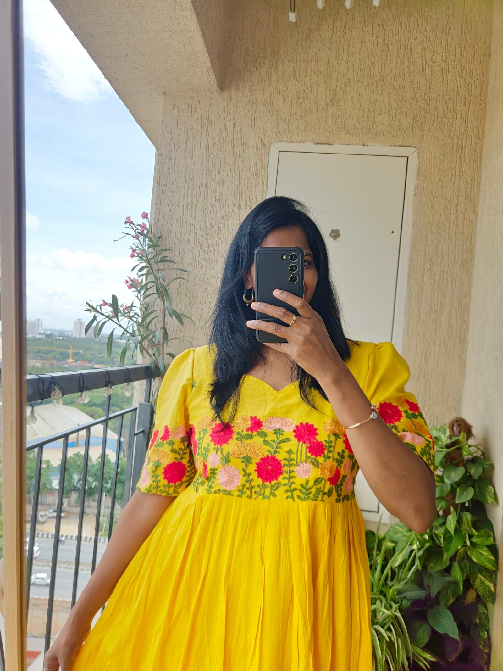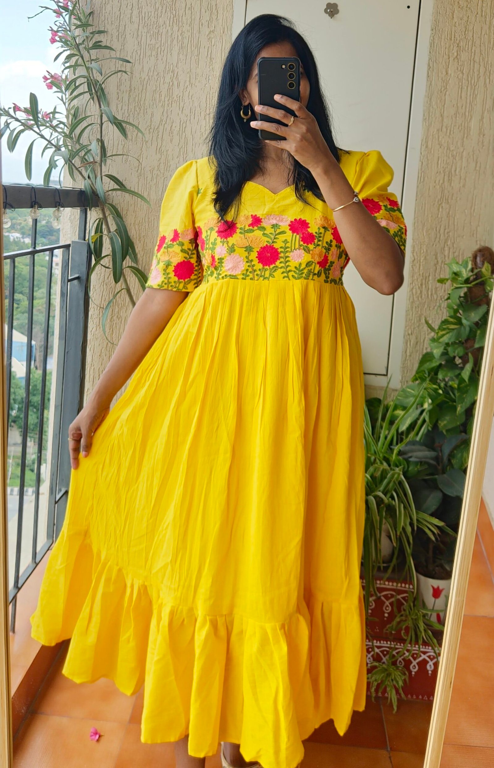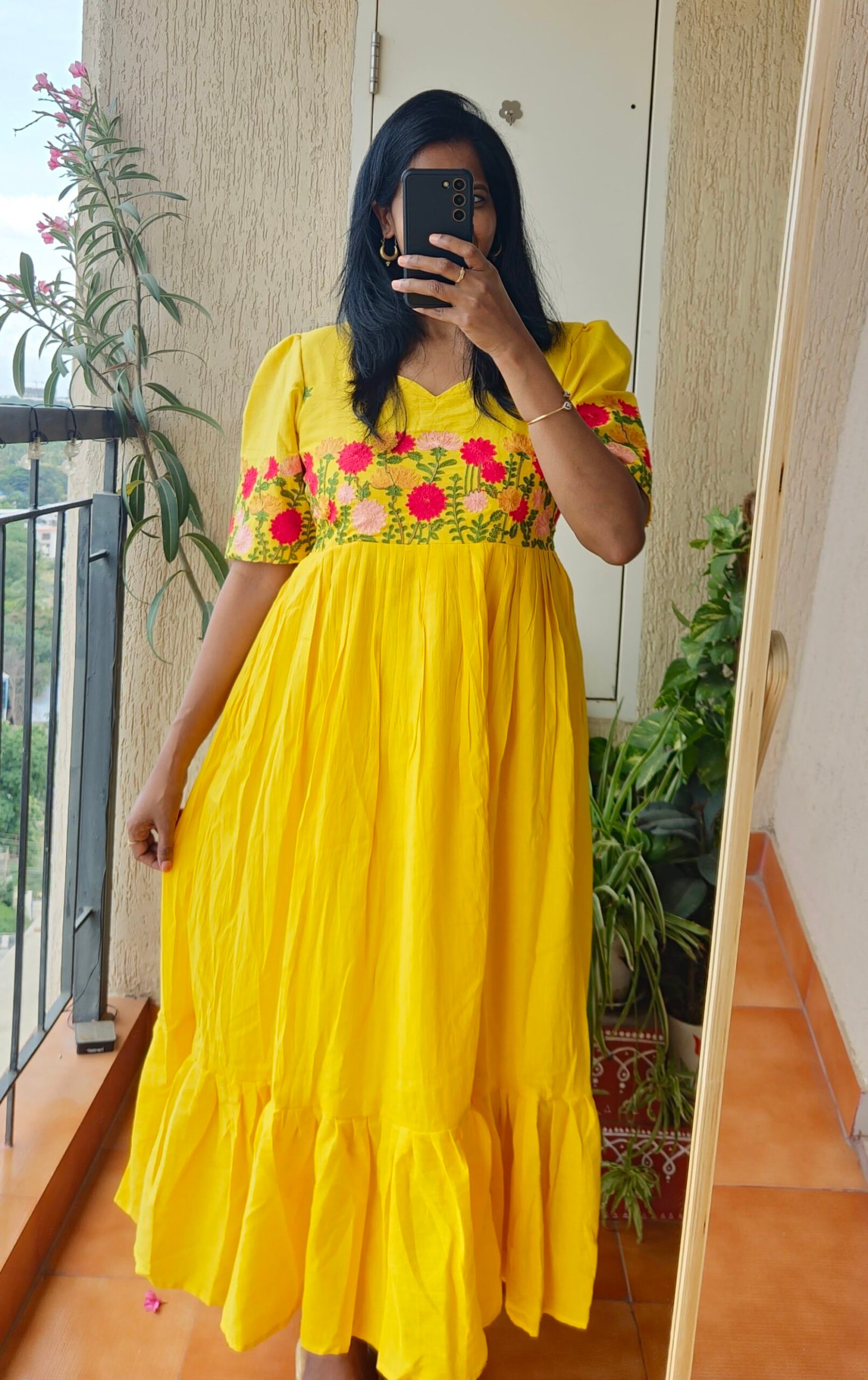 Sunlit yellow premium mul cotton dress with intricated embroidery on yoke and sleeves perfect for any ocassions and any season comes with a full lining. Length of the dress is 49 inches.