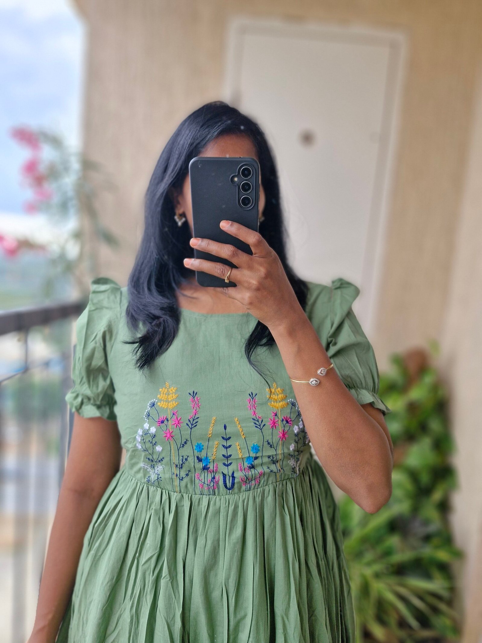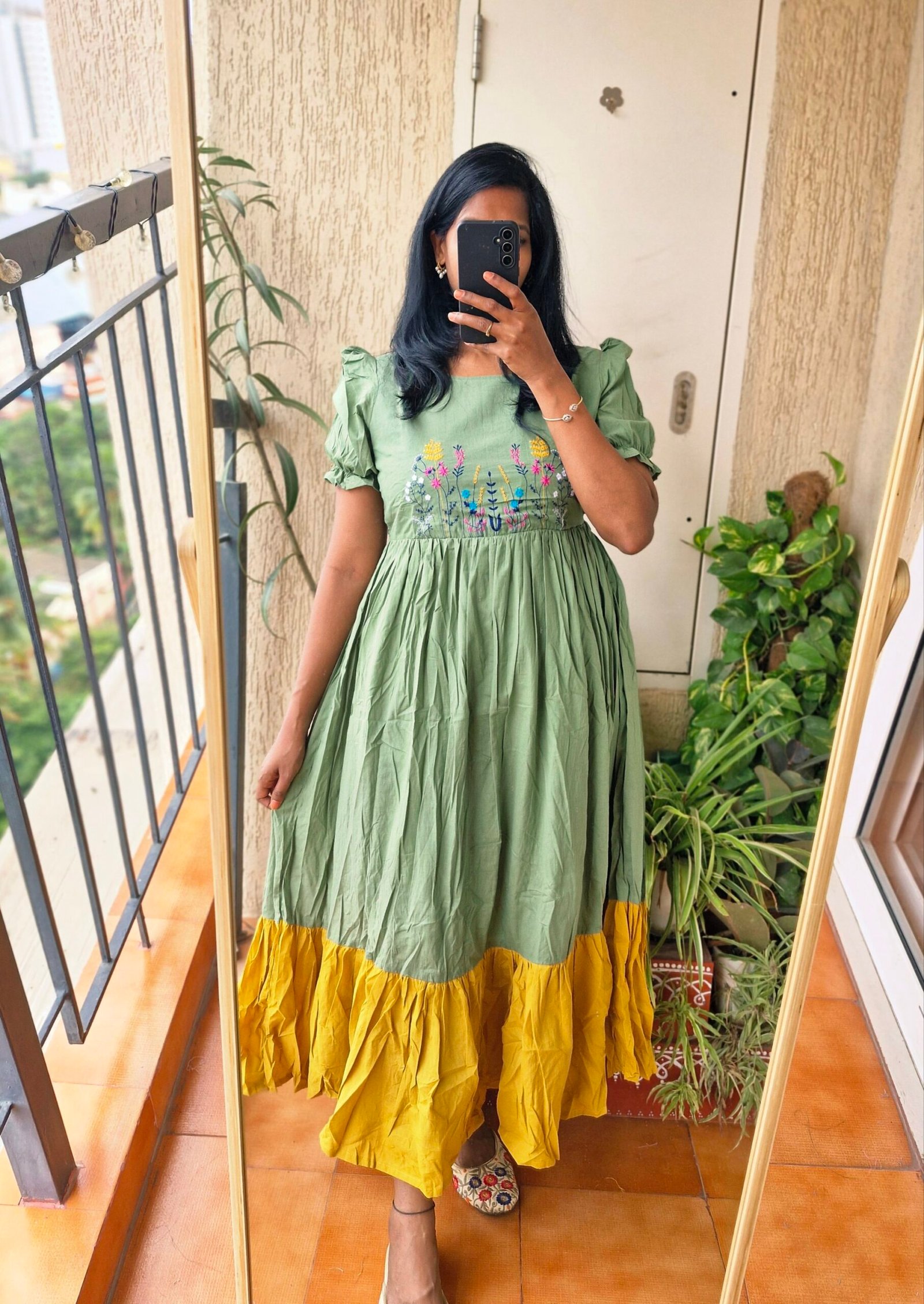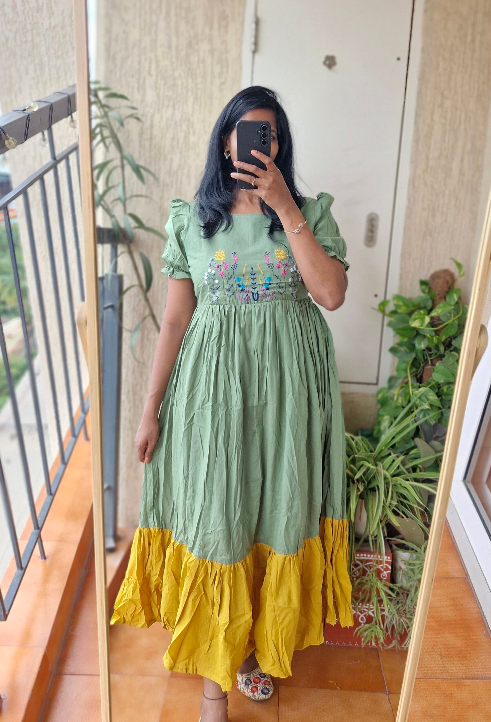 Beautiful olive green and mustard yellow dual shade casual dress comes with a back tieup and full lining inside.Length of the dress is 50 inches.